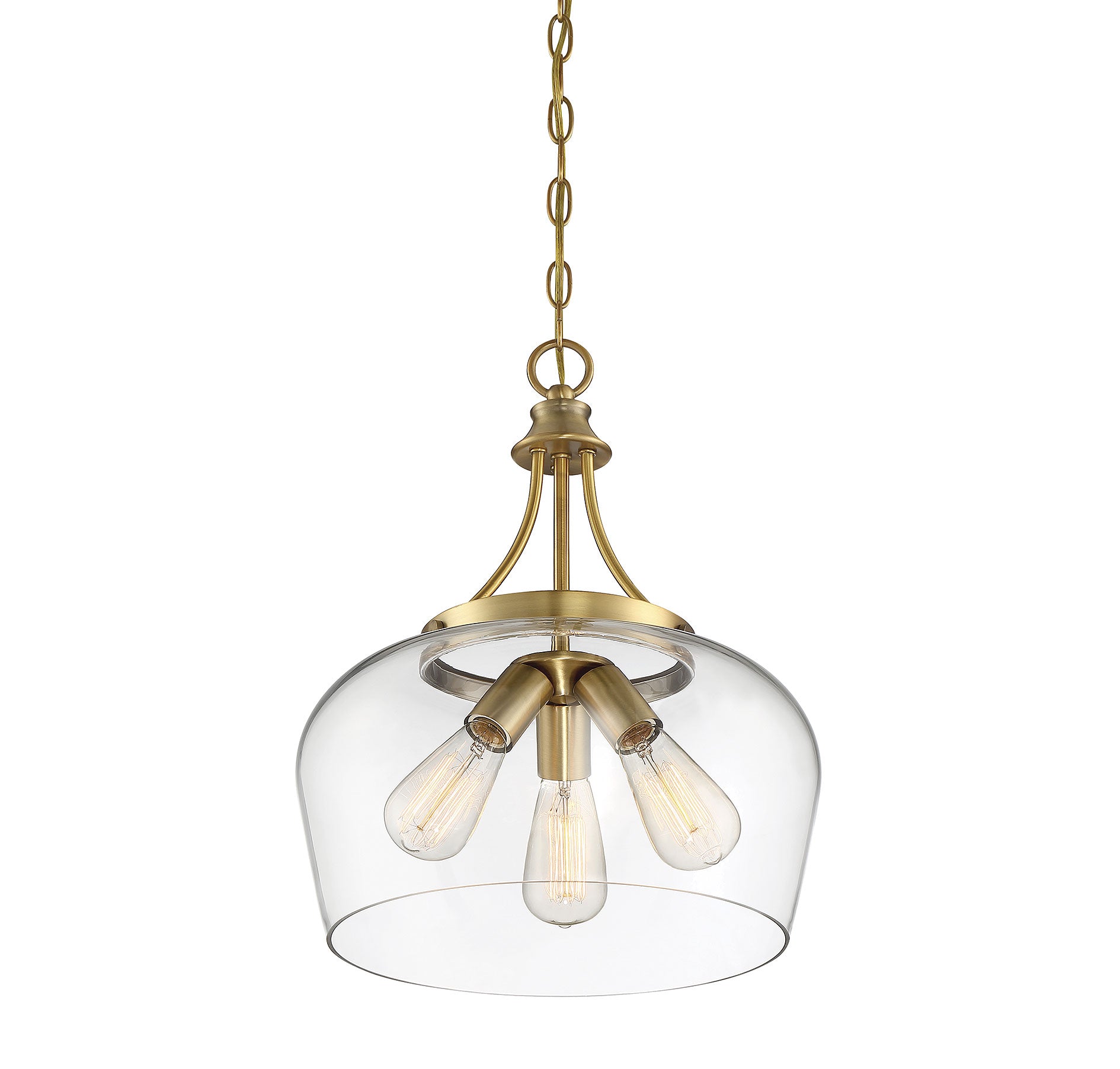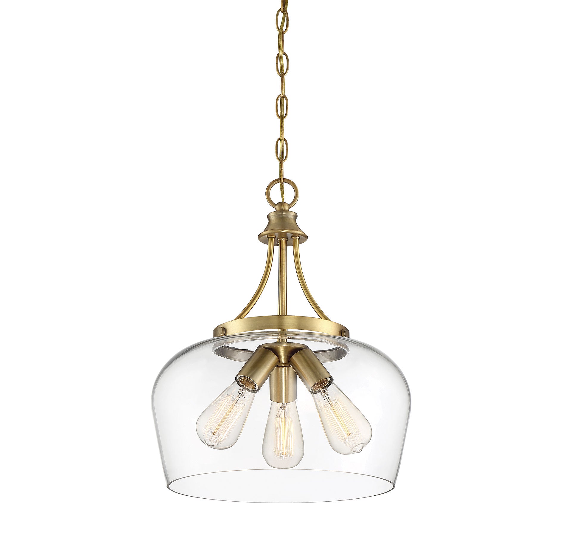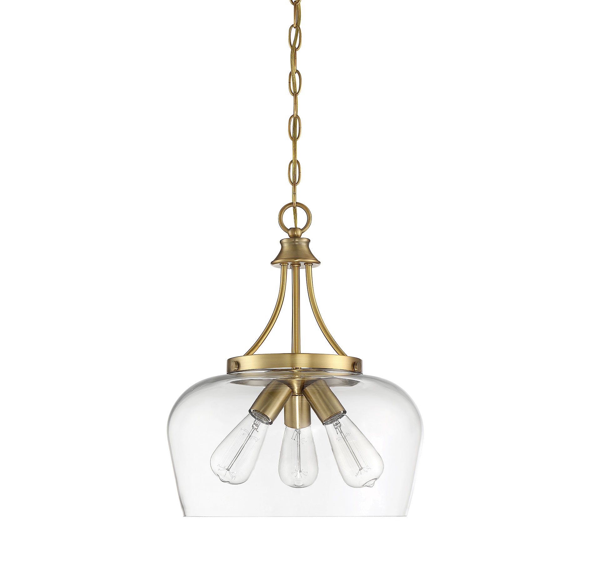 Get a pendant look with understated elegance when you get the new Savoy House Octave 3-light pendant. It features a single large shade of curved clear glass, minimal detailing and a rich warm brass finish. Pendants are extremely versatile and can fit in many different spaces, such as kitchens, family rooms, great rooms, foyers, entryways, offices, bedrooms and bathrooms. Because this pendant is chain-hung, you can use as much or as little chain as you need to fit your specific hanging height needs, and this pendant can be used on a sloped ceiling. Since the bulbs are exposed, try using stylized bulbs (not included) like Edison style for a different twist! The fashionable warm brass finish can be paired with brass hardware or mixed with hardware in other finishes. Try the Octave with glam, transitional or contemporary style rooms for a chic look. When you choose a Savoy House lighting fixture, you can be certain you've selected a piece that will withstand the test of time.