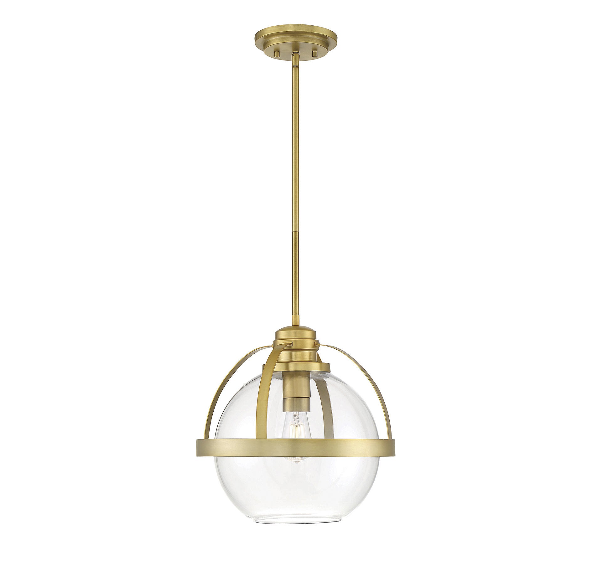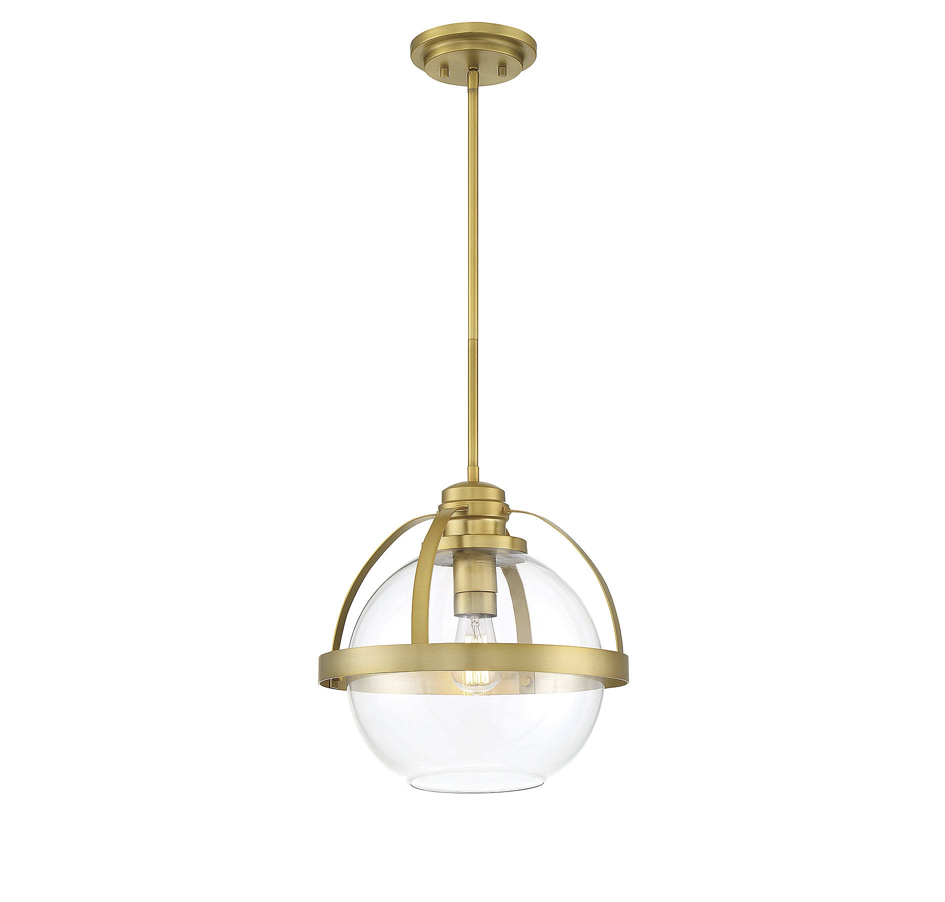 This Savoy House Pendleton 1-light pendant is a smart way to pep up the illumination and style in any room. It showcases a large orb of clear glass that is open at the bottom, allowing for more direct light and making it easy to replace the bulb. Metal bands bisect the shade and help hold it to the fixture’s base. Try using this fixture in kitchens, foyers, bedrooms and home offices, though truly the possibilities are endless. Finished in warm brass. This fixture is 14" wide and has an adjustable height that ranges from 23.5" to 42.5". Uses a standard size bulb of up to 60 watts (not included).