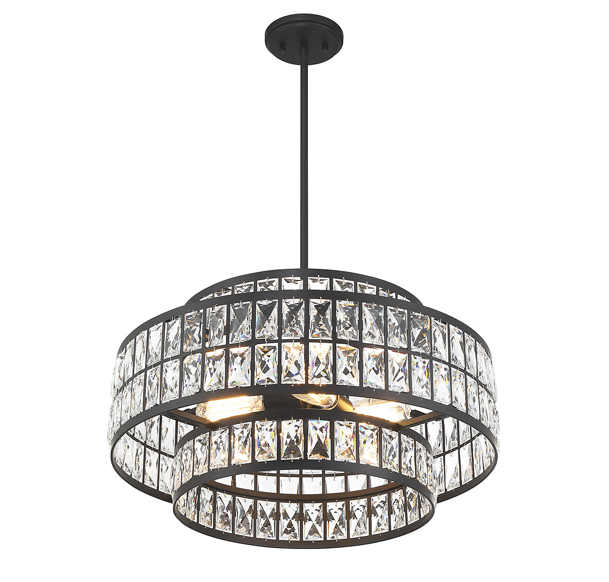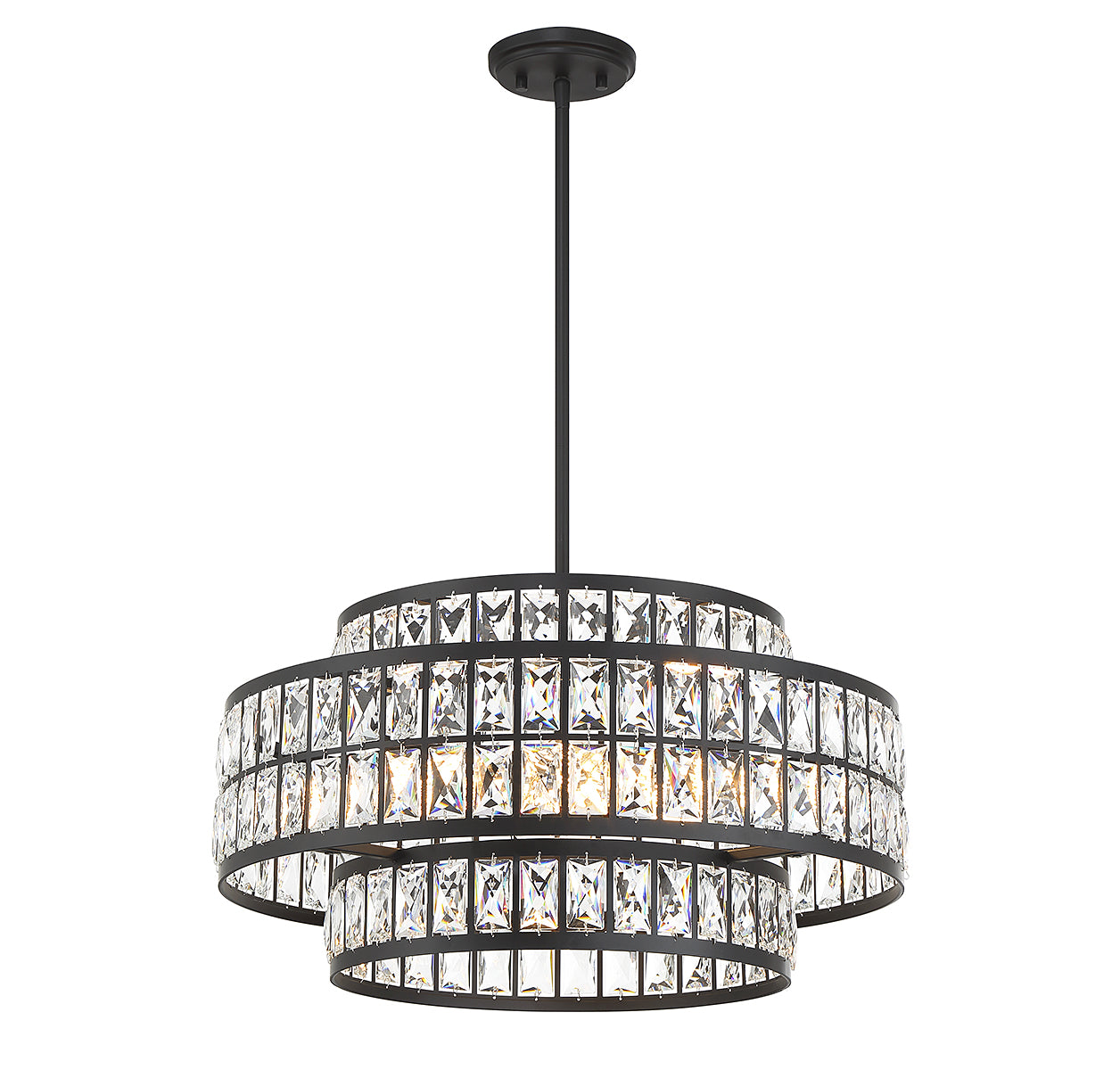 It is often said that lighting is the jewelry of the home and the Savoy House Renzo 4-light pendant is a perfect example of this saying. Faceted clear crystal decorates the two layers of shades, which overlap in an intriguing way and are finished in matte black. Renzo is 22" in width and has an adjustable height ranging from 12.5" to 66". Comes with four 12" downrods and one 6" downrod. It uses 4 standard size bulbs of up to 60 watts per bulb (bulbs not included).