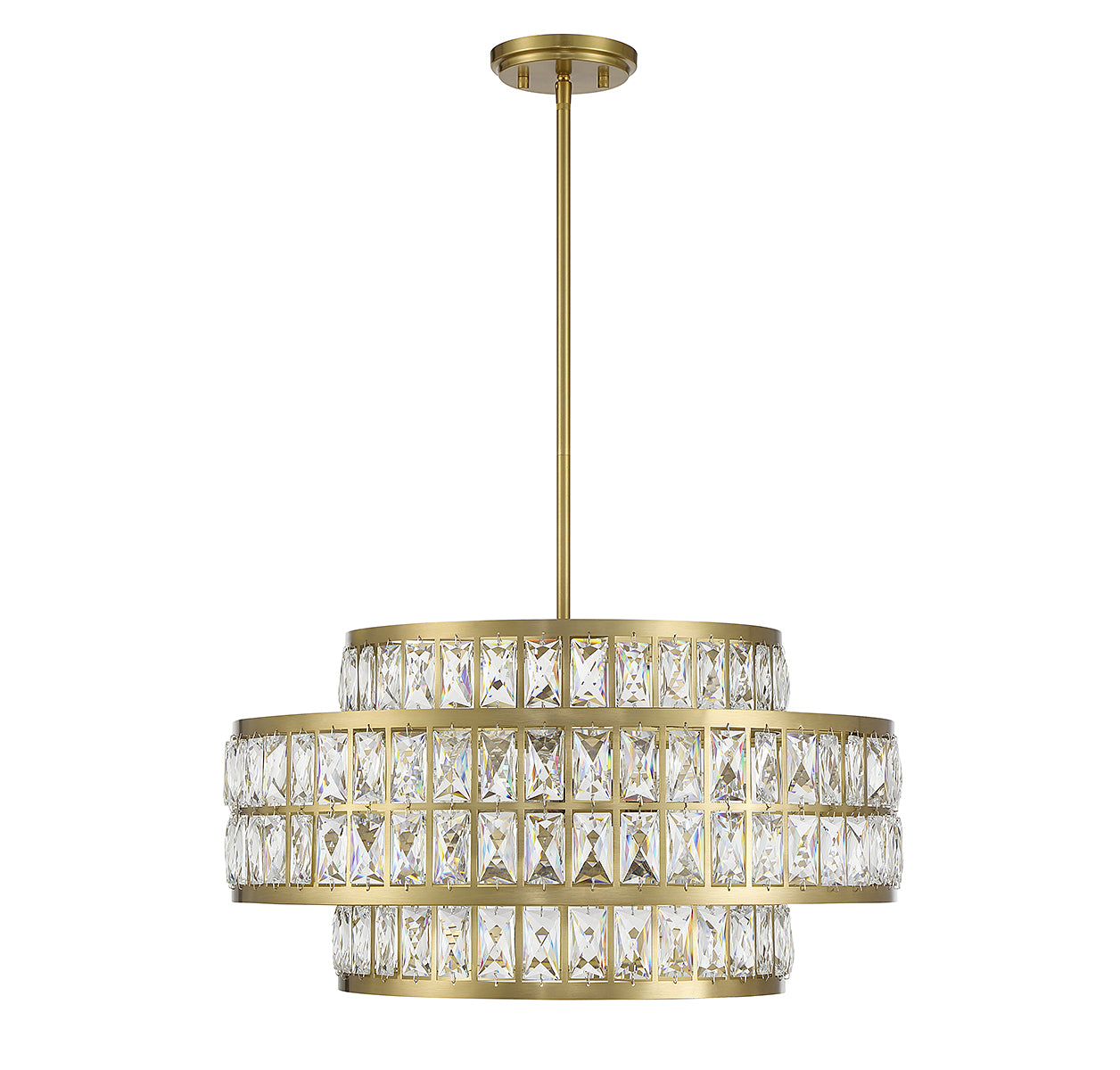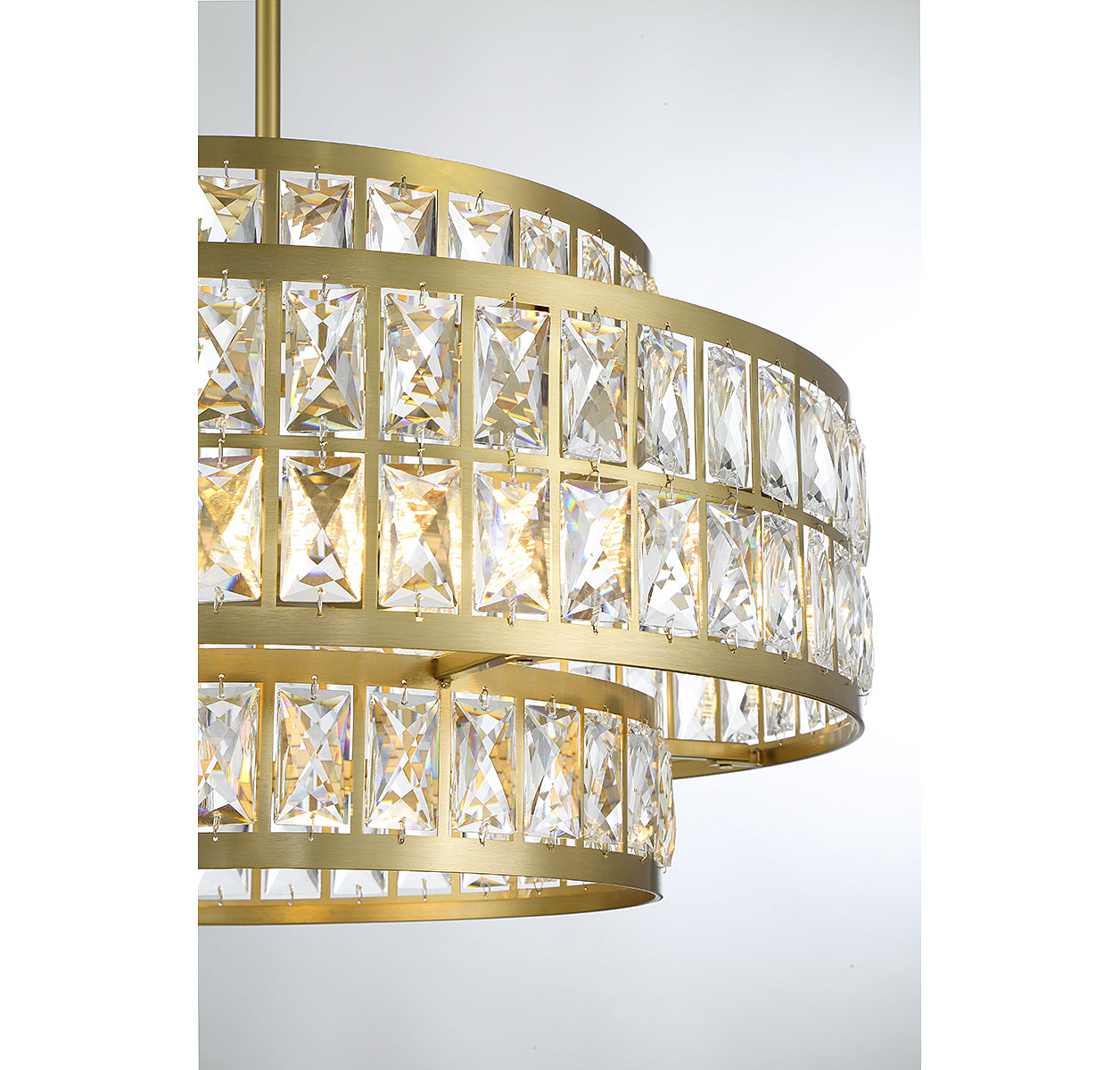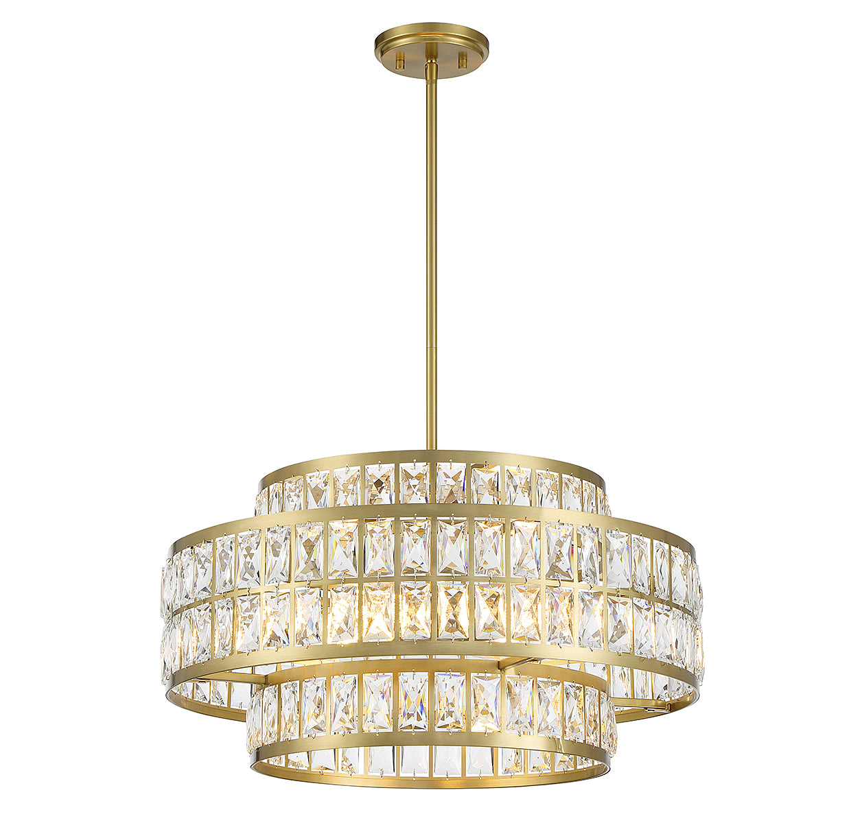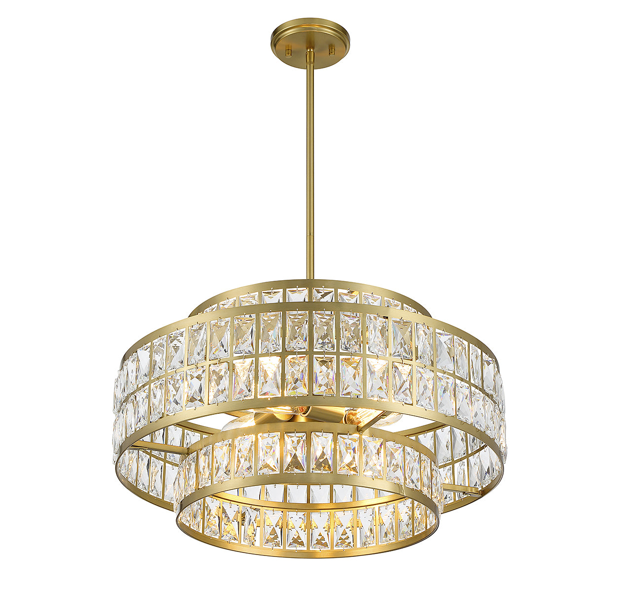 It is often said that lighting is the jewelry of the home and the Savoy House Renzo 4-light pendant is a perfect example of this saying. Faceted clear crystal decorates the two layers of shades, which overlap in an intriguing way and are finished in warm brass. Renzo is 22" in width and has an adjustable height ranging from 12.5" to 66". Comes with four 12" downrods and one 6" downrod. It uses 4 standard size bulbs of up to 60 watts per bulb (bulbs not included).