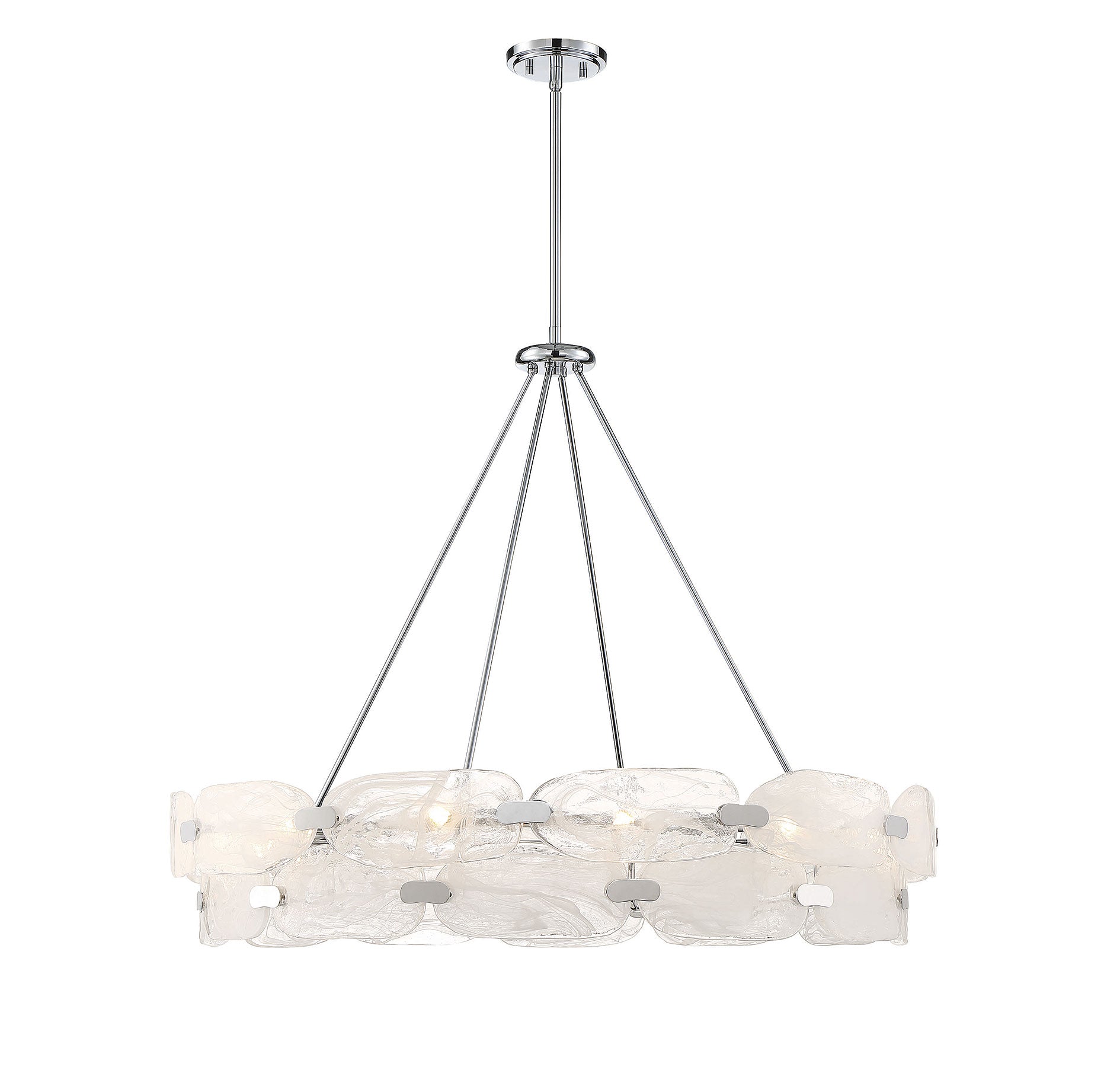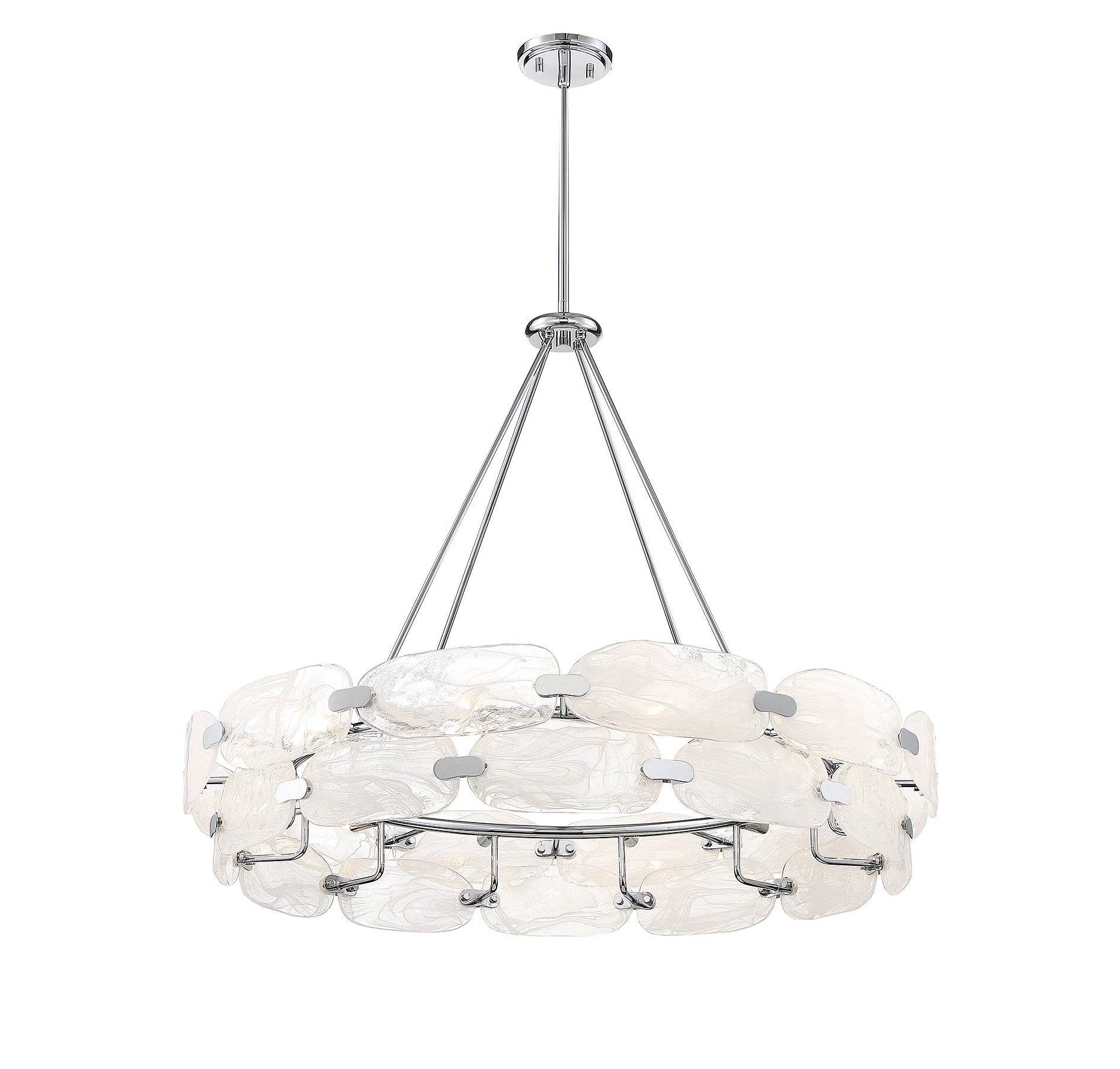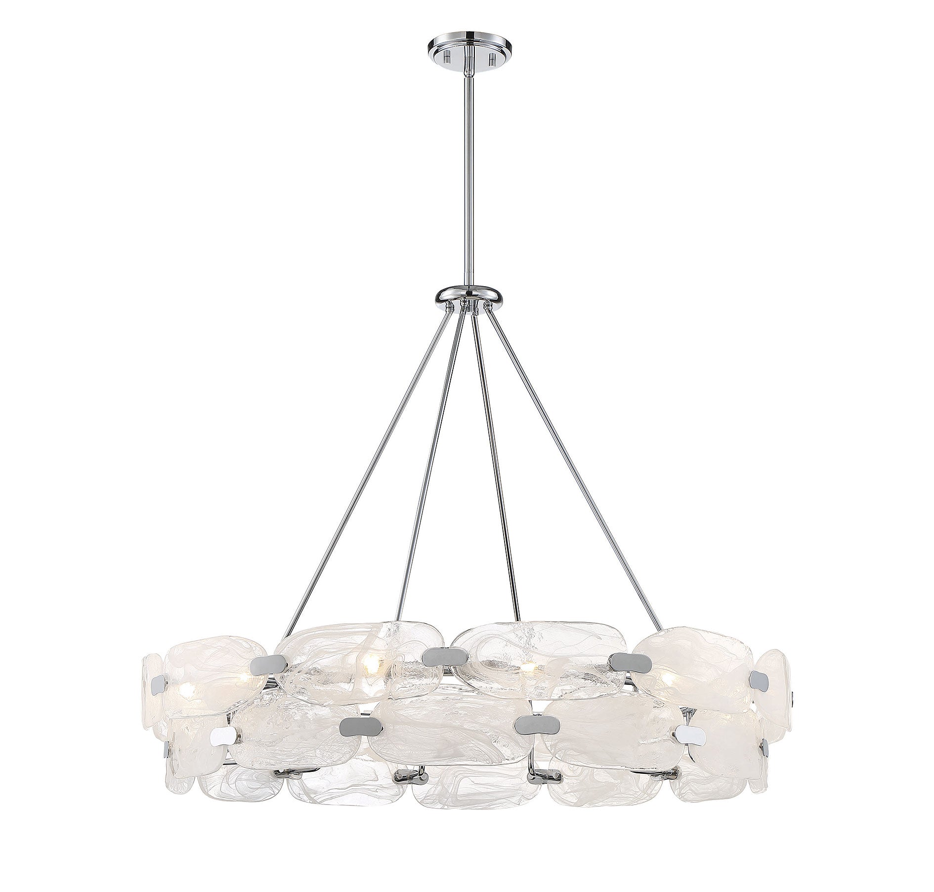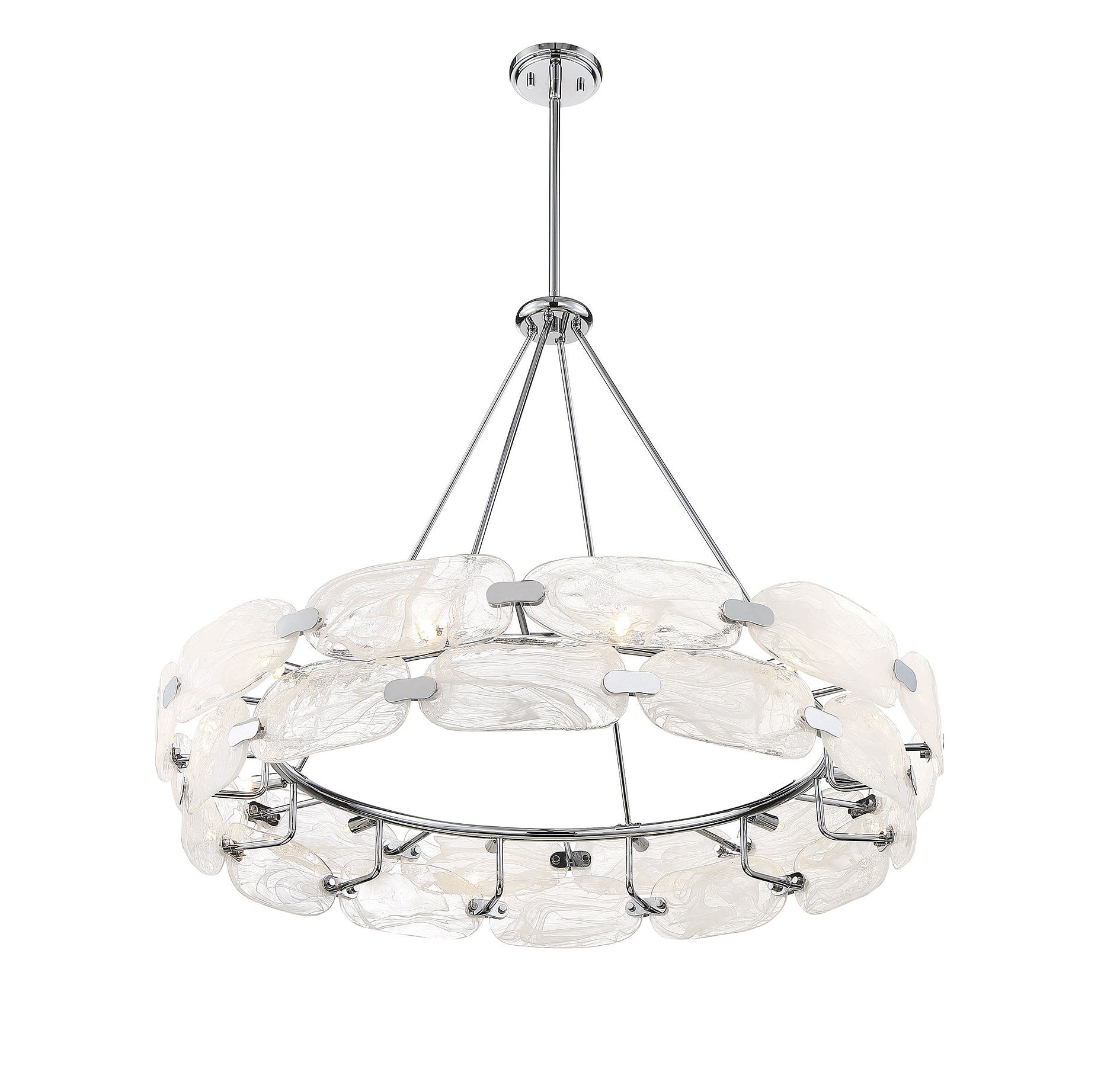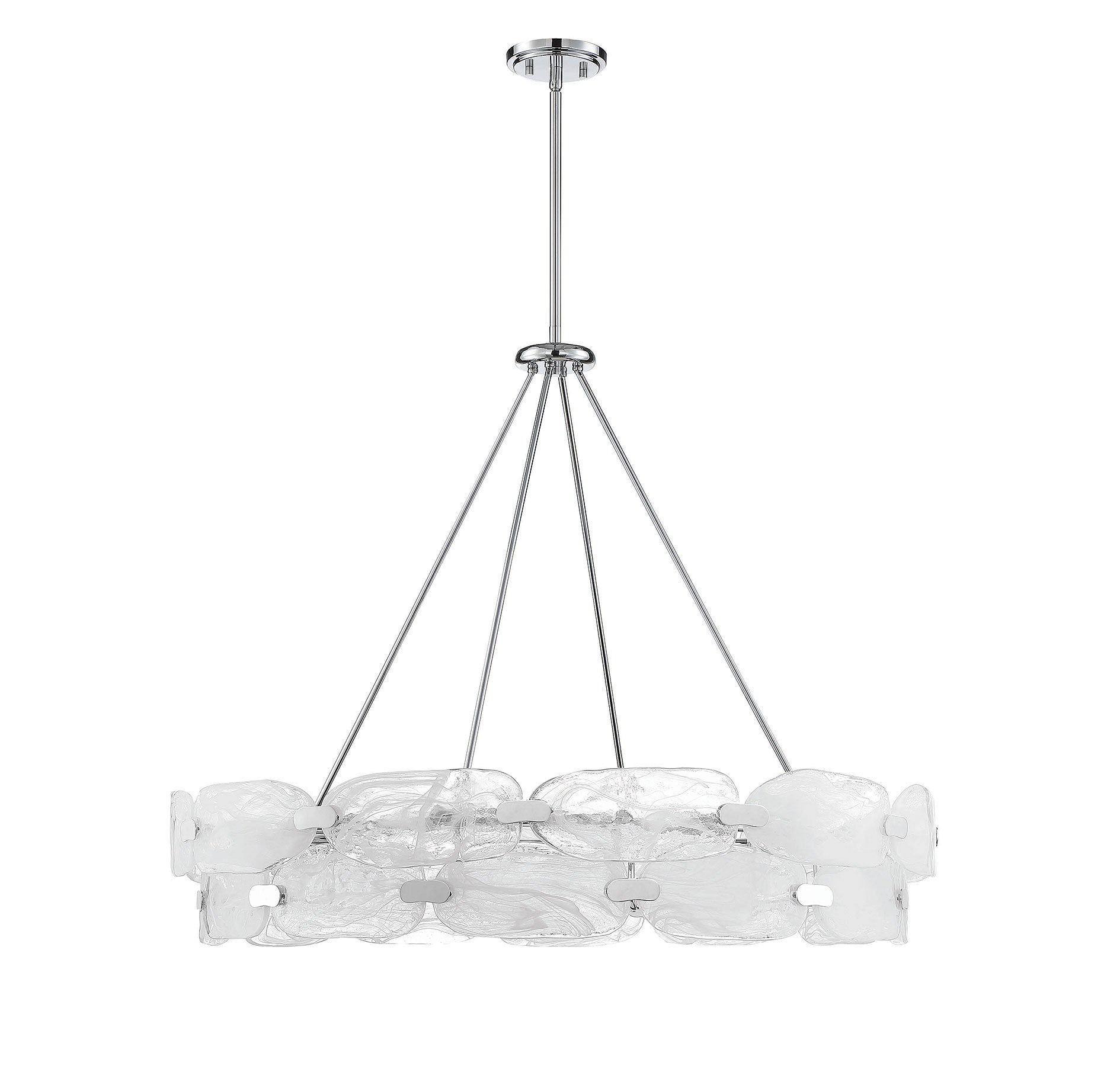 For a truly beautiful and unique lighting look, consider bringing in the Vasare 12-light pendant from Savoy House. Its sleek, contemporary circular shape flaunts a ring of hand-made marble glass, each pane showcasing totally unique swirls, united by a simple structure that is finished in chrome. It is often said that lighting is the jewelry of the home and Vasare, with its stunning glass and metal clasps, is a perfect example of this saying! Great for use in a wide variety of spaces, such as kitchens, living rooms and even entryways. This fixture is 38" in width and has an adjustable height that ranges from 37" to 83".