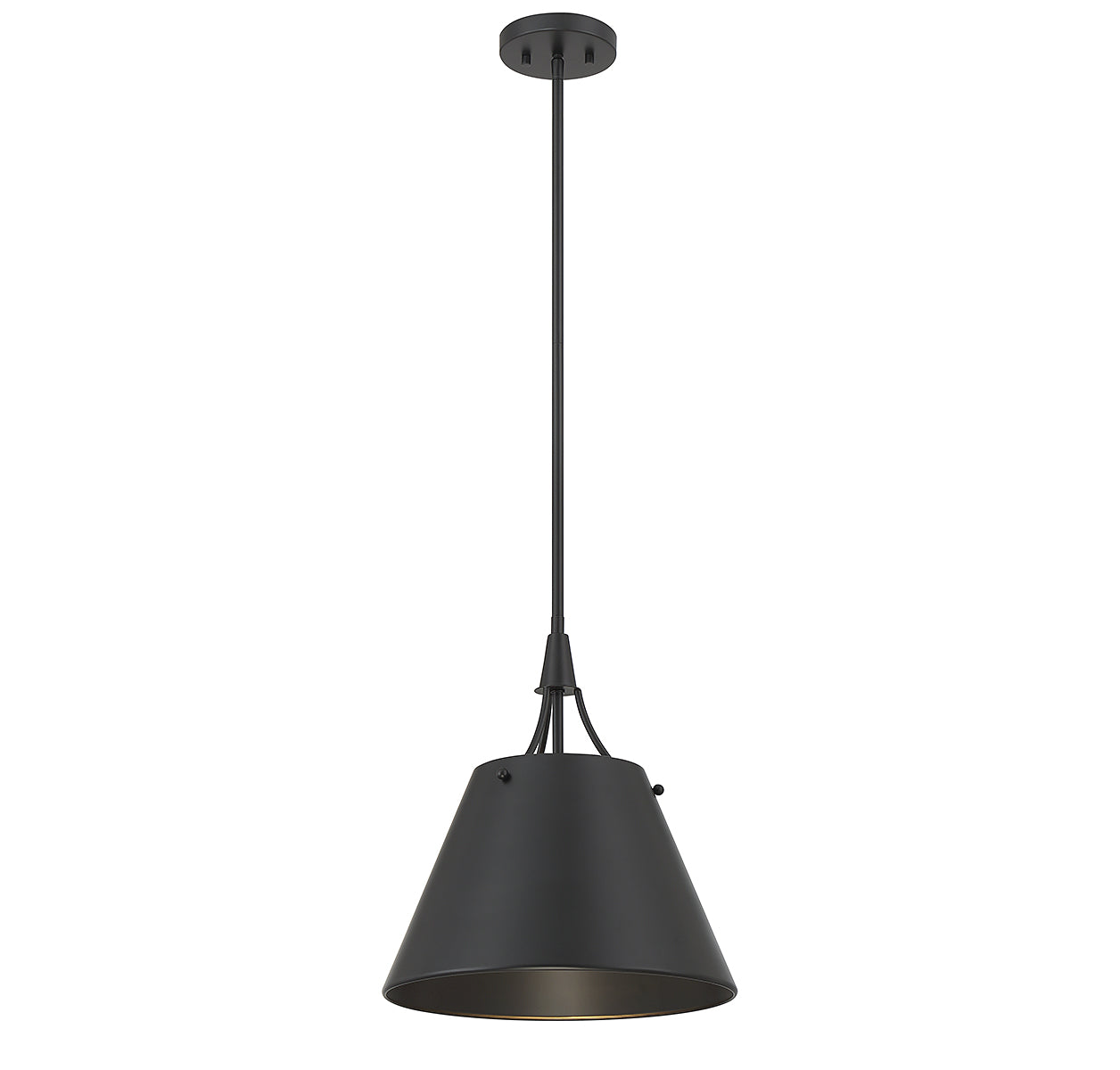 The Savoy House Willis 1-light pendant has an elegant look with a solid metal shade finished in matte black. Perfect for use solo or in groupings! Willis is 14" in width and has an adjustable height ranging from 16" to 69.5". Comes with four 12" downrods and one 6" downrod. It uses 1 standard size bulb with a max of 60 watts (bulb not included).