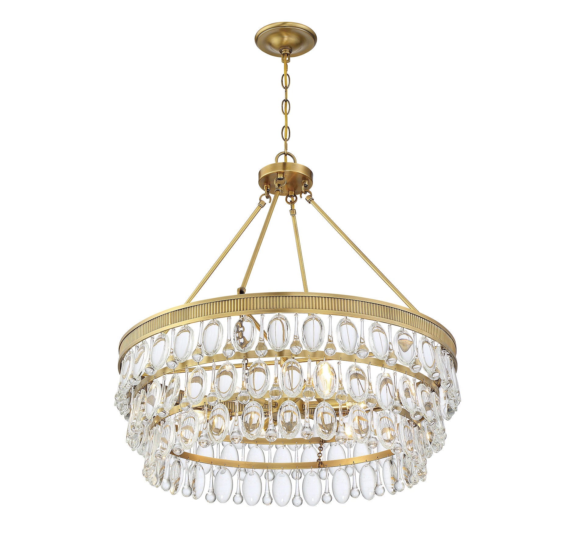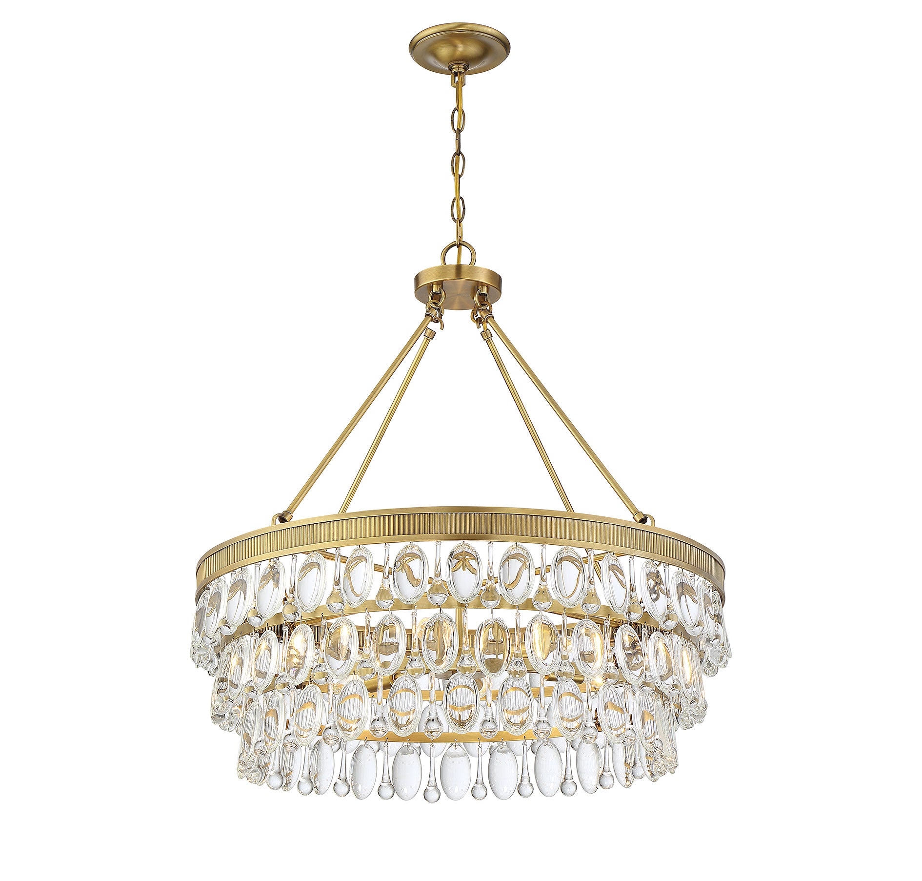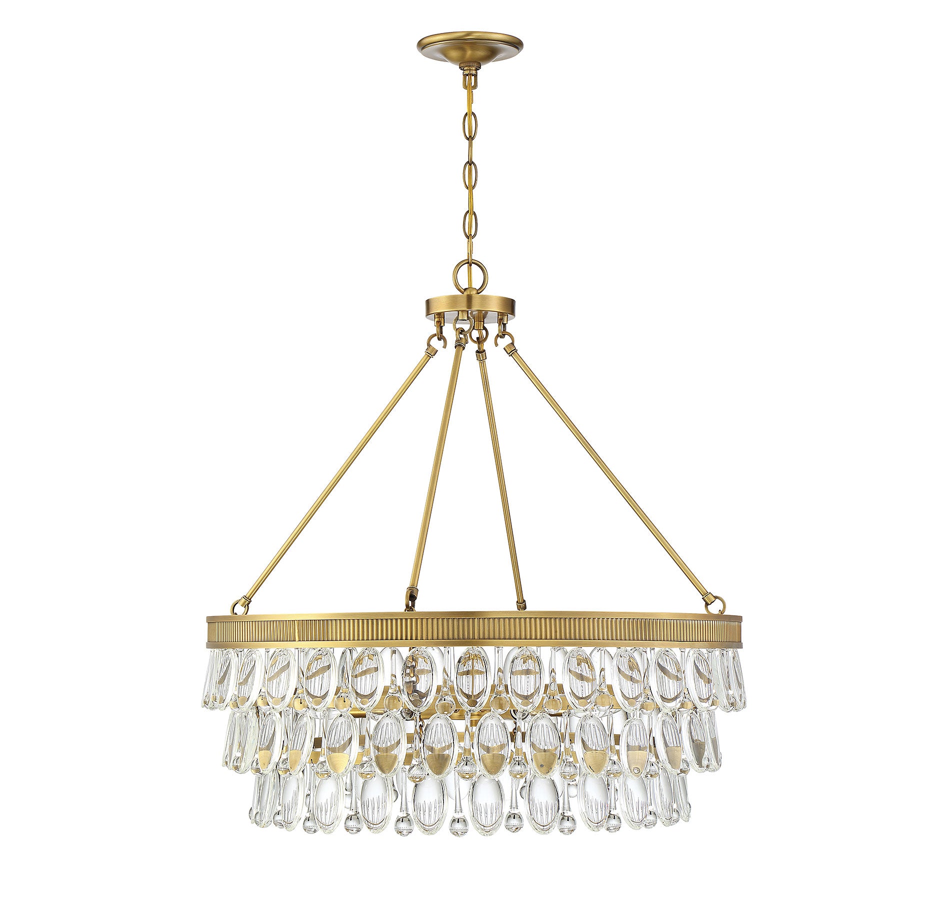 The Savoy House Windham 6-light pendant is a glamorous, modern look that brings a touch of luxury and elegance to your home. The circular frame, finished in warm brass, holds three descending tiers of gorgeous clear crystals in alternating oval and teardrop shapes that add wonderful texture and sparkle. Six 60-watt candelabra size bulbs provide beautiful illumination for your glam, contemporary or transitional decor style. The pendant is 28" wide and 28" high, creating a perfect fit for your dining area, living room, foyer, great room, bedroom, stairway, kitchen or family room.