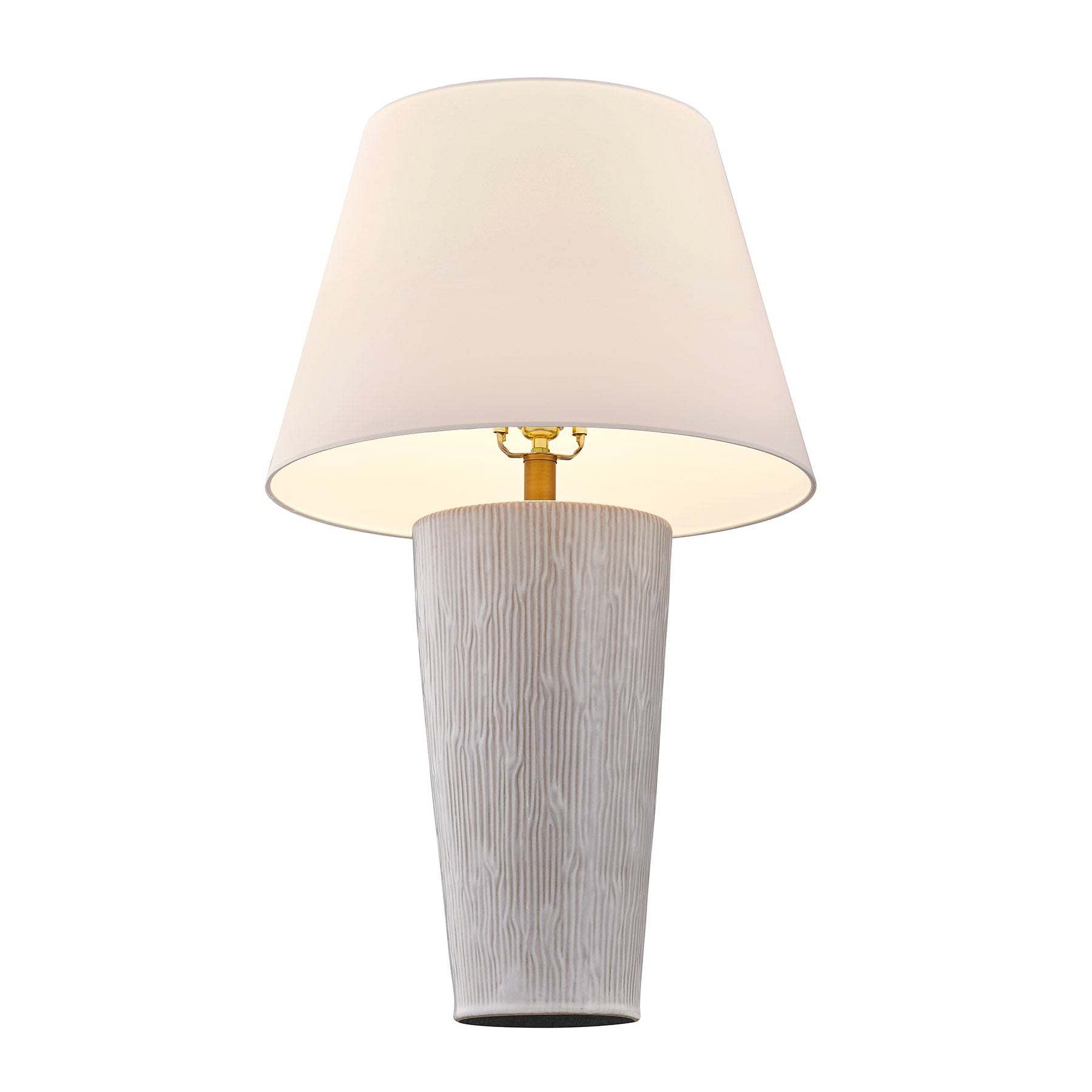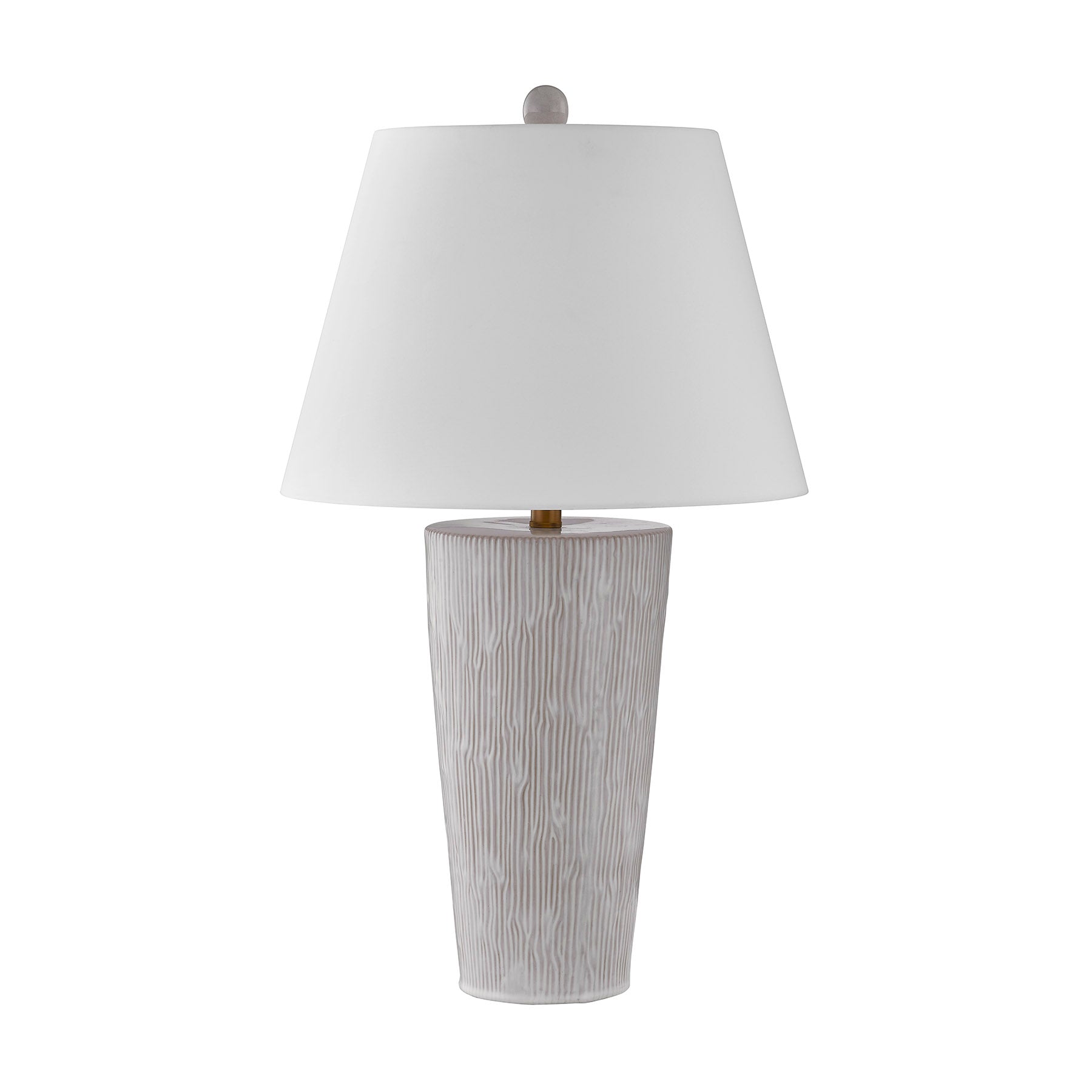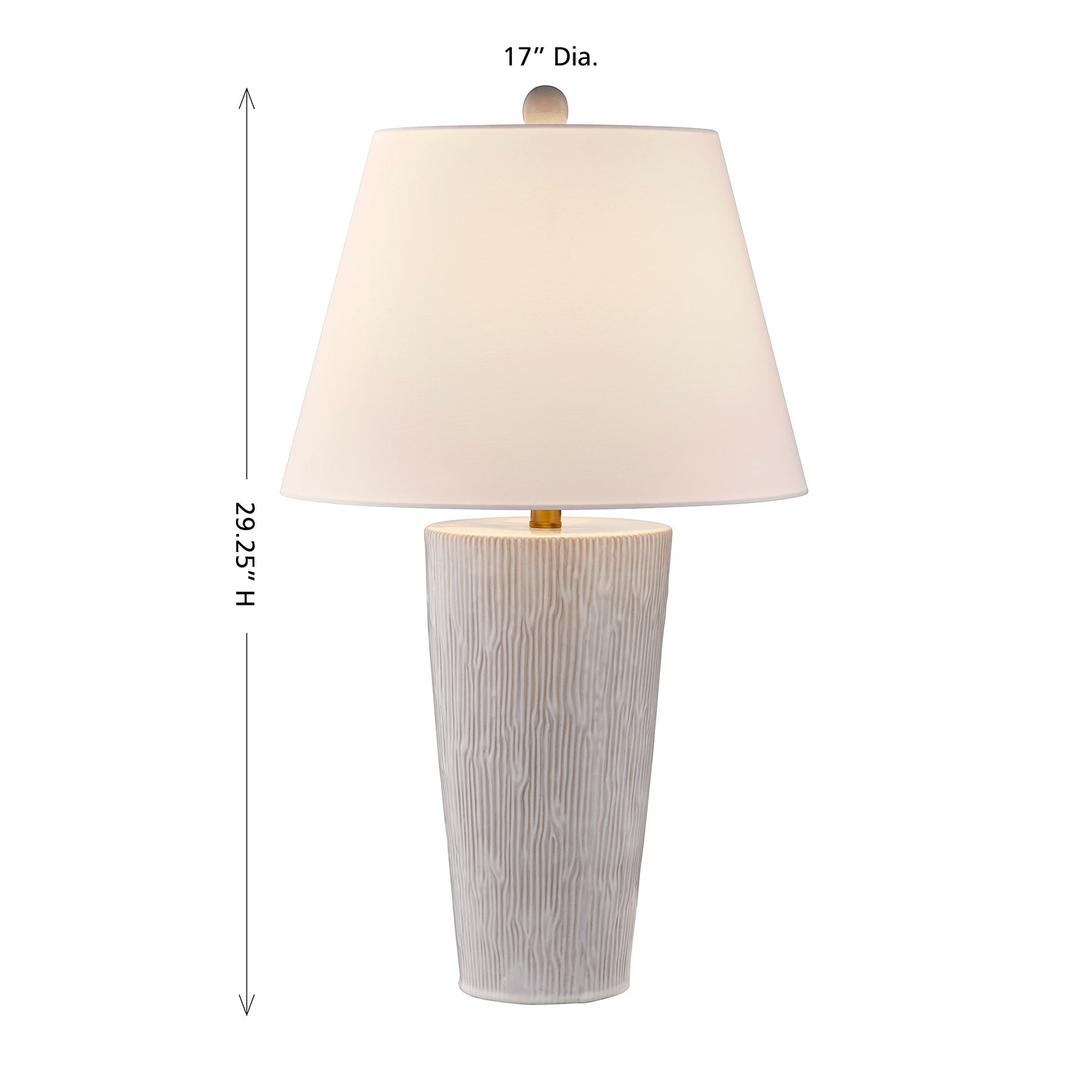 With the James table lamp by Coco & Dash, get a classic table lamp look with a fresh modern twist. An urn-style column is rendered in ceramic, offering up an earthy flair that works beautifully with the white fabric shade and plated brass detailing. This lamp is 29.25" in height and 17" in width. It uses one standard size bulb of up to 100 watts. Bulb not included.