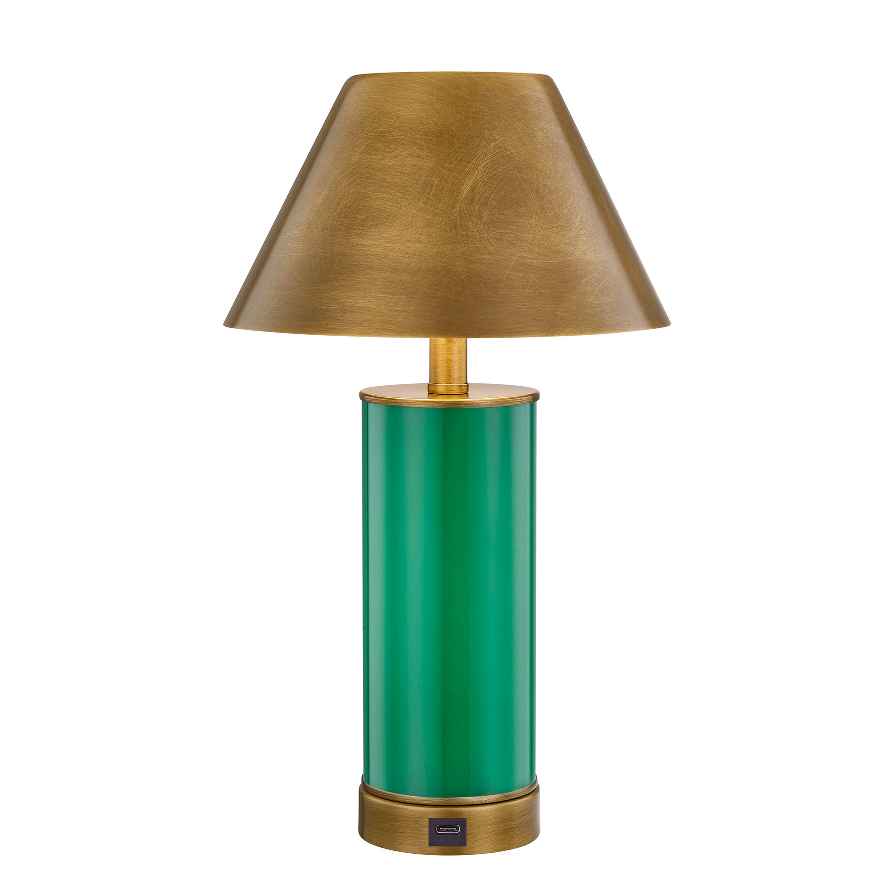 This chic Molly table lamp from Coco & Dash is portable and rechargeable, giving you a glow that can go anywhere! A plated brass shade adds classic charm, and the integrated LED light source brings bright, crisp illumination. Tap directly on the top center of the shade to switch the light on or off. Finished in candy-colored Jolly Green. This lamp is 12" in height and 7" in width. It gives off 240 lumens at a 3000K color temperature.