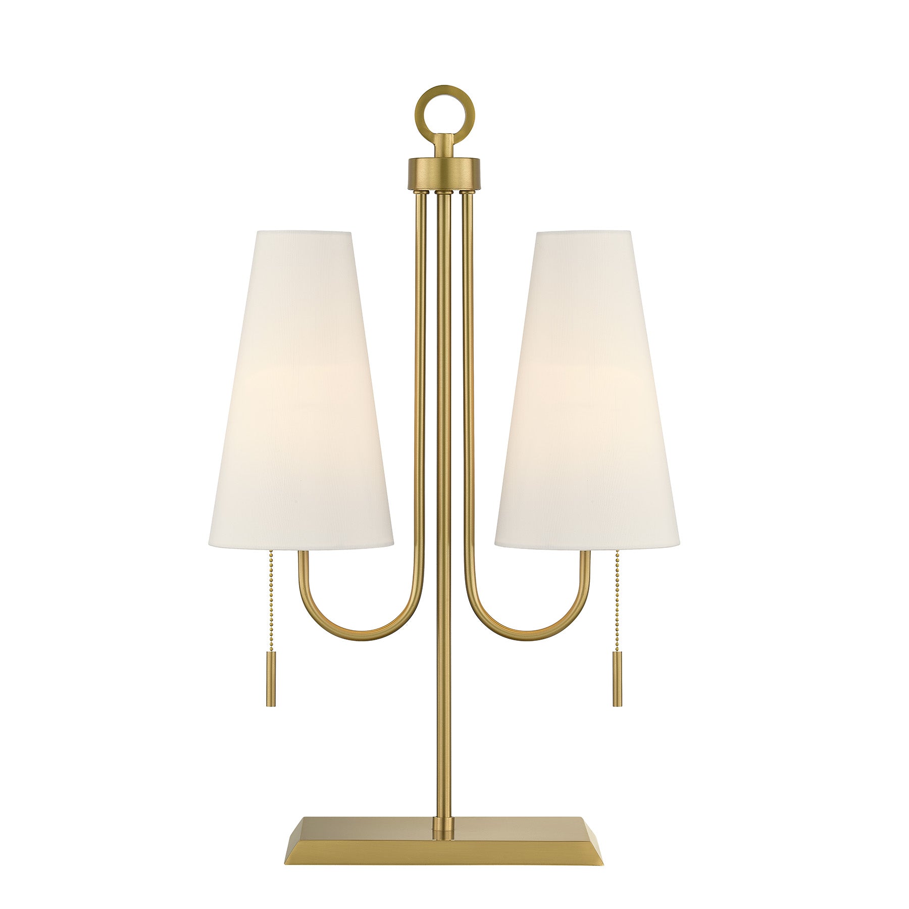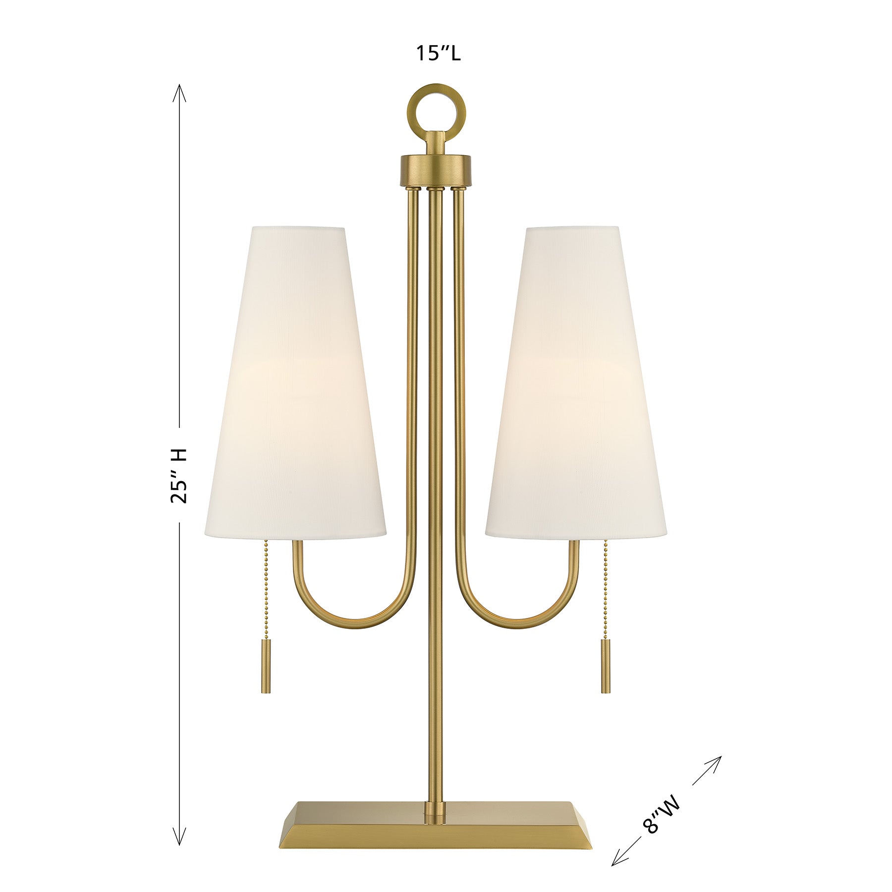 The Savoy House Wilkes 2-light table lamp, designed by award-winning interior designer Dann Foley, brings stately charm to desks, consoles, and bedside tables. Slim Warm Brass arms hold conical white fabric shades while dual pull chains add a touch of classic refinement. Wilkes is 25" in height, 15" in length and 8" in width. It uses two standard size bulbs of up to 60 watts per bulb. Bulbs not included.