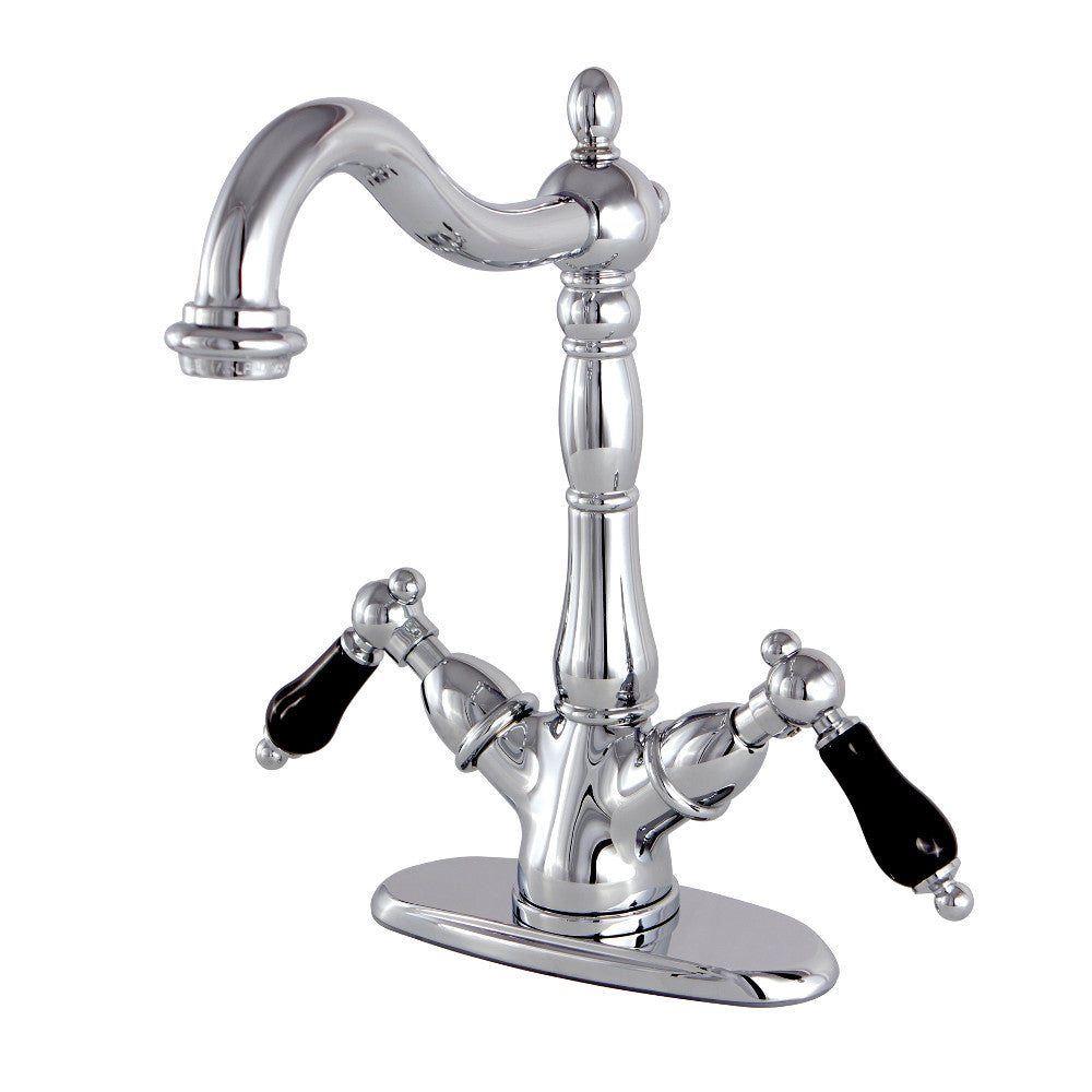 Crafted in commendations to English nobility, the exemplary design of this faucet manifests regality and elegance with its black porcelain handles. Kingston Brass vessel sink faucets perfectly complement the exquisite artistry of vessel sinks. Designed to handle the extra clearance needed for pairing with a vessel sink, this faucet boasts 8-1/4 inch of spout clearance. The Duchess Vessel Sink Faucet and its featured sturdy brass construction and premium polished chrome finish are guaranteed to glamorize your home's traditional ensemble for years to come. Glamorize your home today with the traditional elegance of this faucet.