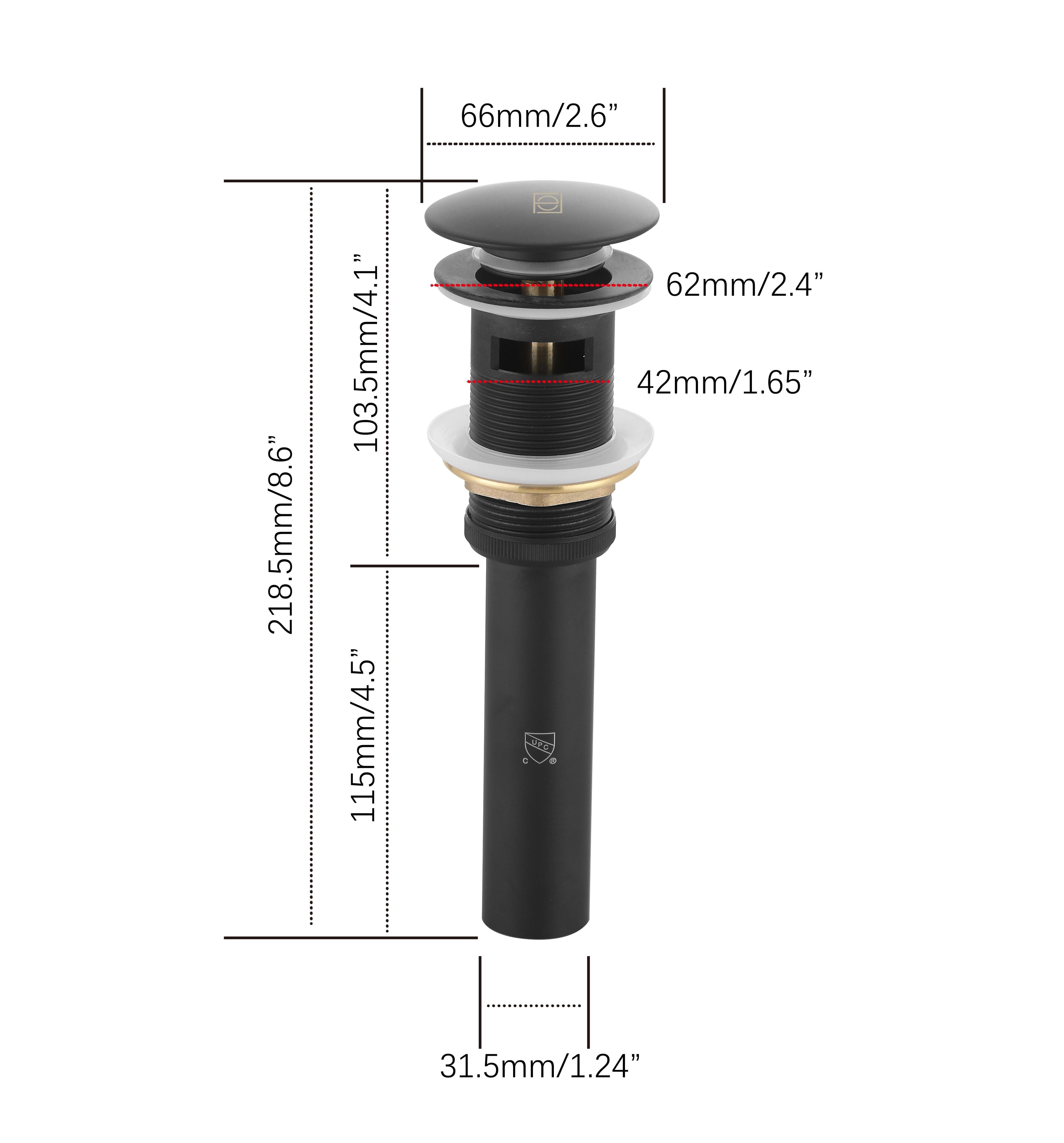 Upgrade your bathroom with our Pop-Up Drainer with Overflow Hole, designed to combine functionality, durability, and style. Available in four stunning finishes - Brushed Gold, Polished Chrome, Brushed Nickel, and Matte Black - this drainer seamlessly complements any bathroom vanity sink with an overflow. Constructed from a premium blend of plastic, stainless steel, and solid brass, this drainer ensures exceptional durability and meets cUPC certification standards for top-tier quality. Designed for ease of use, the pop-up drainer features a simple push-button mechanism, allowing you to seal and release with a single press. Finished to resist rust and corrosion, this drainer maintains its pristine appearance and reliable performance over time. Enhance your bathroom’s functionality and aesthetic with this durable pop-up drainer.