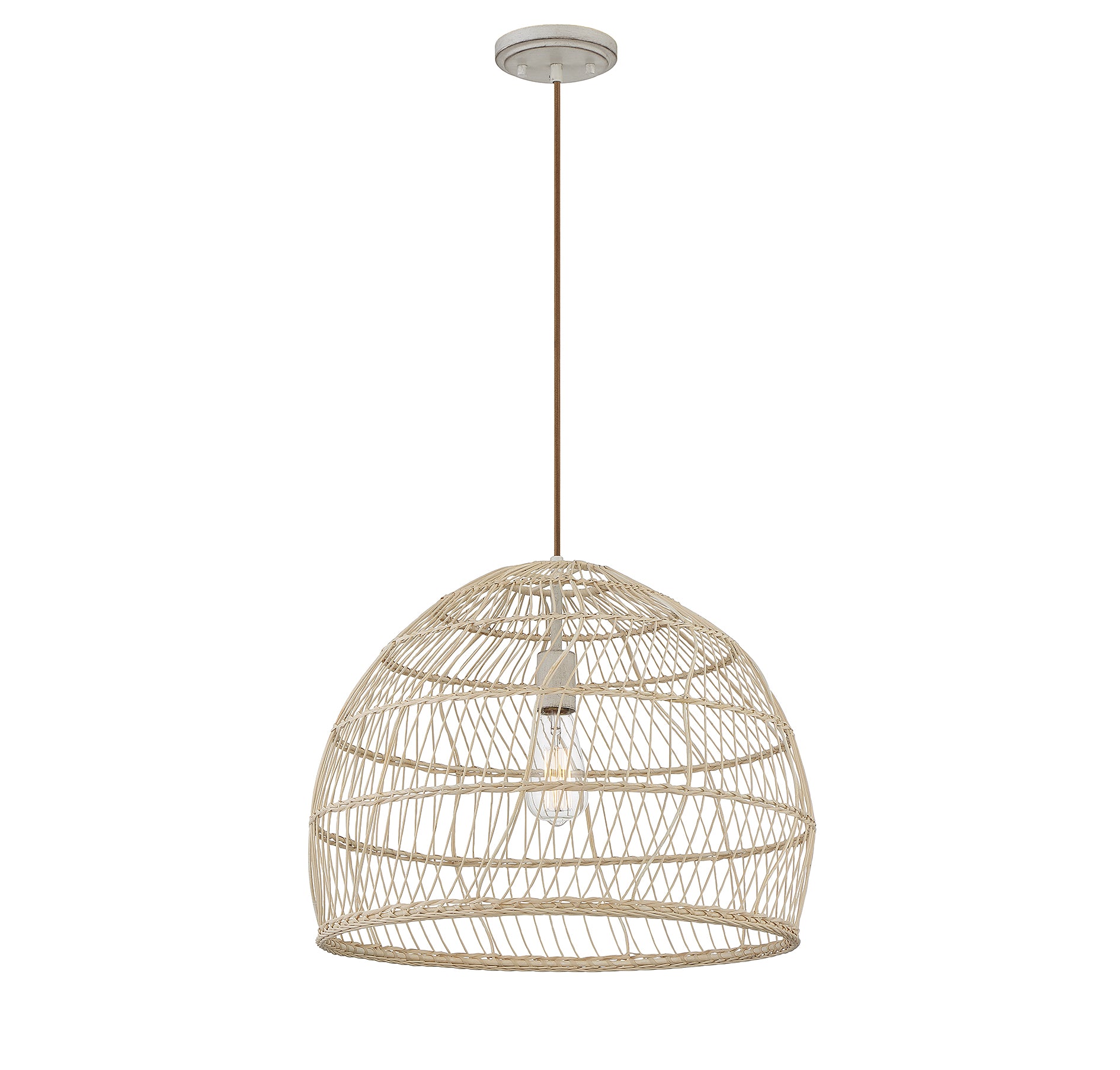 Bring a nature-inspired lighting look to your home with this 1-light pendant from Meridian. It showcases a dome-shaped, basket-inspired shade of natural rattan for an intriguing and highly textured look. The light and the matching socket shine through this shade, bringing in tone-on-tone appeal. It is great for brightening up rooms with bohemian, farmhouse and rustic decor styles. This pendant is 16" in height and 20" in width, plus it comes with 120" of cord to let you adjust the hanging height. This pendant uses 1 standard size bulb of up to 60 watts, is LED compatible and is dimmable.