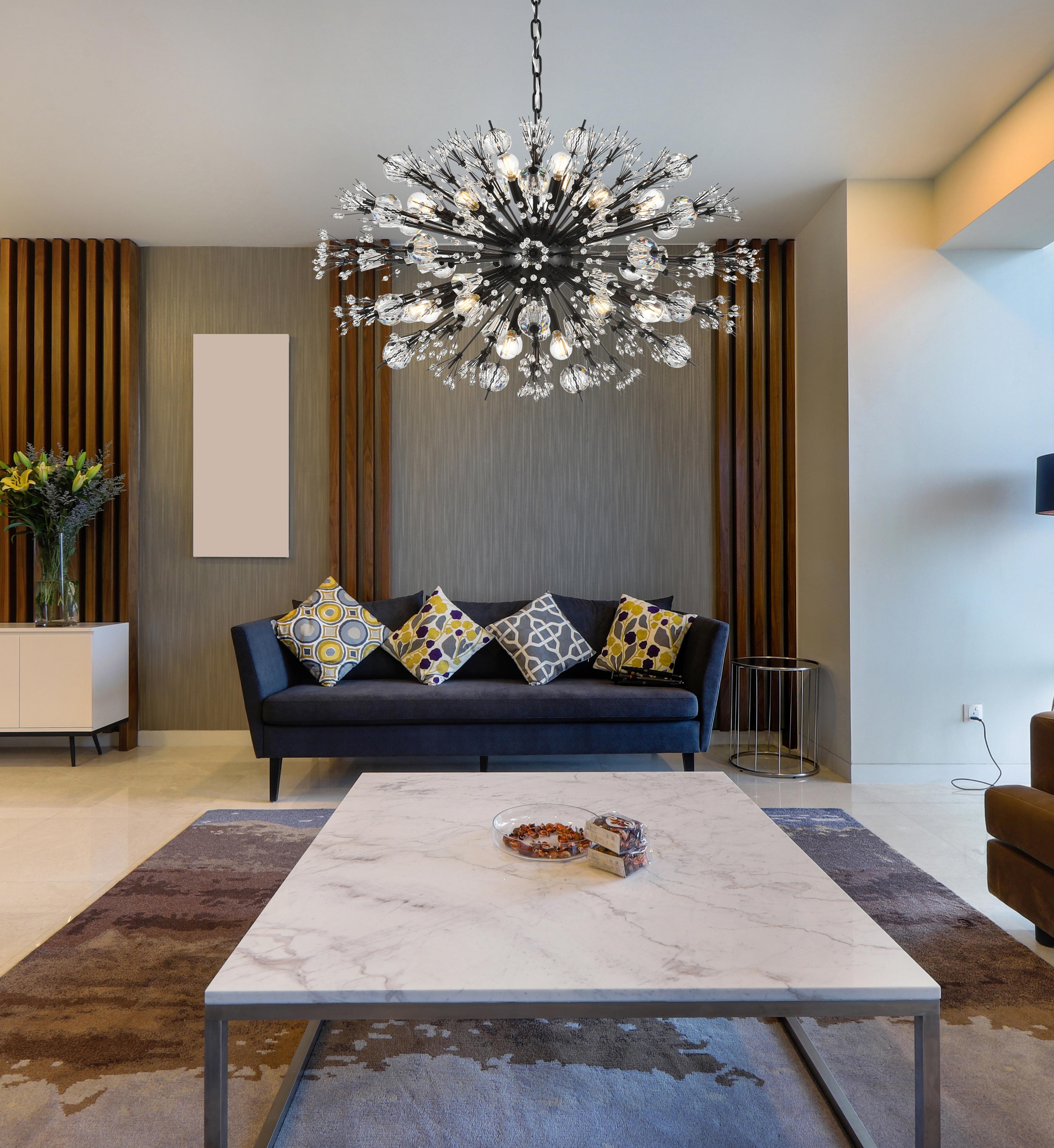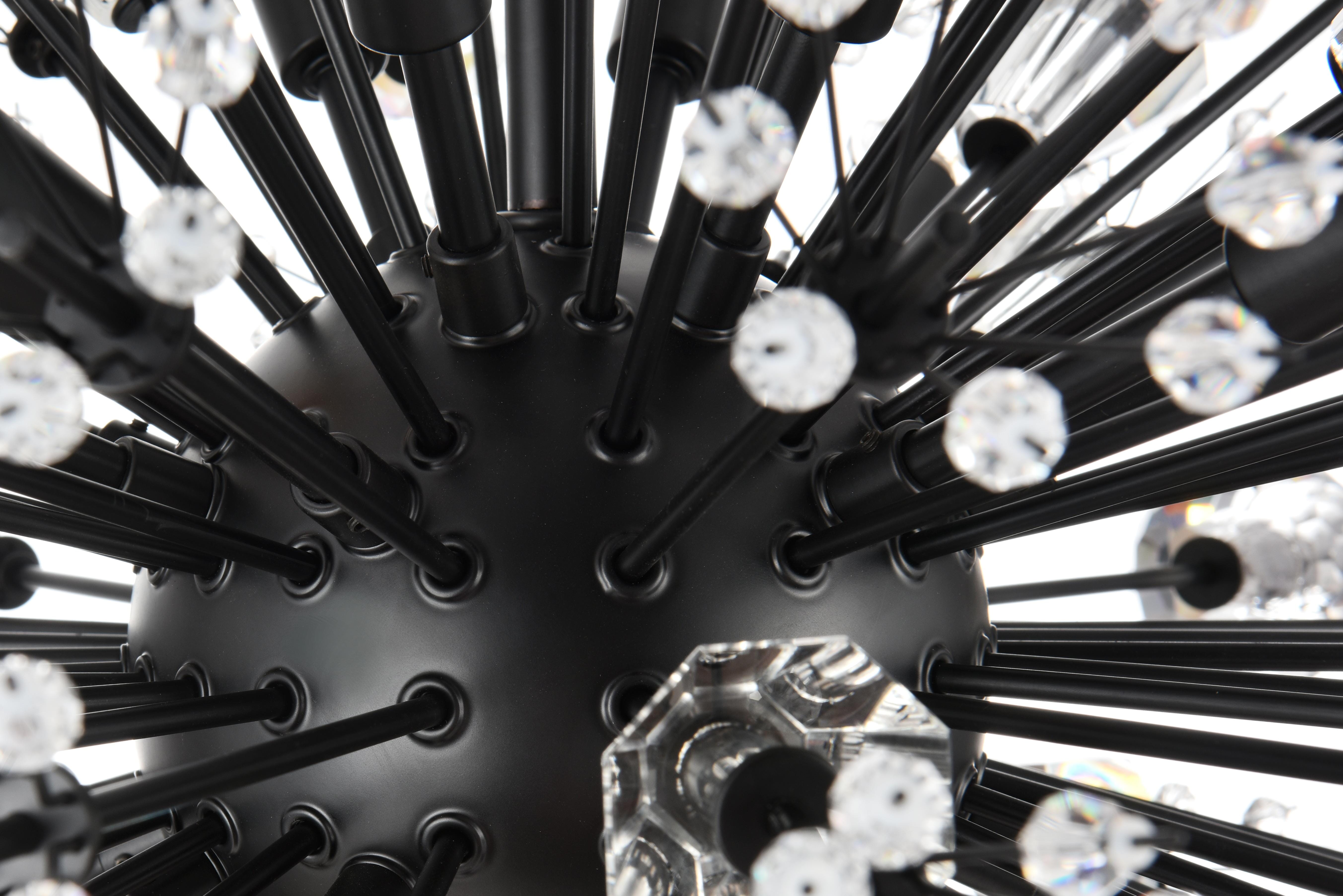 Like an explosion frozen in time, Vera collection hanging fixtures are suspended chaos. Clear large crystal balls and sprays of smaller crystals swirl amidst exposed candelabra bulbs (not included) balanced on dainty wires. A gleaming steel sphere forms the epicenter of the storm. A touch of savage beauty that easily compliments a kitchen, entryway, or bedroom. With easy assembly and compatibility with multiple bulbs, this chandelier not only illuminates but elevates your space with timeless sophistication.