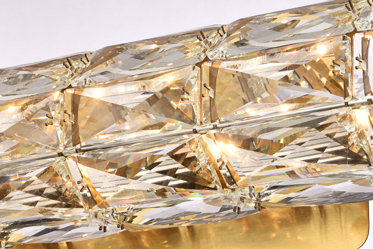 Valetta hanging fixtures dress up a living room, dining room, or bedroom without overwhelming the surrounding décor. This collection features an octagonal tube-shaped stainless-steel frame that’s covered almost entirely with shining rectangular clear crystals. A rectangular mounting plate is connected to the frame by slender cables that keep everything secure. A sleek metal finish completes this modern look with warm led lighting. Available in three sizes.