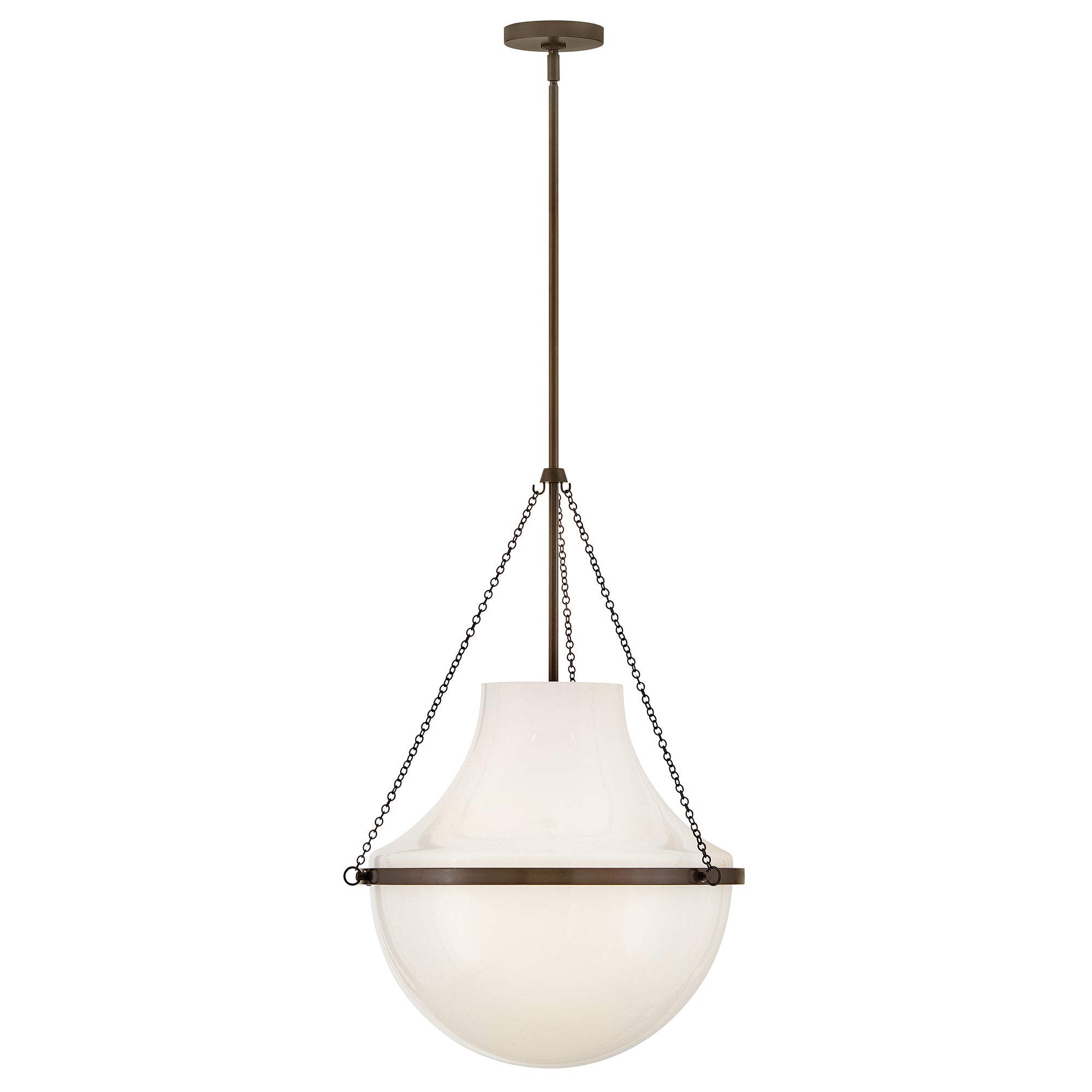 Fusing a sculpted, modern form with classically styled details, Collins features a transitional teardrop shade crafted from blown, Cased Opal glass. A central metal band and delicate chain uprights are available in Black Oxide, Heritage Brass, Heritage Bronze, or Polished Nickel finishes.