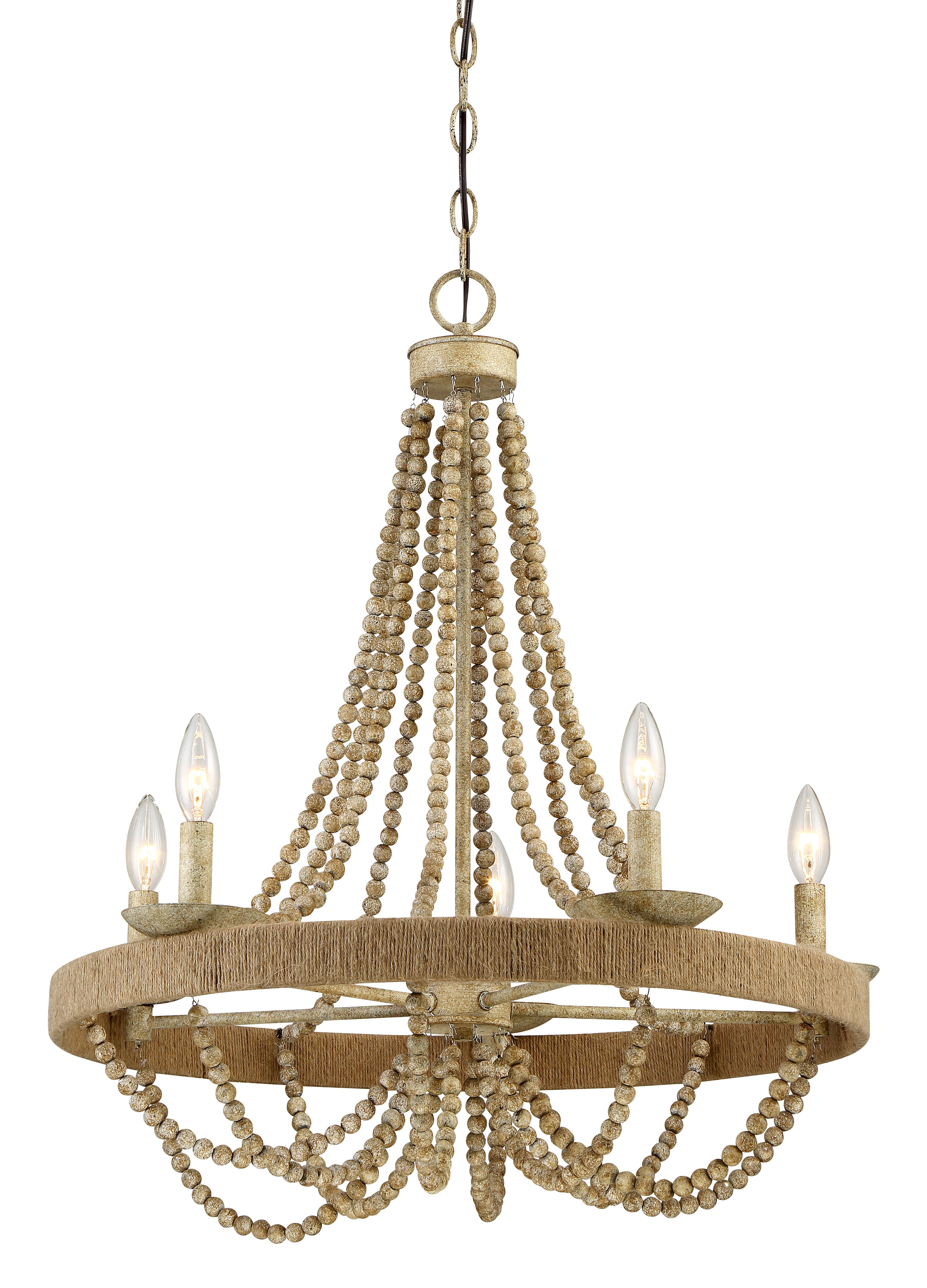 Typical chandelier style is given a relaxed, rustic makeover in this 5-light chandelier! A rope-wrapped ring is accentuated by rows of textural beads and then finished in Natural Wood. 28" in height and 26" in width.