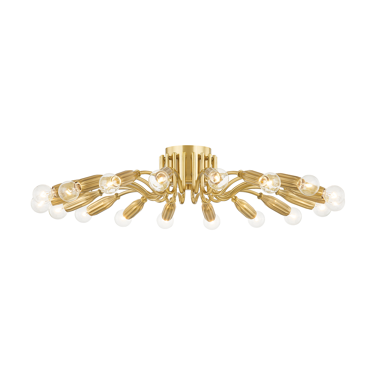 This stunning chandelier draws influence from Stilnovo designs but updates the original mid-century styling with gorgeous machined details. Fluted socket cups extend from sweeping Aged Brass arms to create a dynamic, sprawling silhouette. The small glass globes have a big impact, illuminating an entire space with a 360-degree display of light.