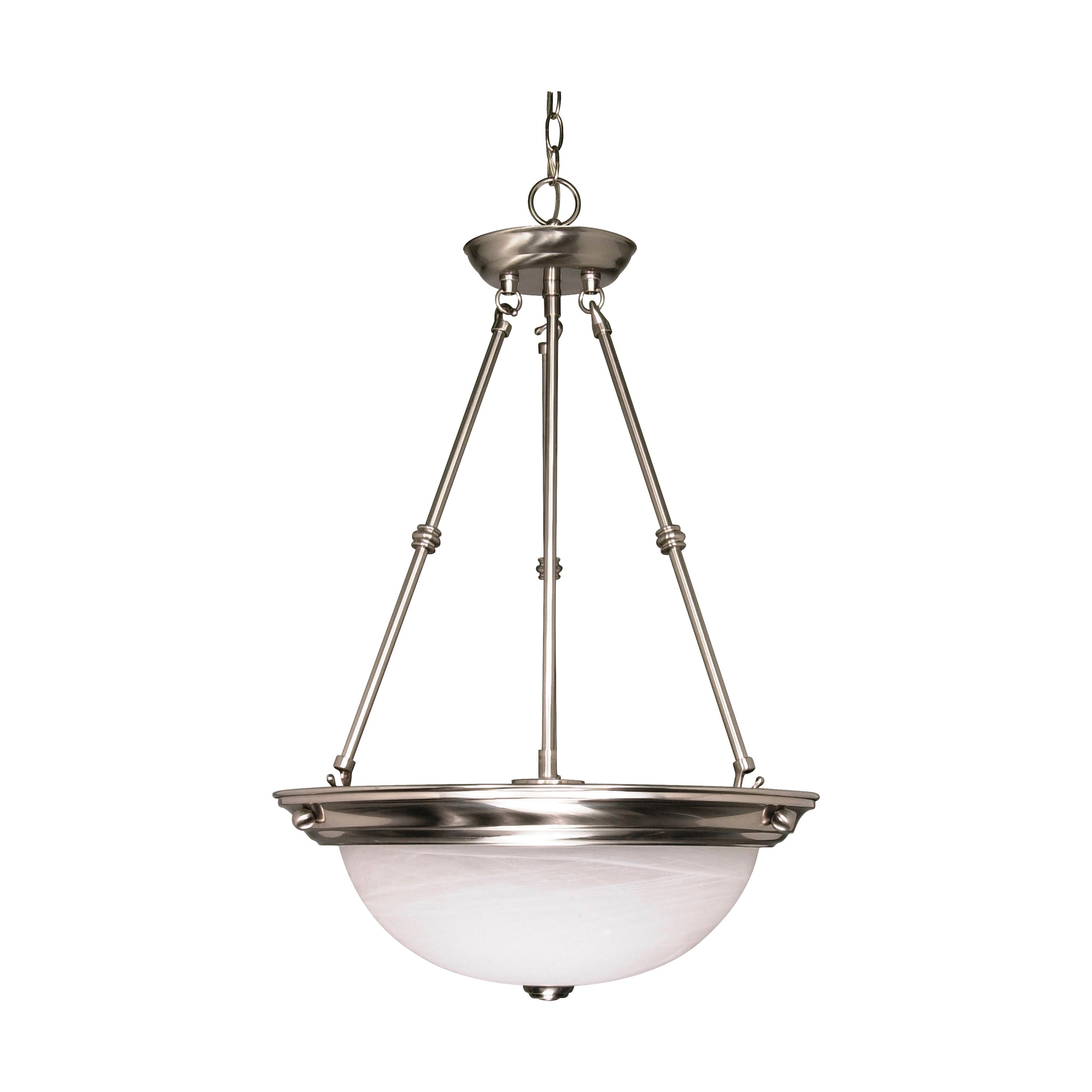 Satco's 3-light, 15 inch pendant fixture features a brushed nickel finish, accented with alabaster glass. Illuminate living rooms, dining rooms, and foyers with this elegant pendant fixture. Traditional, yet contemporary, this 3-light flush mount adds style to the home.