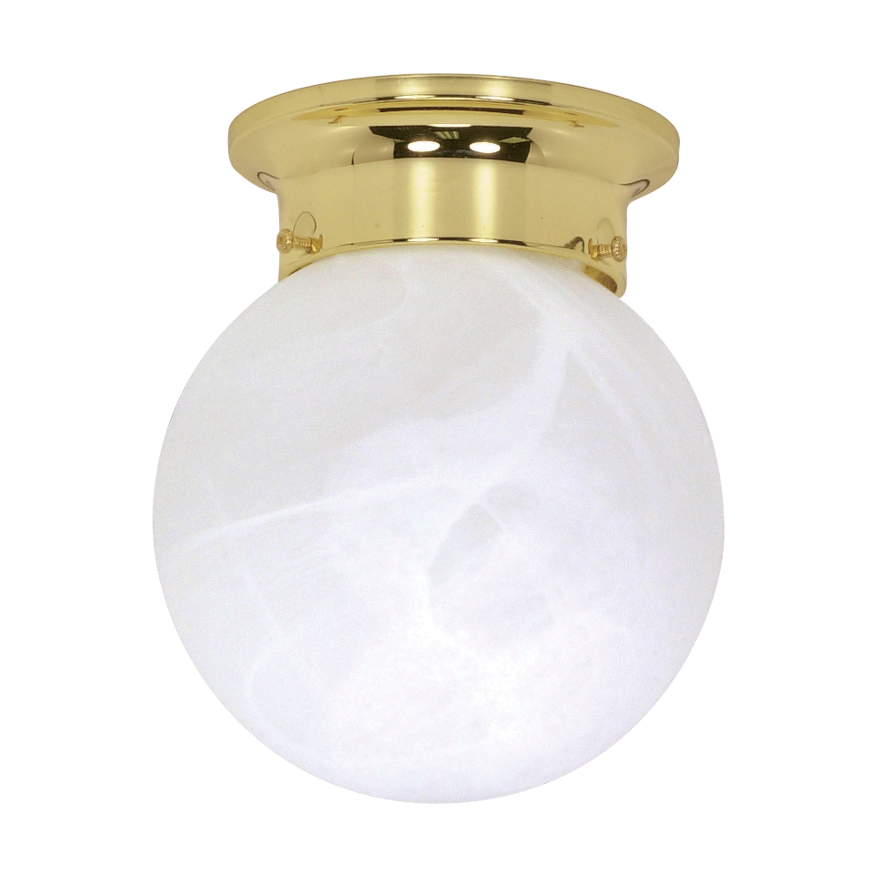 Satco's 1-light, 6 inch flush mount, ball shaped fixture features a polished brass finish, accented with white glass. Illuminate living rooms, dining rooms, and foyers with this elegant round fixture. Traditional, yet contemporary, this 1-light flush mount adds style to any home.