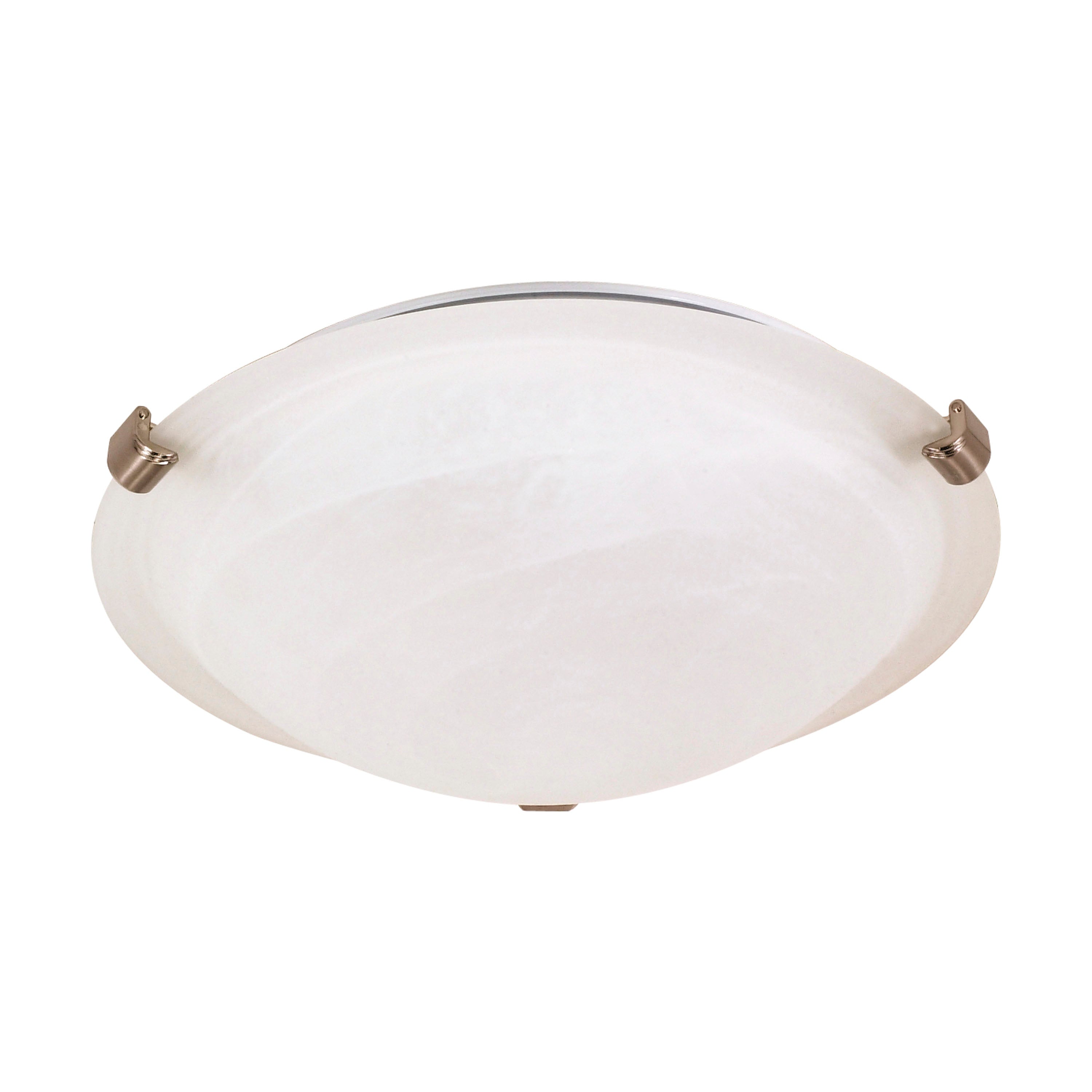 Satco's 1-light, 12 inch flush mount fixture features a brushed nickel finish, accented with alabaster glass. Easy to install with a Tri-Clip design, illuminate living rooms, dining rooms, and foyers with this elegant round fixture. Sleek and contemporary, this 1-light flush mount adds style to any home.