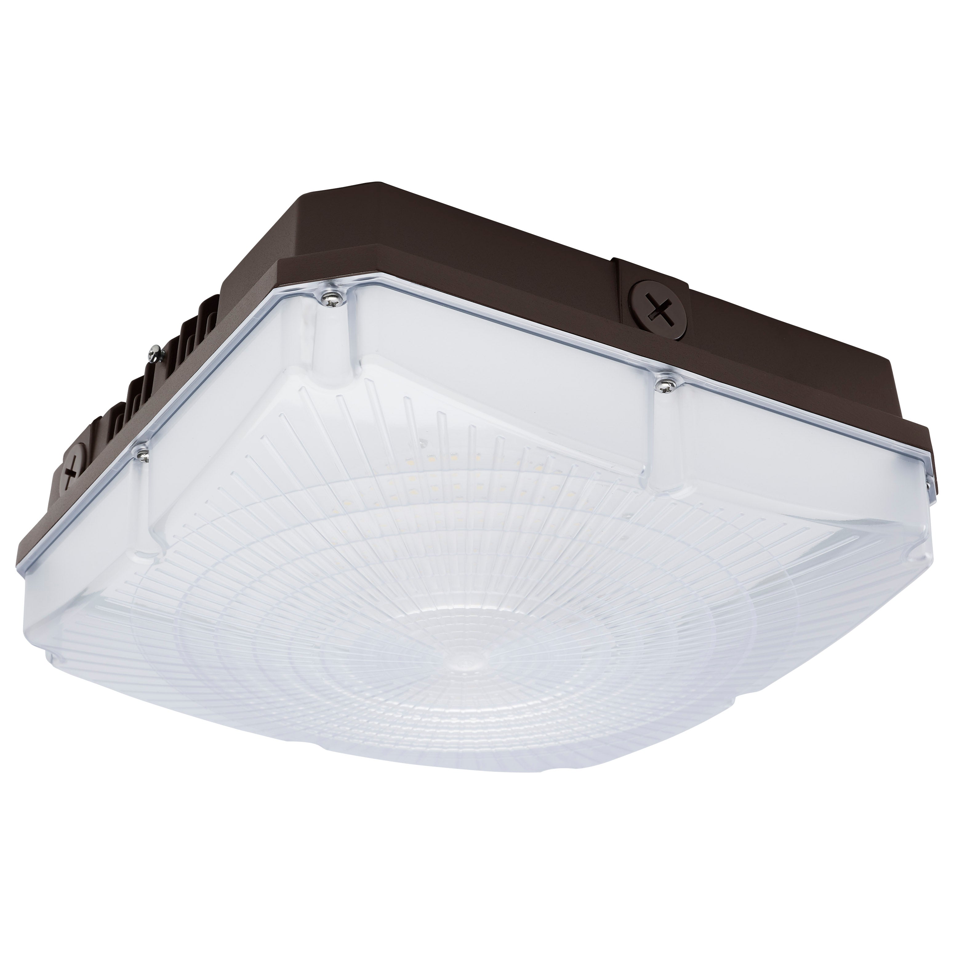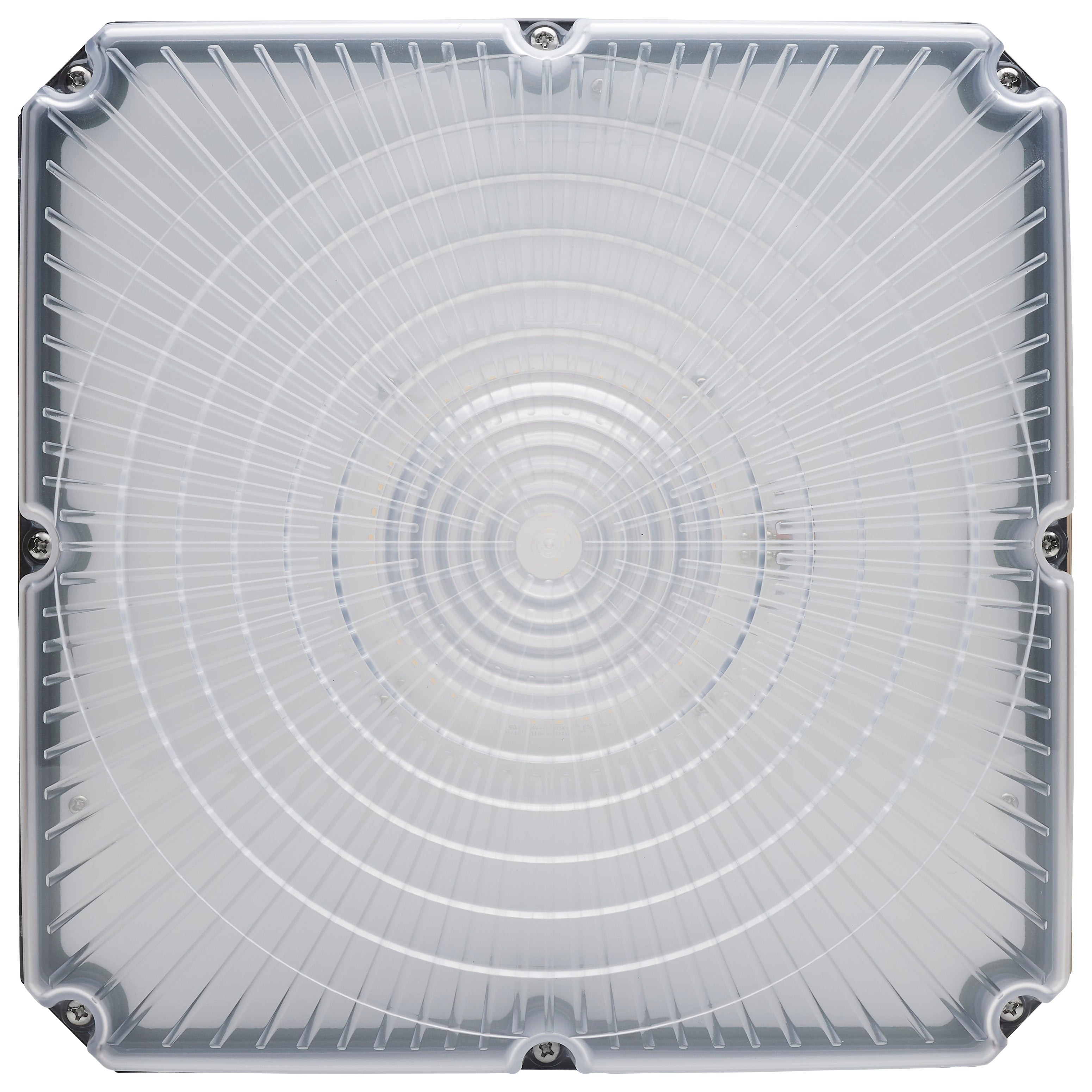 SATCO NUVO's Field Selectable square canopy fixtures are an ideal choice for multiple applications. These fixtures offer the flexibility to choose from three wattage and three CCT options during installation, with some models featuring an integrated microwave sensor for motion-activated energy. With a choice of surface mounting using the hinged universal bracket or 3/4-inch pendant mounting, installation of these luminaries is a breeze. The two side knockouts allow for wiring access to be fast and efficient. The sleek bronze die-cast aluminum housing, the IK08 impact-rated vandal-resistant polycarbonate lens, and the IP65 wet location rating, ensures reliable illumination even in the most adverse weather conditions.