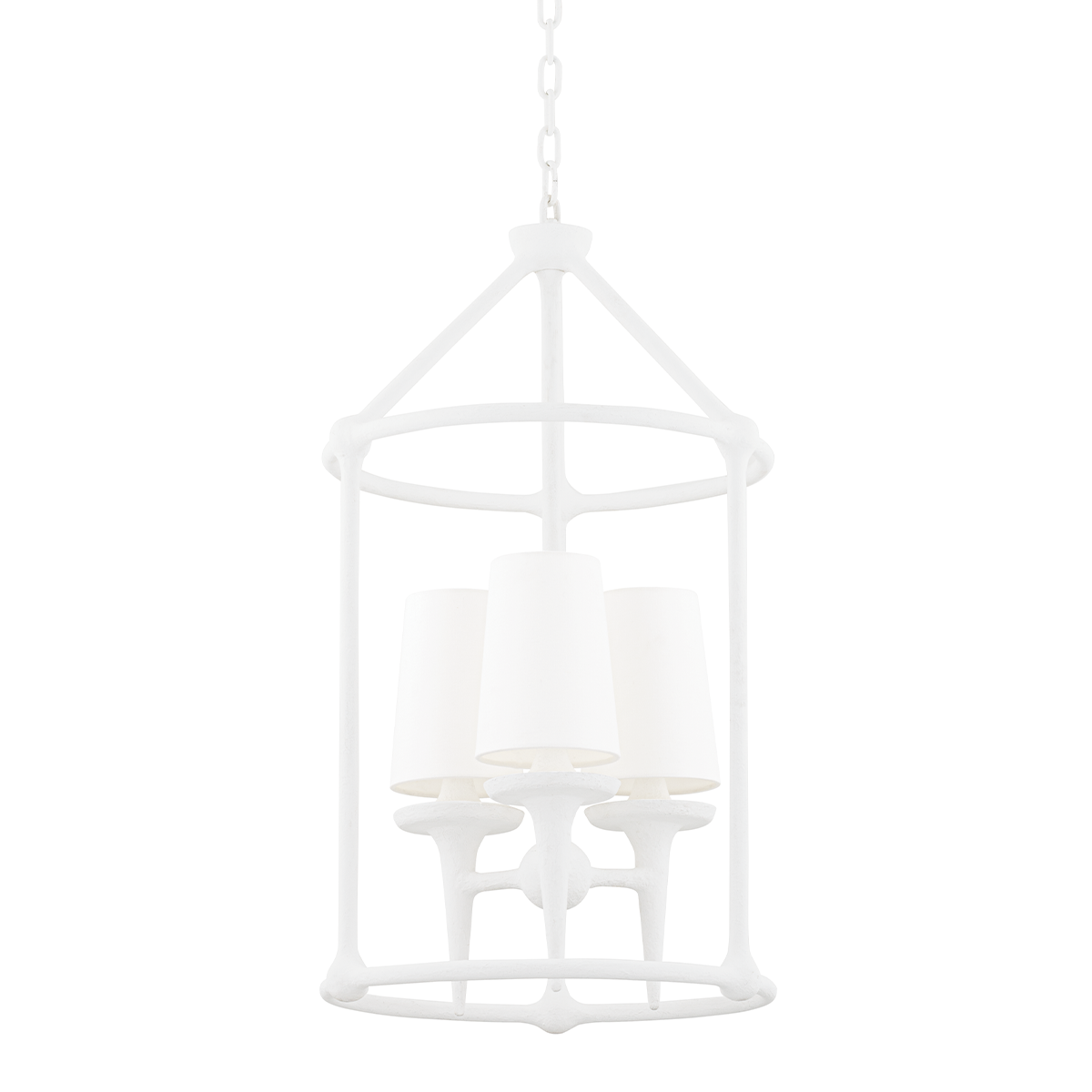 Torch passes new life into traditional shapes, like a wagon-wheel chandelier, cage pendant and recognizable sconce and linear forms. The sleek, sculptural arms make it easy to see how Torch got its name. The white plaster provides a monochromatic matte finish with the Belgian linen shades while the gold leaf adds a bit of shine that complements the white shades.