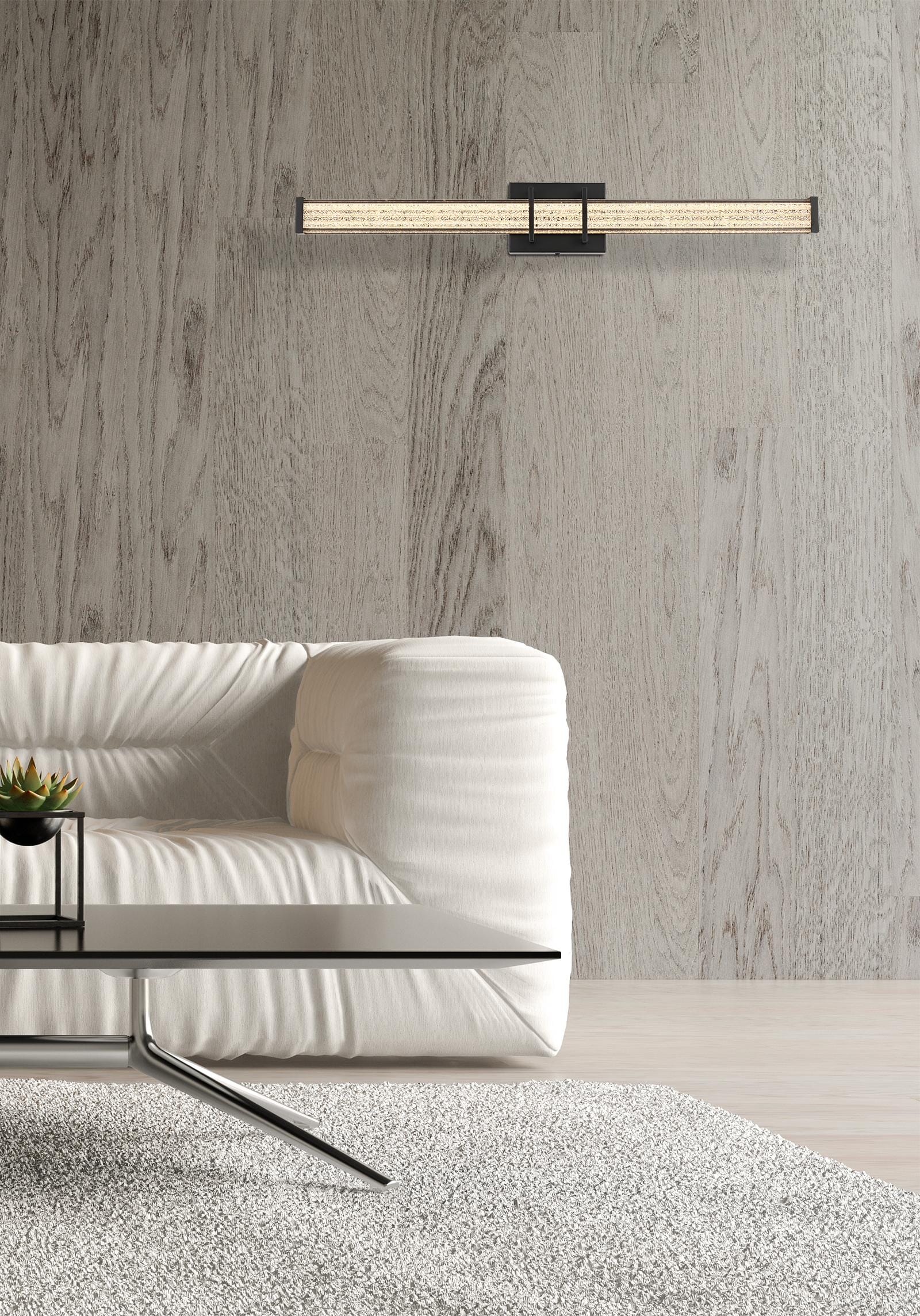 Elevate your space with this captivating linear wall sconce that marries contemporary design with romantic allure. The show-stopping crackled acrylic diffuser creates a mesmerizing display of light and shadow, reminiscent of fractured crystal catching the morning sun. Suspended within a sophisticated black frame, the fixture appears to float against your wall, creating an architectural statement that's both bold and ethereal. The textured diffuser transforms ordinary light into a dramatic interplay of illumination, casting subtle patterns that bring walls to life while providing elegant ambient lighting. This modern interpretation of classic crystal lighting bridges the gap between traditional luxury and contemporary design, making it perfect for both intimate residential spaces and upscale commercial environments. Whether mounted in an entryway, above a dining table, or as part of a sophisticated lighting scheme, this fixture creates an immediate impression of refined taste and artistic sensibility. The contrast between the industrial mounting brackets and the delicate crystalline diffuser perfectly embodies modern romantic design, creating a compelling focal point that enhances any interior style.