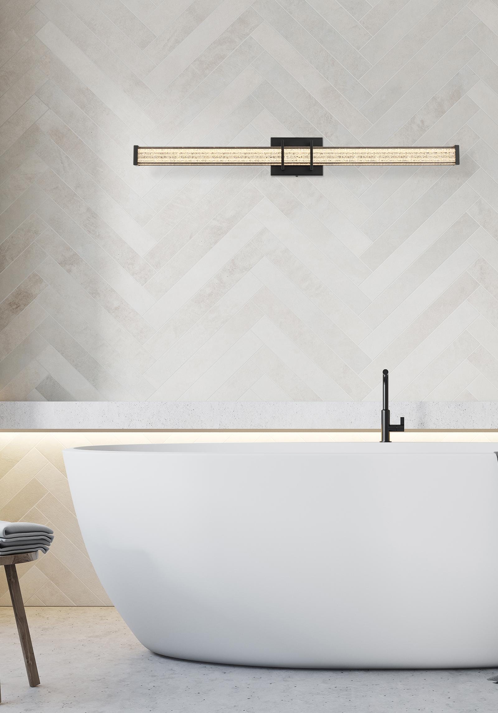 Elevate your space with this captivating linear wall sconce that marries contemporary design with romantic allure. The show-stopping crackled acrylic diffuser creates a mesmerizing display of light and shadow, reminiscent of fractured crystal catching the morning sun. Suspended within a sophisticated black frame, the fixture appears to float against your wall, creating an architectural statement that's both bold and ethereal. The textured diffuser transforms ordinary light into a dramatic interplay of illumination, casting subtle patterns that bring walls to life while providing elegant ambient lighting. This modern interpretation of classic crystal lighting bridges the gap between traditional luxury and contemporary design, making it perfect for both intimate residential spaces and upscale commercial environments. Whether mounted in an entryway, above a dining table, or as part of a sophisticated lighting scheme, this fixture creates an immediate impression of refined taste and artistic sensibility. The contrast between the industrial mounting brackets and the delicate crystalline diffuser perfectly embodies modern romantic design, creating a compelling focal point that enhances any interior style.