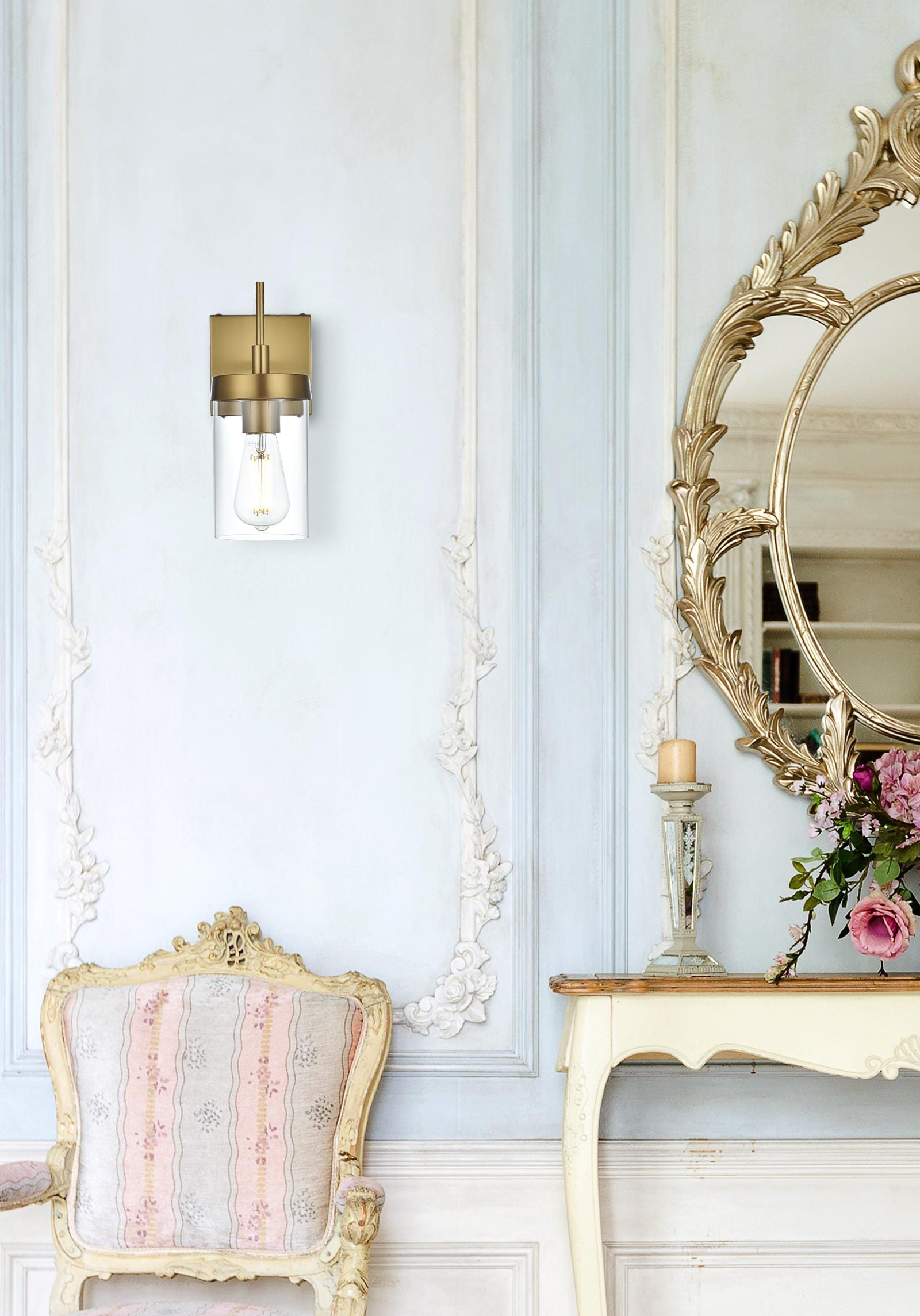 Enhance your home with this stylish wall sconce that brings together modern design and versatility. Available in four eye-catching finishes—Satin Gold, Black, Brass, and Chrome—this wall sconce is crafted to seamlessly blend with any decor style. The clear cylindrical glass shade provides a clean, contemporary look while allowing the light to shine fully, making it perfect for illuminating any space. The straight arm and bold square backplate add a sleek and modern character to the fixture, making it an ideal addition to any room. Whether you choose to install it facing up or down, this sconce offers flexibility and customization for your lighting needs. The E26 socket (bulb not included) gives you the option to personalize the look by selecting the bulb that best matches your desired ambiance—whether it’s a vintage filament bulb for a classic vibe or a modern LED for energy efficiency. Bring this versatile piece into your bathroom, hallway, living room, or bedroom to add a touch of modern style and practical lighting.