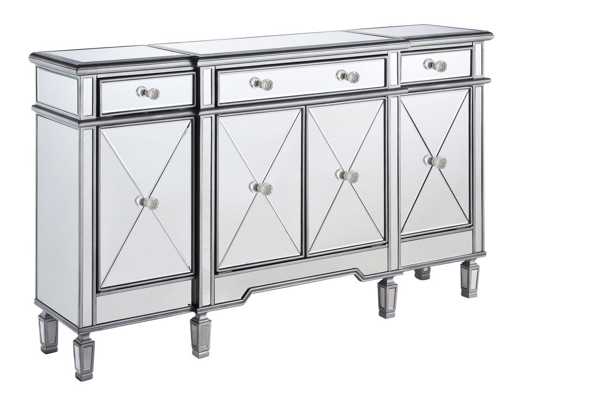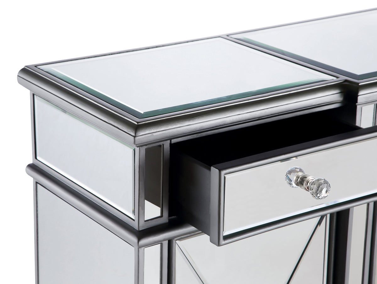 This fashionable, contemporary mirrored console, with its hand-rubbed silver finish and incised carved, tapered legs, features a slight antique touch. Its 3 mirrored drawers and 4 mirrored door fronts are enhanced with brushed steel knobs. Measuring L60” x W14” x H36”, its alluring symmetry, size and shape make this piece perfect to magnify the beauty of your living room or add a touch of elegant decor to a hallway or narrow space. In addition, this attractive mirrored cabinet offers you extra storage space and a wide display area for your art objects, figurines or candle holders. (Constructed with selected kiln-dried solid wood and engineered wood panels.)