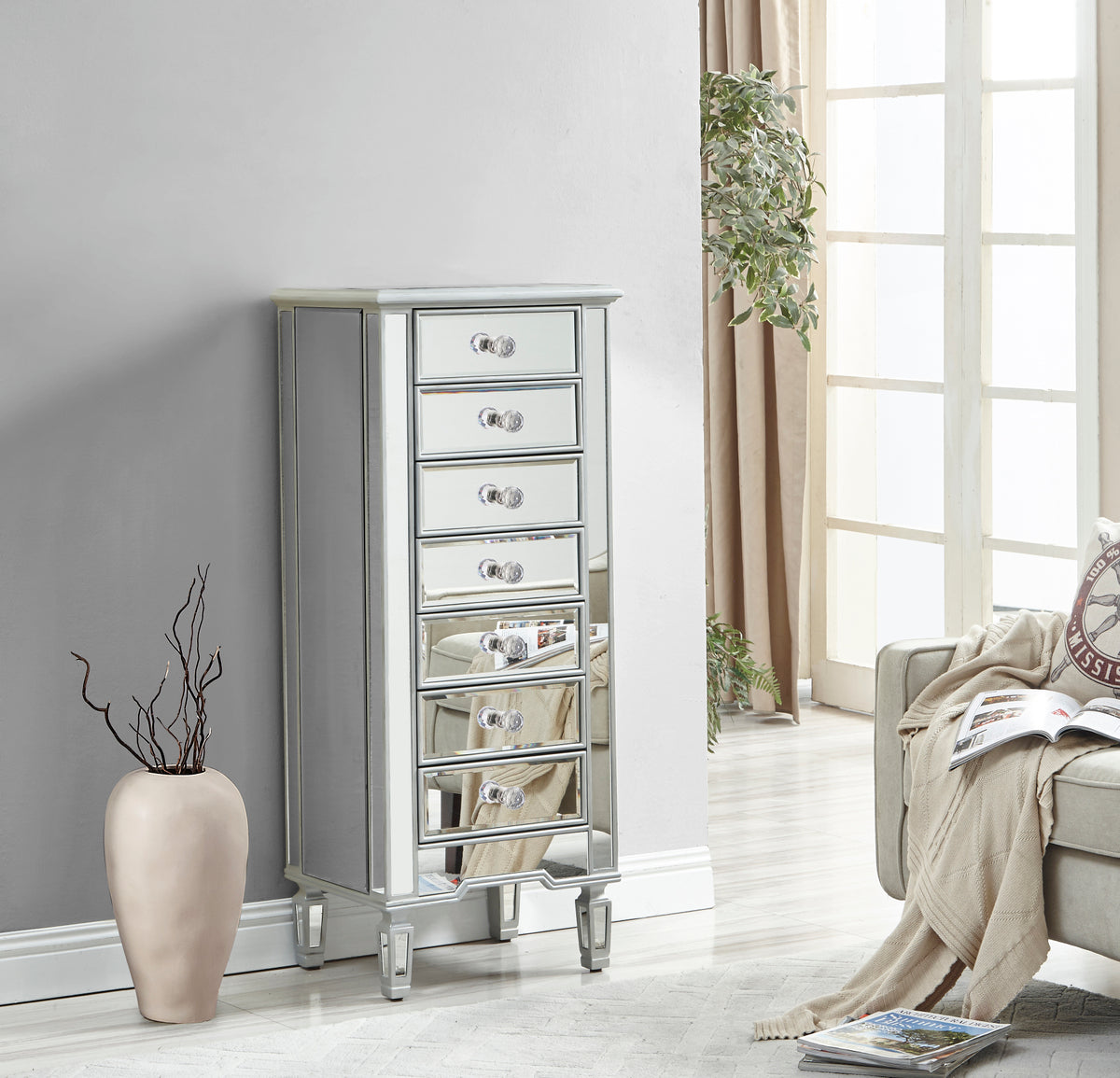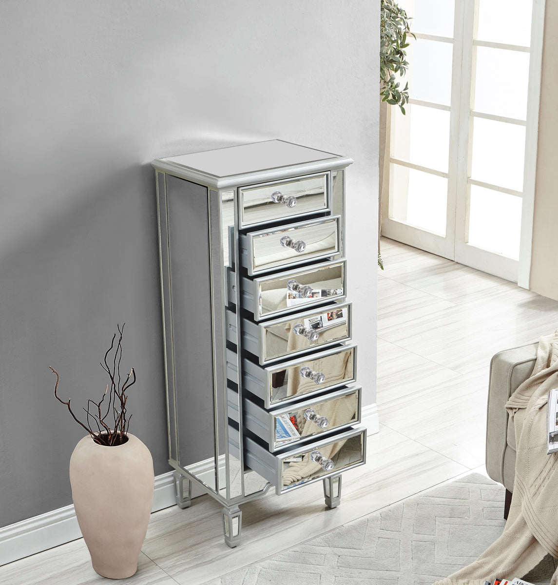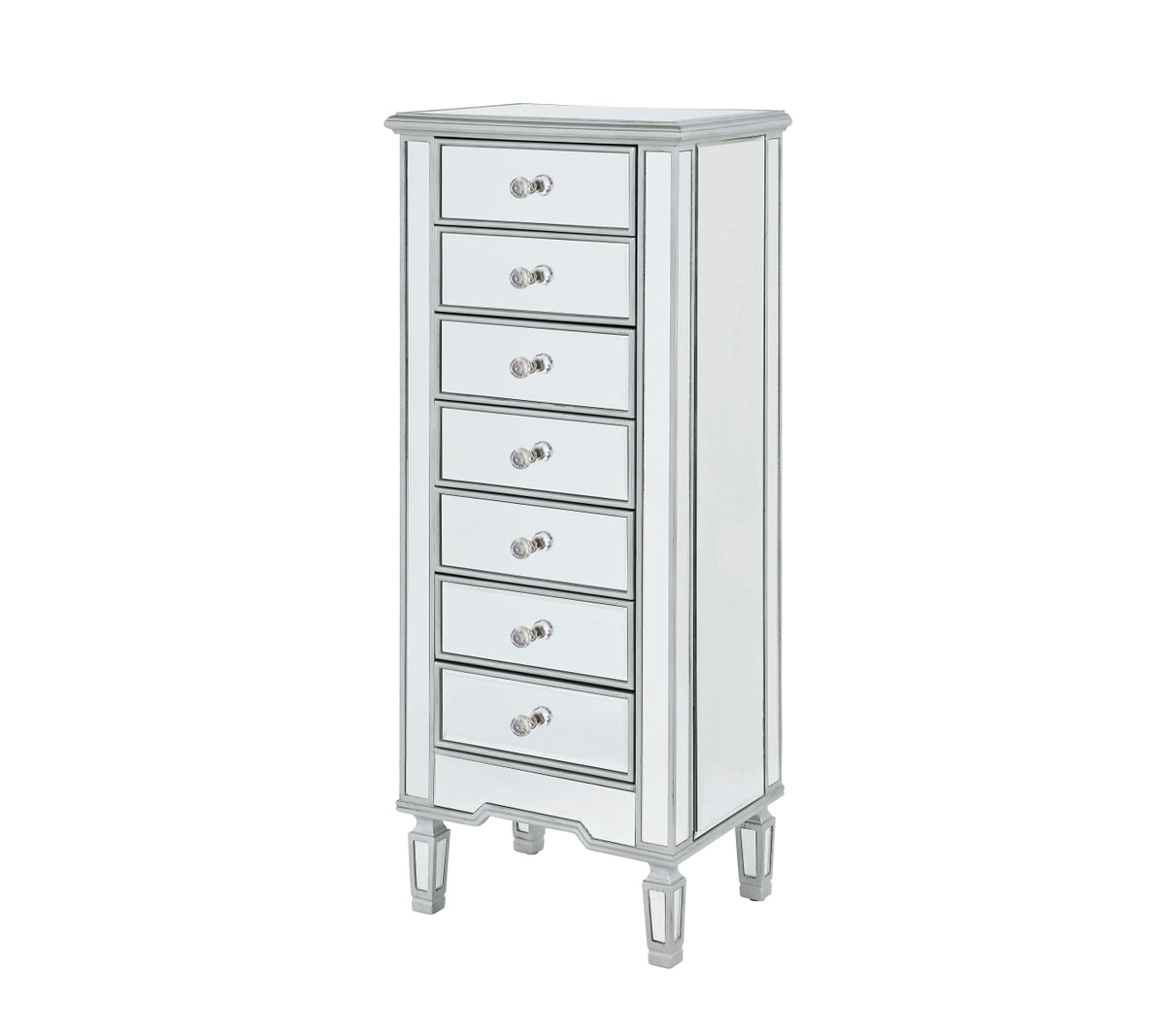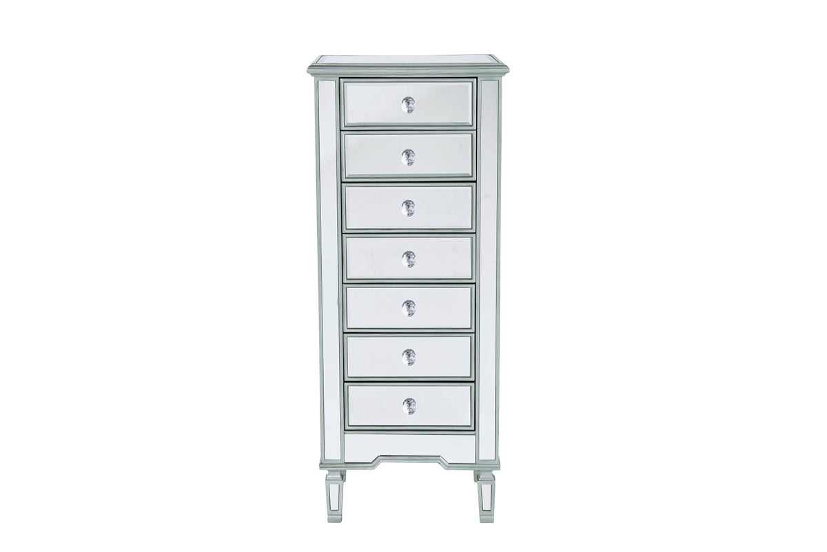 Enhance your bedroom or dressing area with this elegant and sophisticated lingerie chest, pamper yourself! You can also store your treasured belongings or Silverware in this petite 7 drawer chest in any corner of your room. Dramatic and sophisticated, it has a hand paintedSilver finish, beveled mirror panels on all surfaces, drawers decorated with brushed steel knobs, and incised tapered legs. This chest are build to please! FEATURES: *Reflexion collection *7 drawer * brushed steel knobs *Hand paintedSilver finish *Beveled mirror panel *Solid wood trim and legs *Wood drawer glides *Inside lining painted in silver. PRODUCT DETAILS: Measurement W20xD15xH48” *Minor assembly required *Material in solid wood and engineered wood *1 year limited warranty.