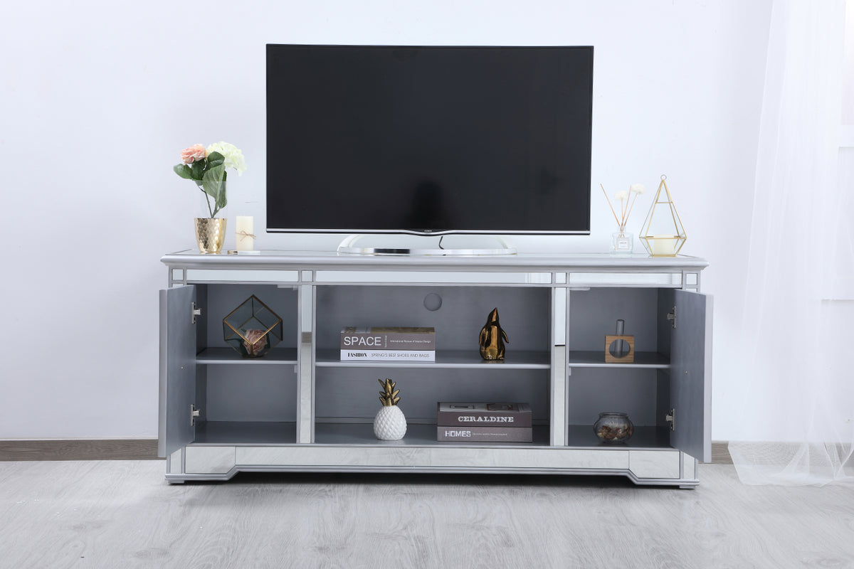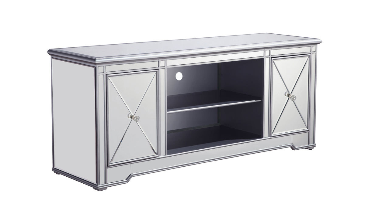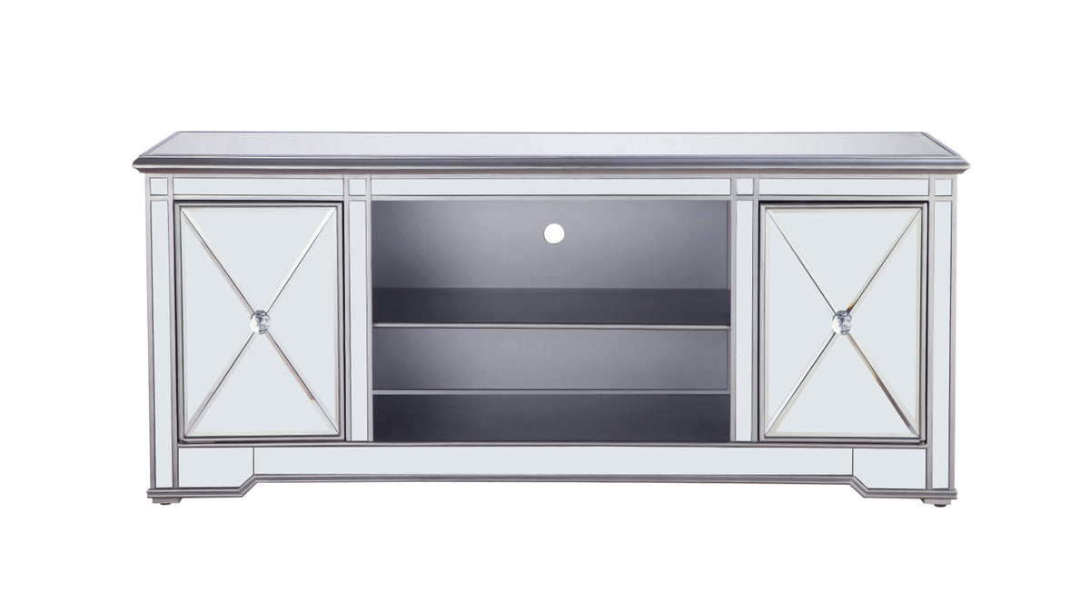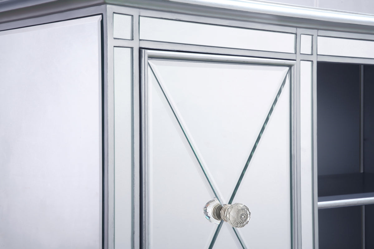 Sleek and vibrant, this classy media cabinet will make a striking statement in any room can showcase up to a 60" flat screen TV at a perfect height. Featuring gleaming criss-cross style mirror panel and hand-rubbed silver finish, brushed steel knobs. Functional and chic, with 2 soft-closing side doors, center opening and shelvings, it provides plenty of storage for your equipment, games, and books.