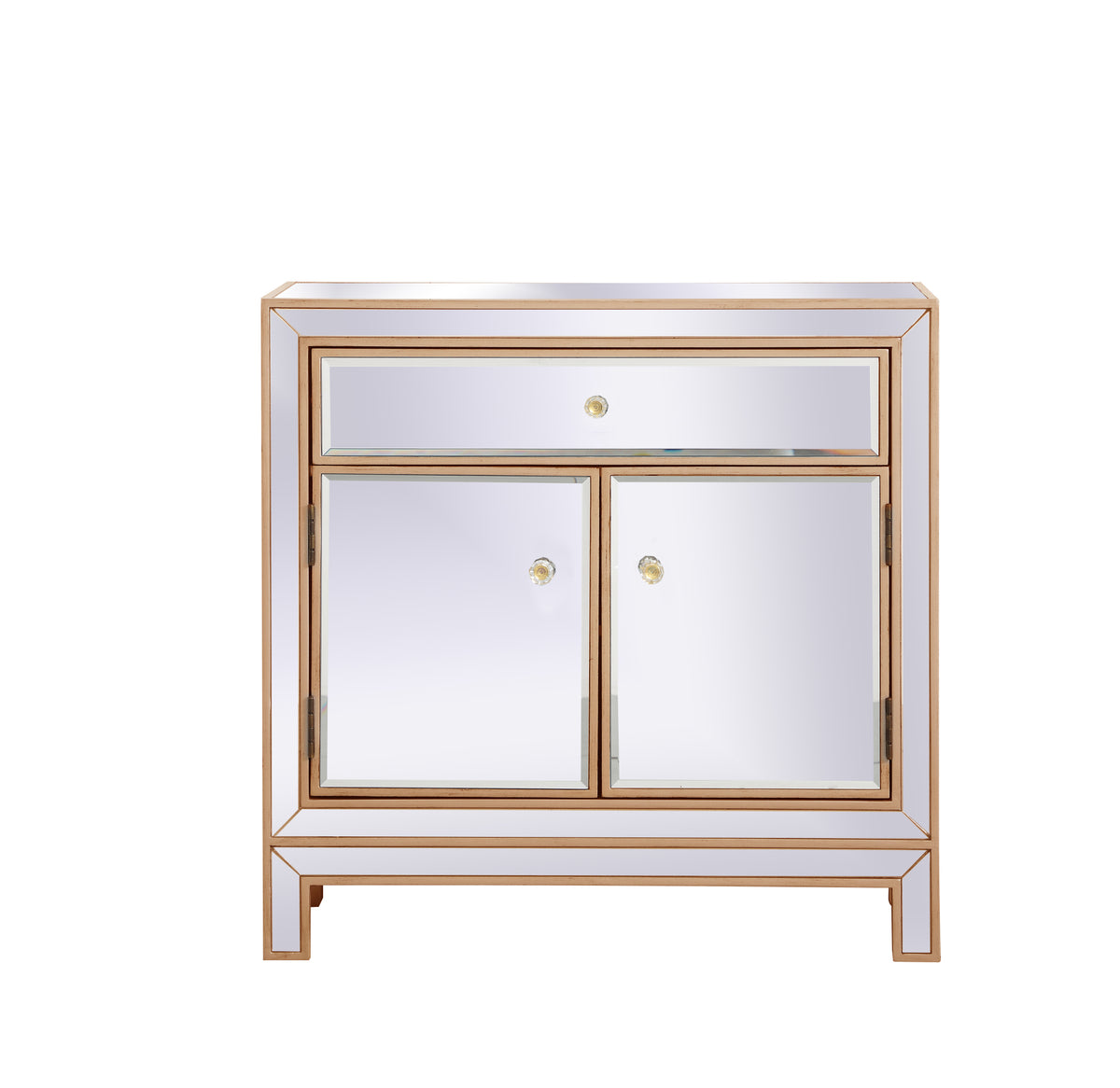 A perfect balance of contemporary style and practical utility, this chic one drawer, two doors mirror cabinet will enhance any room in your home. Featuring a hand painted gold finish, top quality mirror panels in distinctive mitered corner, jewel like crystal door knobs, it will provide you with stylish storage space you often need.