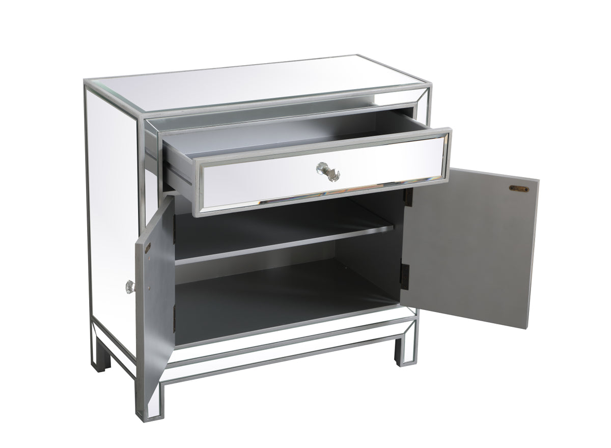 A perfect balance of contemporary style and practical utility, this chic one drawer, two doors mirror cabinet will enhance any room in your home. Featuring a hand paintedSilver finish, top quality mirror panels in distinctive mitered corner, jewel like crystal door knobs, it will provide you with stylish storage space you often need.