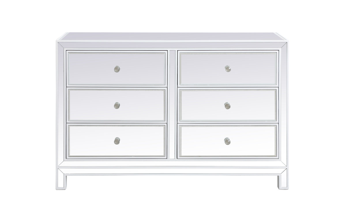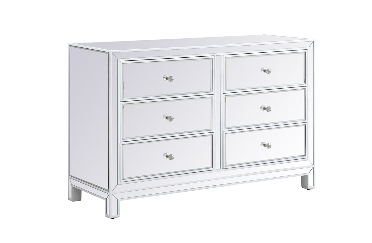 Sophisticated with a reflective touch, this 48 inch wide mirrored cabinet adds style and functionality to any room. Six deep drawers provide ample storage space, each decorated with a crystal knob. Distinctively designed with mitered corners, all surfaces are inlaid with mirror panels.