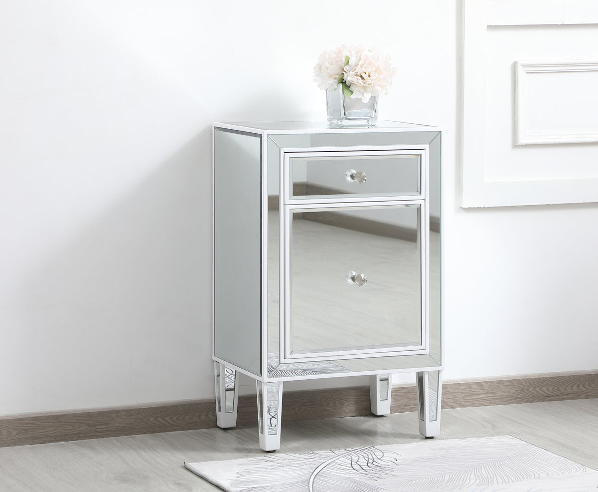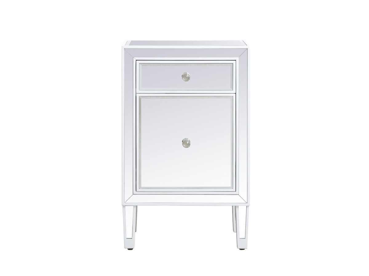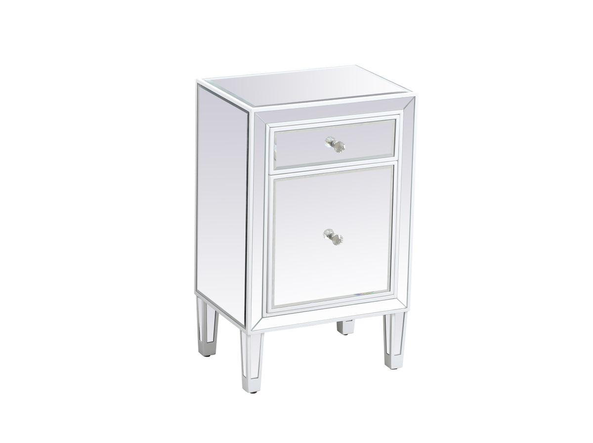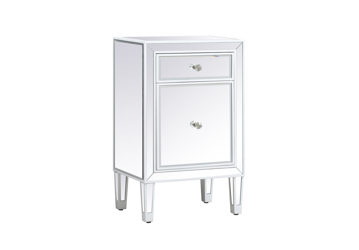 Add a touch of class to any room with this stunning accent chest or nightstand. With beaming mirrored surfaces, it opens up the visual space in the room while imbuing it with glamour. This functional contemporary chest comes with one drawer, one door, sparkling crystal knob, and gracefully tapered legs.
