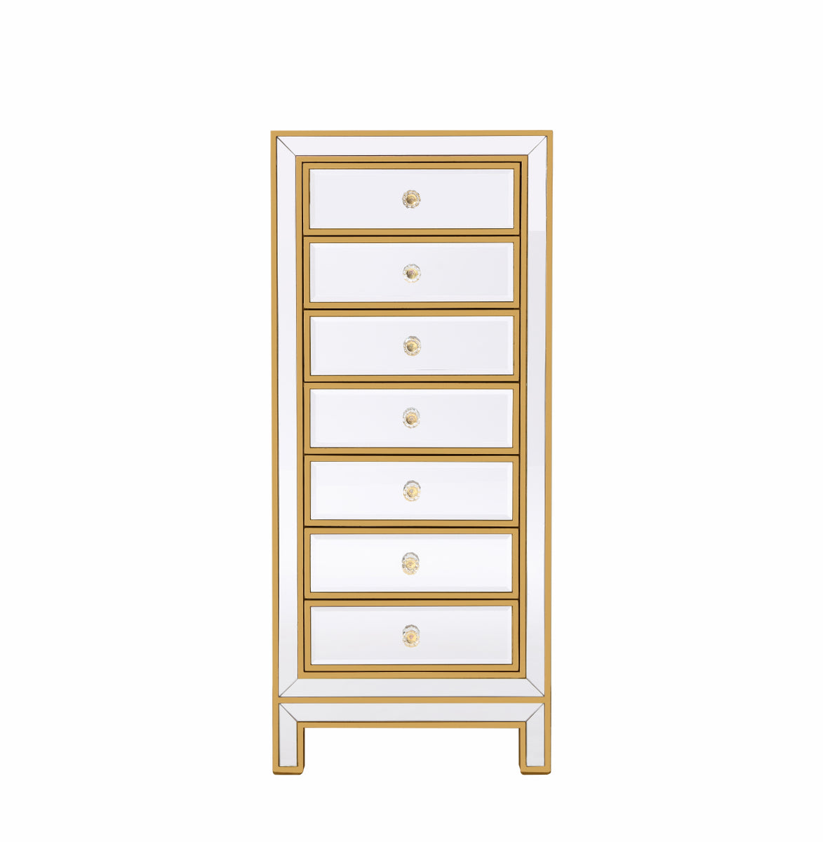 Enhance your bedroom or dressing area with this elegant and sophisticated lingerie chest, pamper yourself! You can also store your treasured belongings or goldware in this petite 7 drawer chest in any corner of your room. Dramatic and sophisticated, it has a hand painted gold finish border, beveled mirror panels on all surfaces, sparkling crystal drawer knobs, and mitered corners. FEATURES: *Reflexion collection *7 drawer * crystal knobs *Hand painted gold finish *Beveled mirror panel *Solid wood trim and legs *Wood drawer glides *Inside lining painted in gold. PRODUCT DETAILS: Measurement W18xD15xH42” *No assembly required *Material in solid wood and engineered wood *1 year limited warranty.