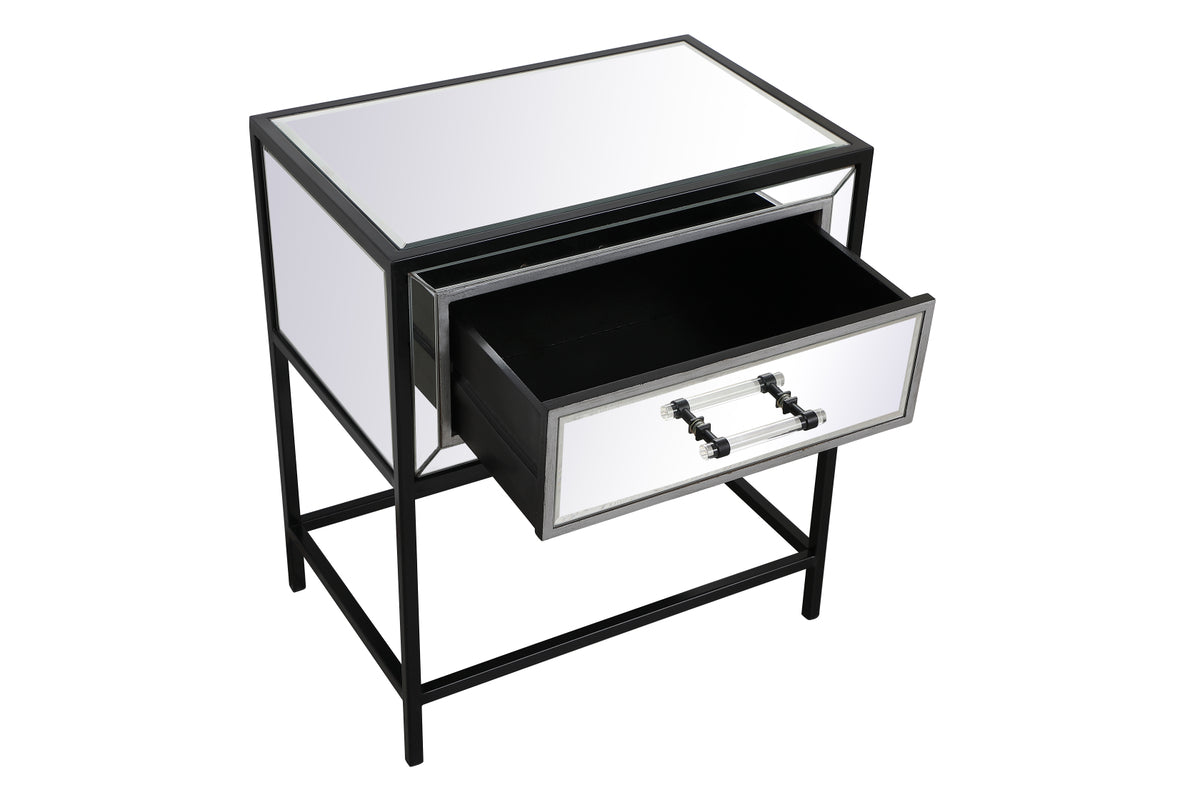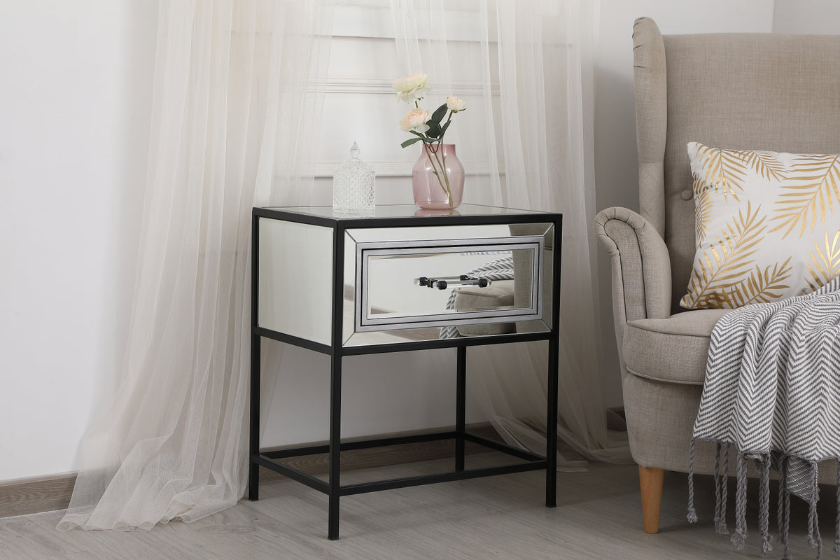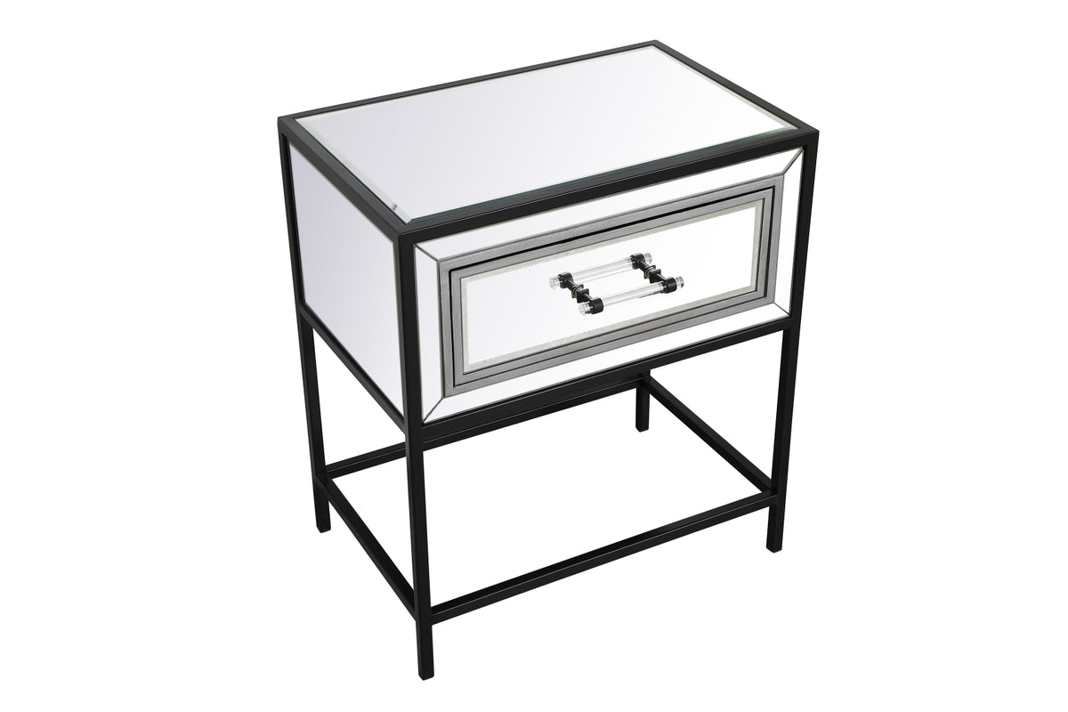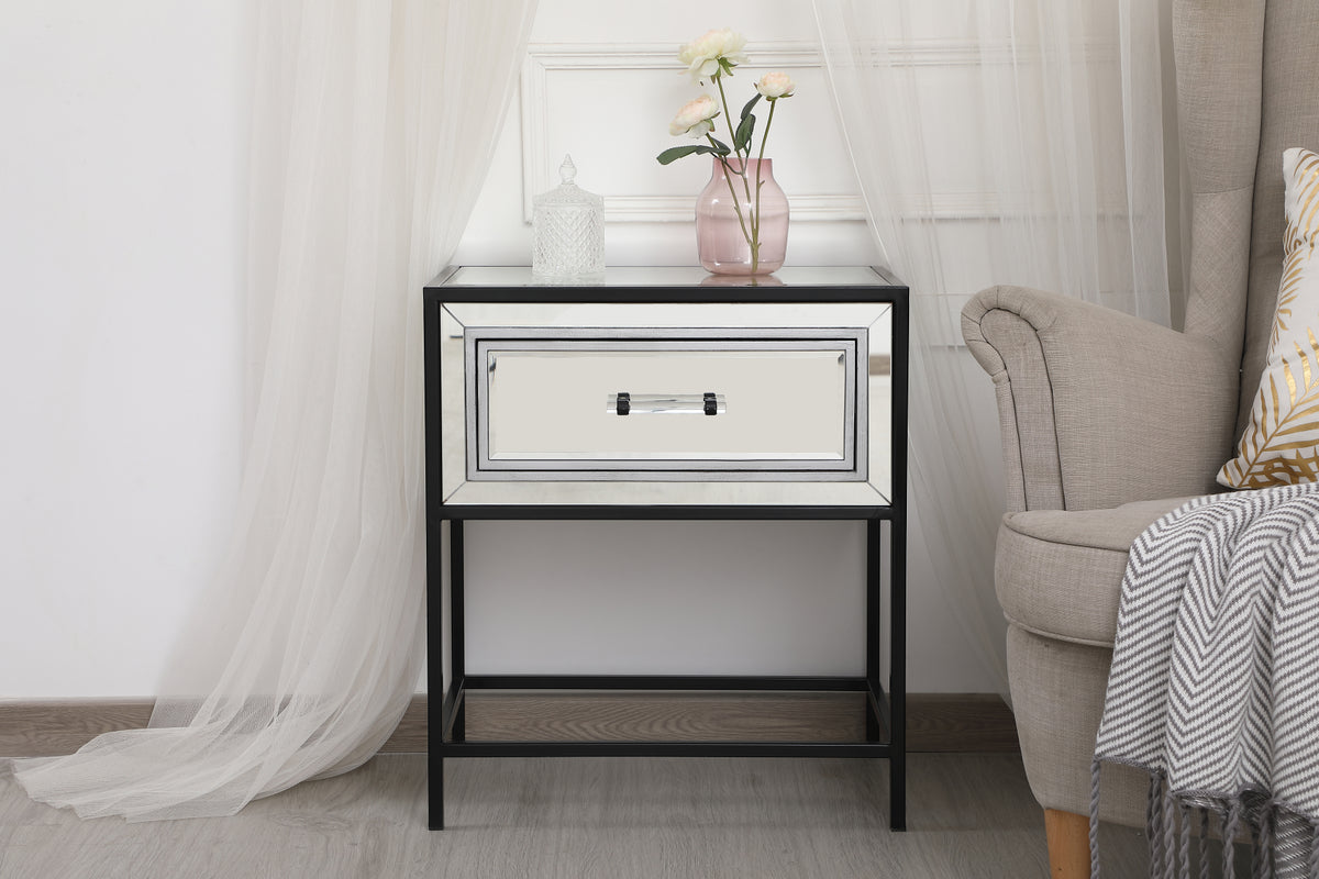 The Beau collection mirrored furniture in a black finish will add lovely sophistication and complement any living room or bedroom area, while utilizing its charm and function to provide you with ample storage spaces. Clear acrylic handle gently adorn the mirrored panel and contrasting black metal legs, allowing for you to store away your essentials.