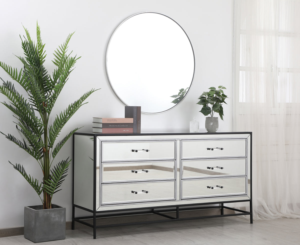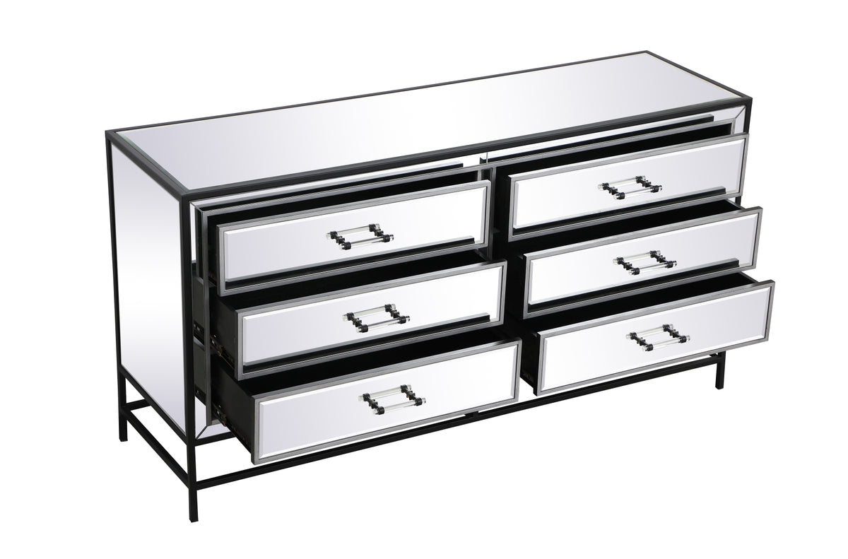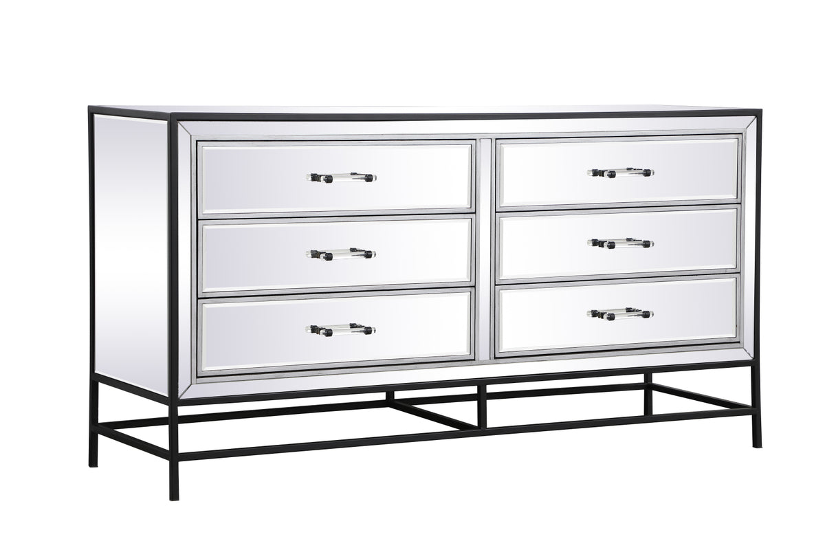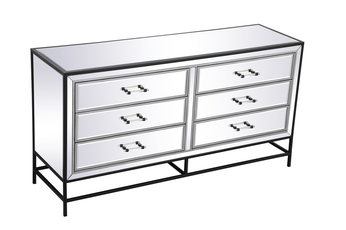 The Beau collection mirrored furniture in a black finish will add lovely sophistication and complement any living room or bedroom area, while utilizing its charm and function to provide you with ample storage spaces. Clear acrylic handle gently adorn the mirrored panel and contrasting black metal legs, allowing for you to store away your essentials.