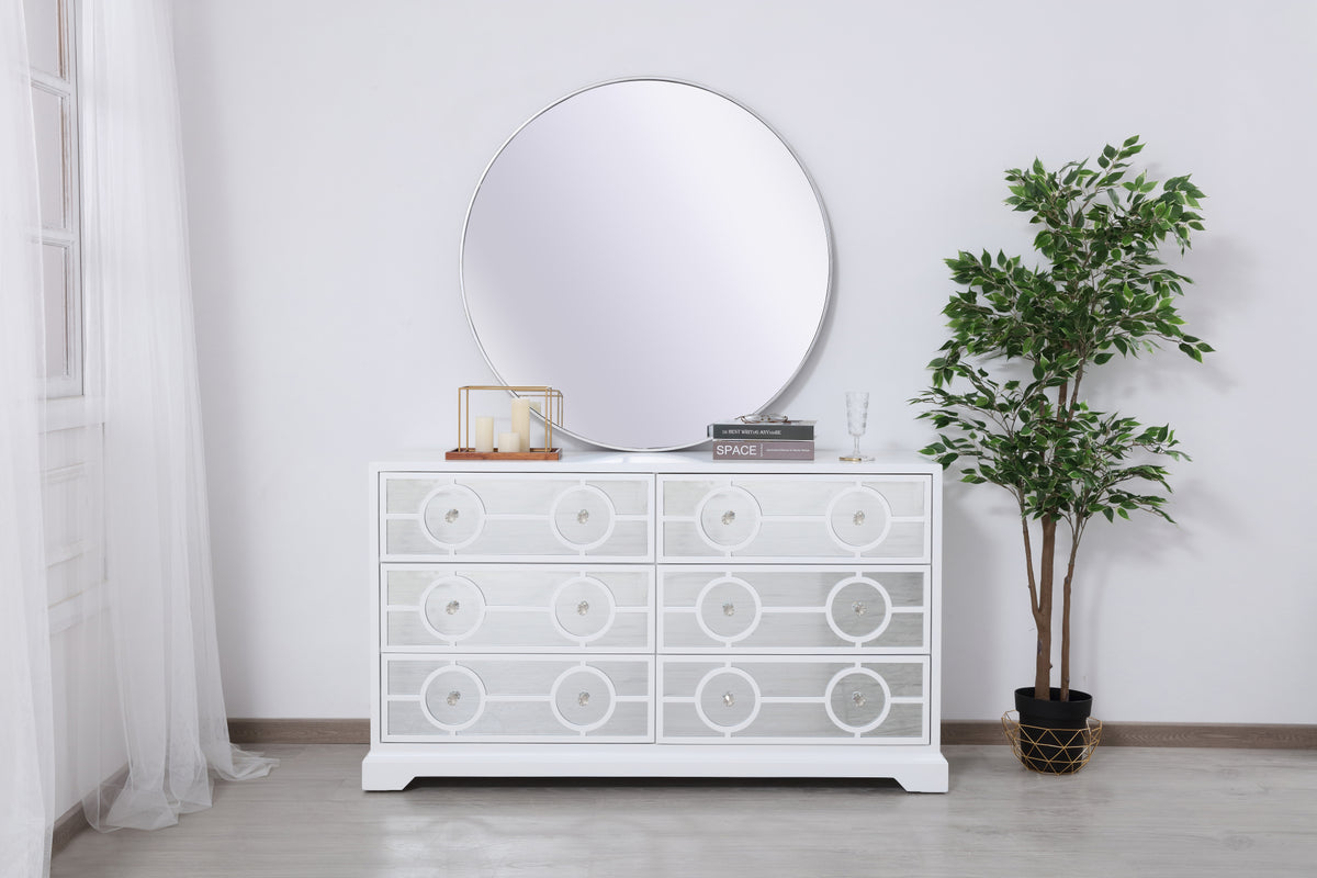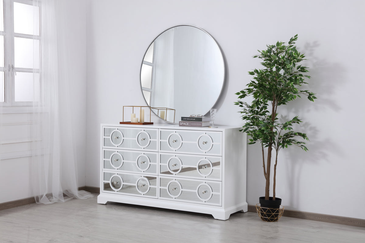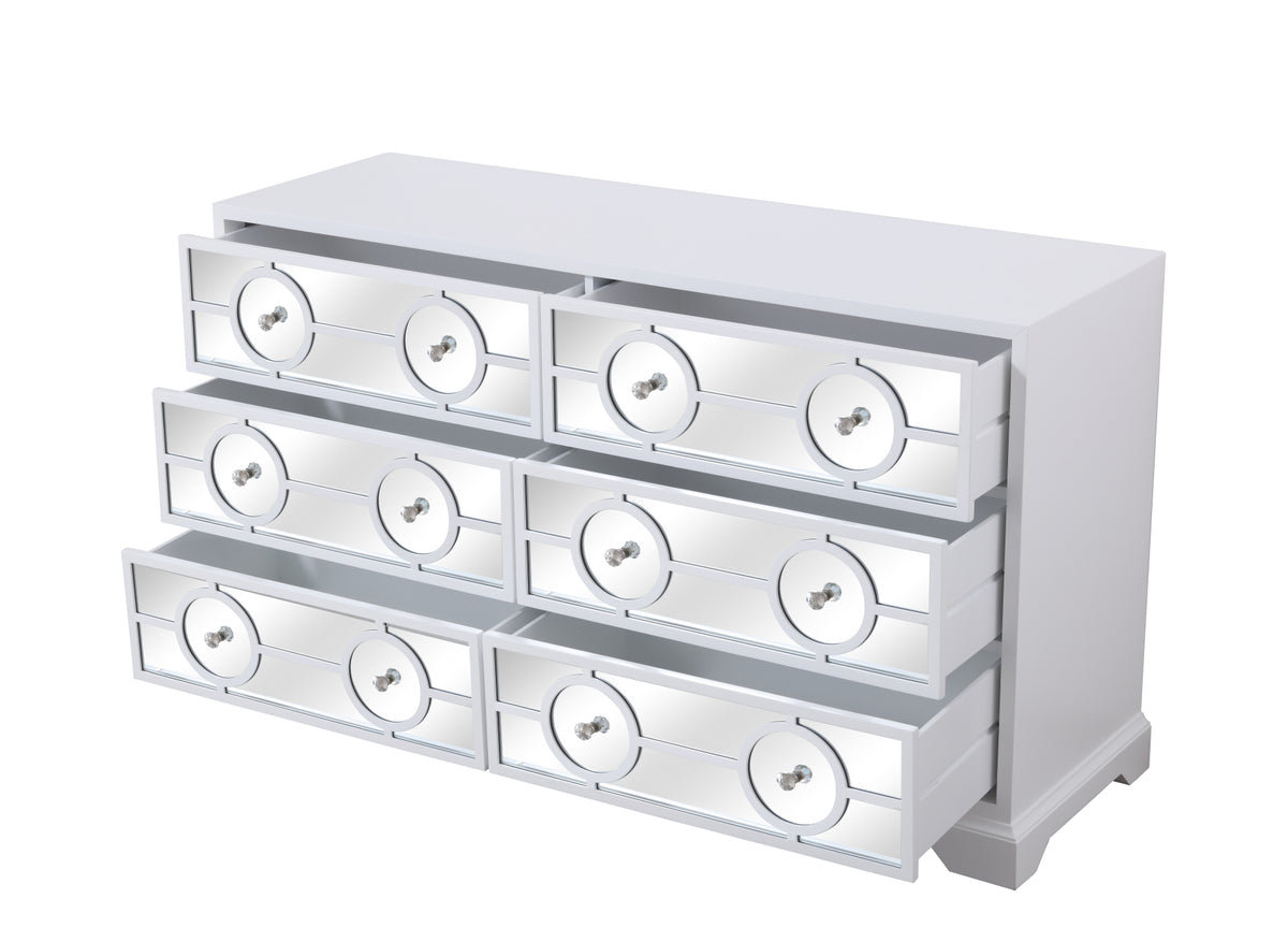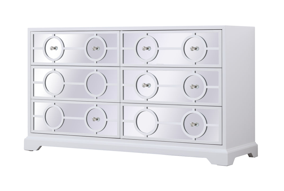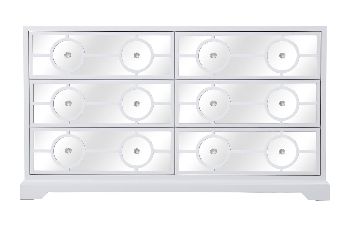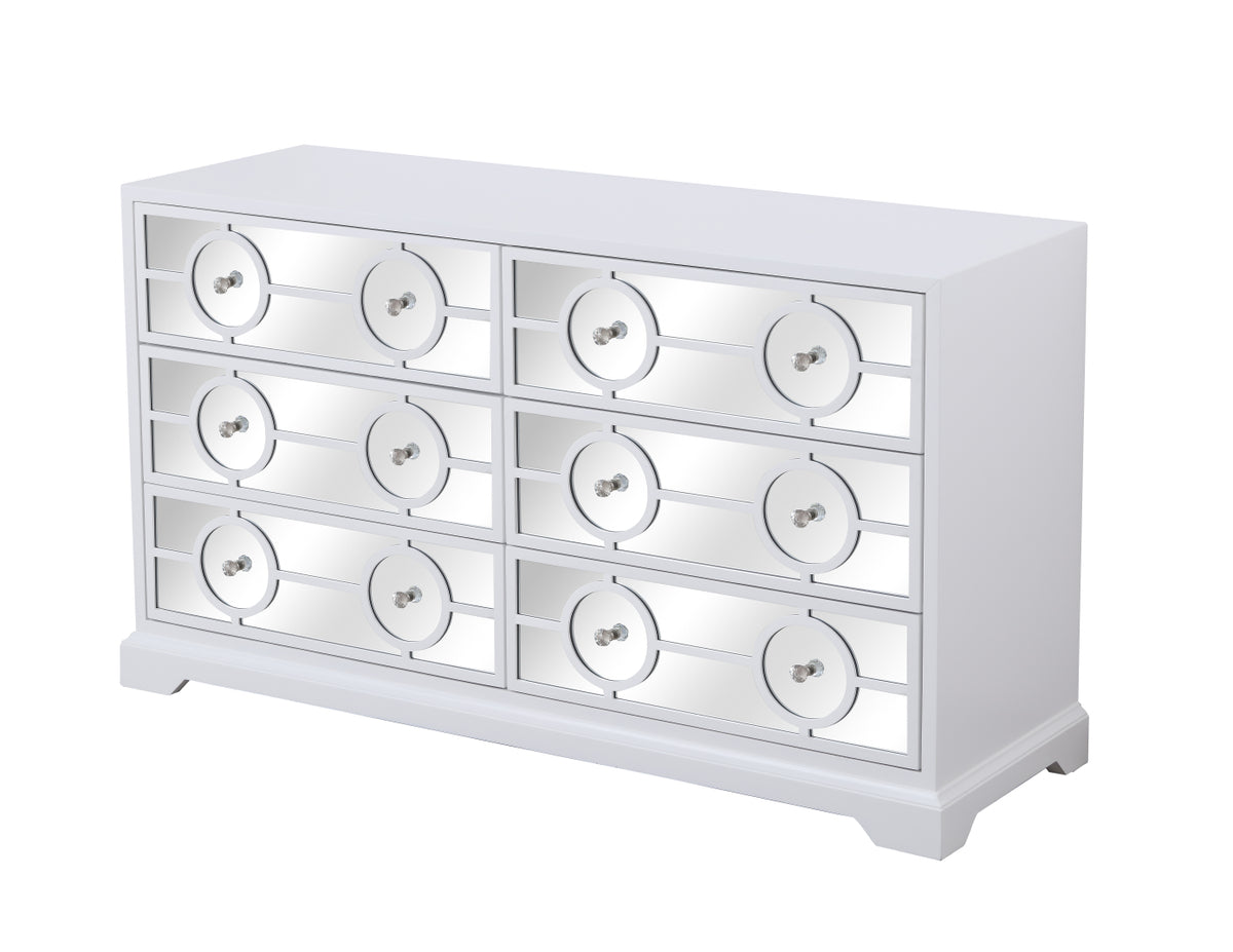Sophisticated with a reflective touch, this 60” wide transitional cabinet adds style and functionality to your room. Hand-painted in white with six deep drawers provide ample storage space, each decorated with 2 sparkling crystal knobs. Distinctively designed in beveled mirror with circle overlay.  This beautiful furniture enhances the ambience in your room.