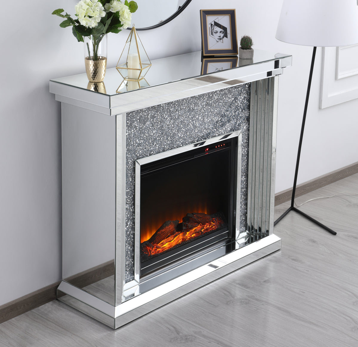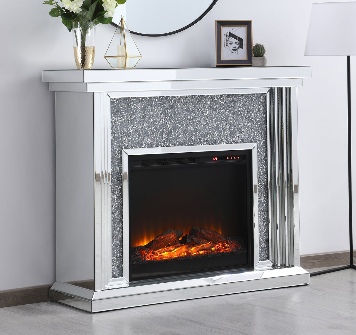47.5 in. Crystal mirrored mantle with wood log insert fireplace