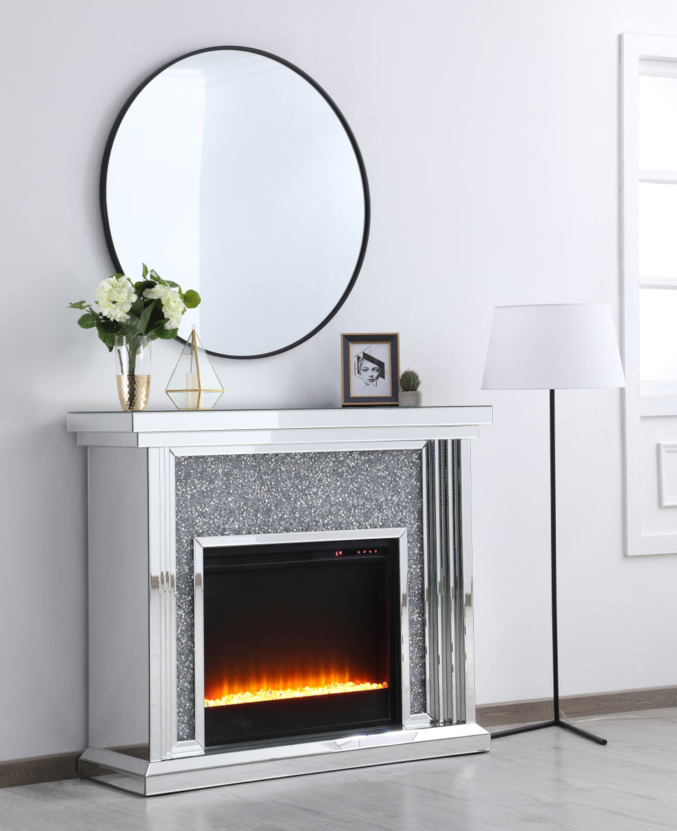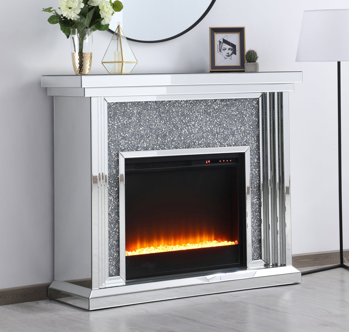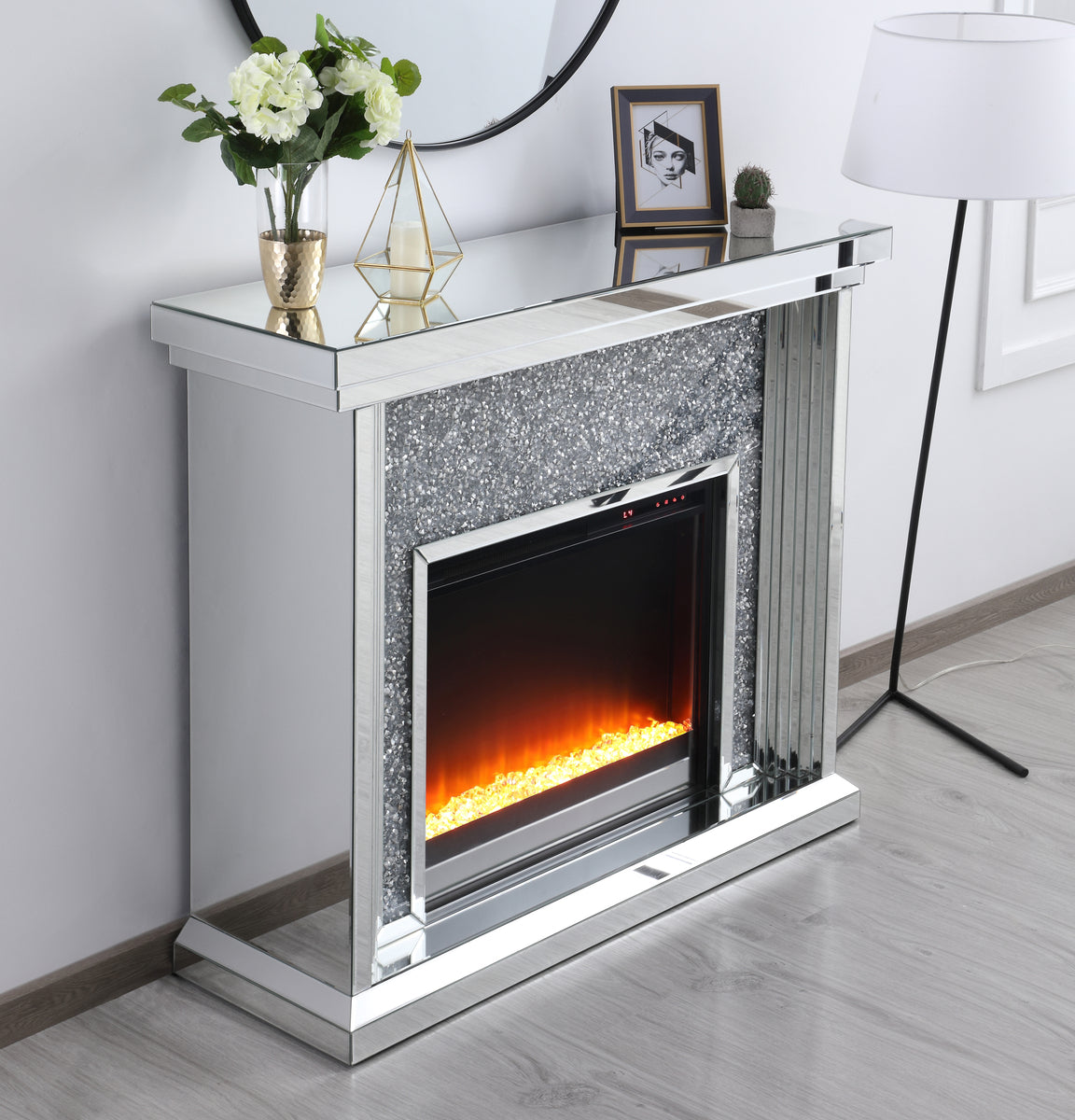 Dressed in a galaxy of dazzling silver crystals and accentuated with gleaming mirror panels, this fireplace is never one to shy away from the spotlight. Whether you are hosting a formal dinner party with associates or a casual get together with your loved ones, the comfort of the crackling fire in the crystal insert will put all your guests in a relaxed and merry mood. Show off your own personality by decorating the mantle with your treasures--family portraits, prized works of art, or fragrant flowers.