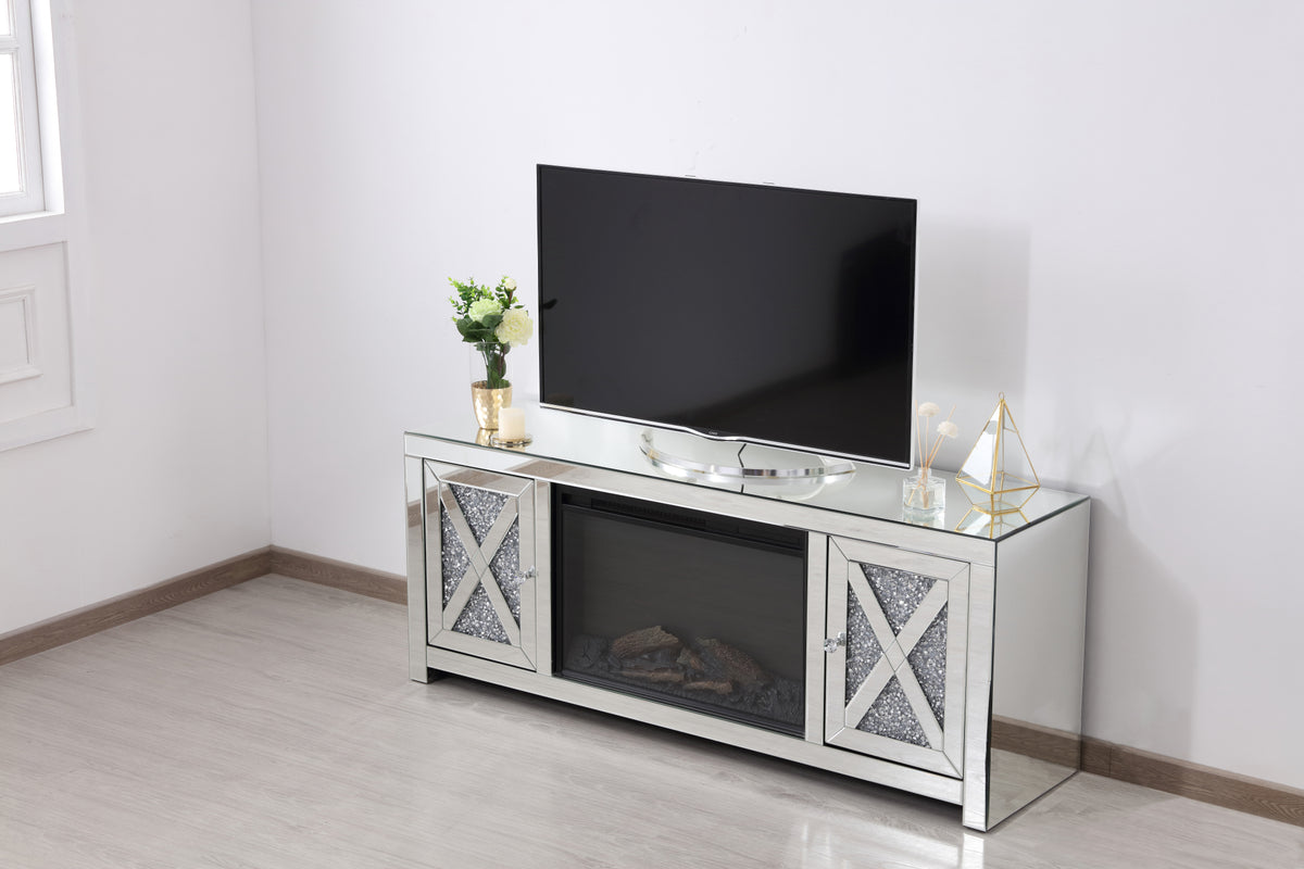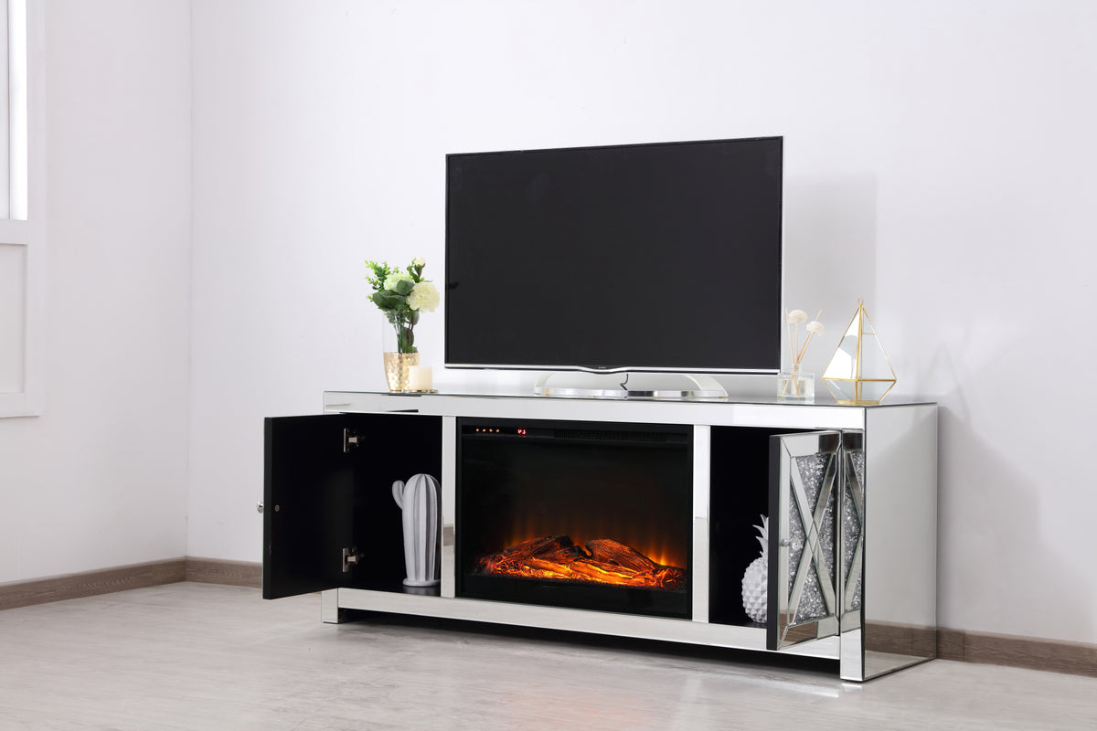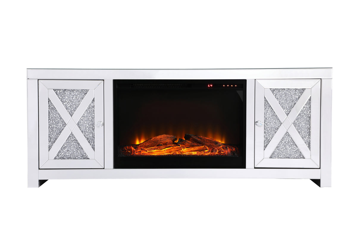 59 in. crystal mirrored TV stand with wood log insert fireplace