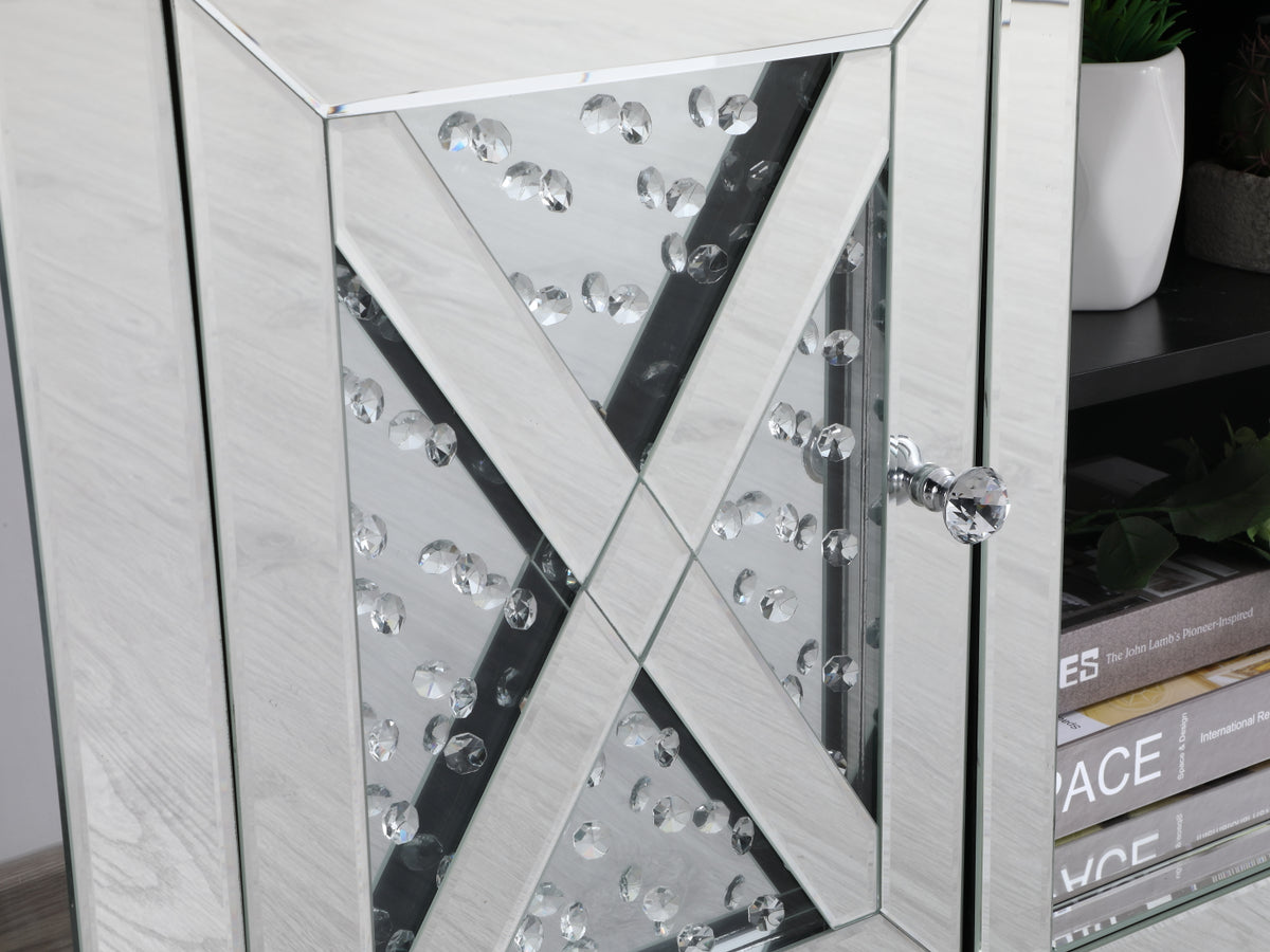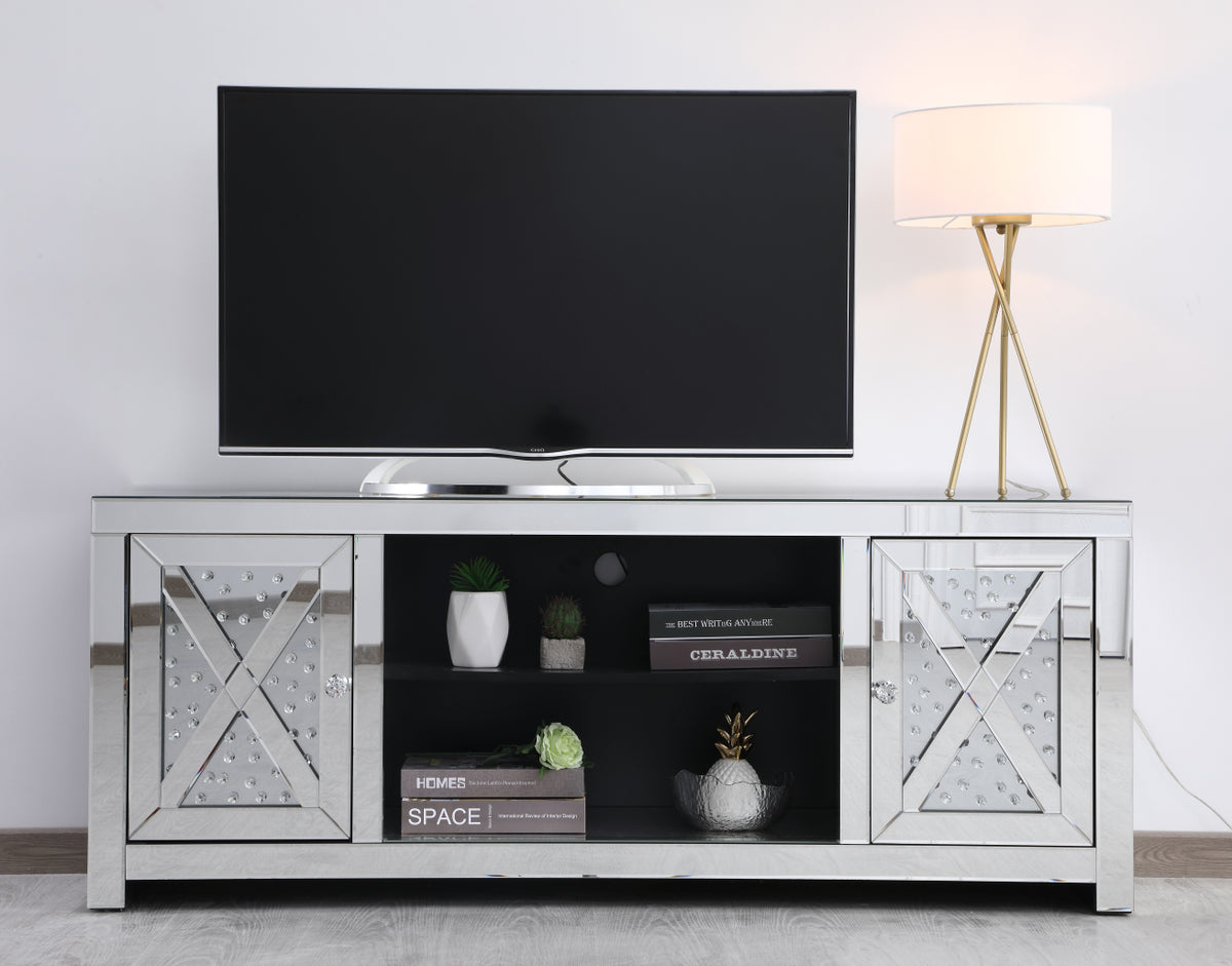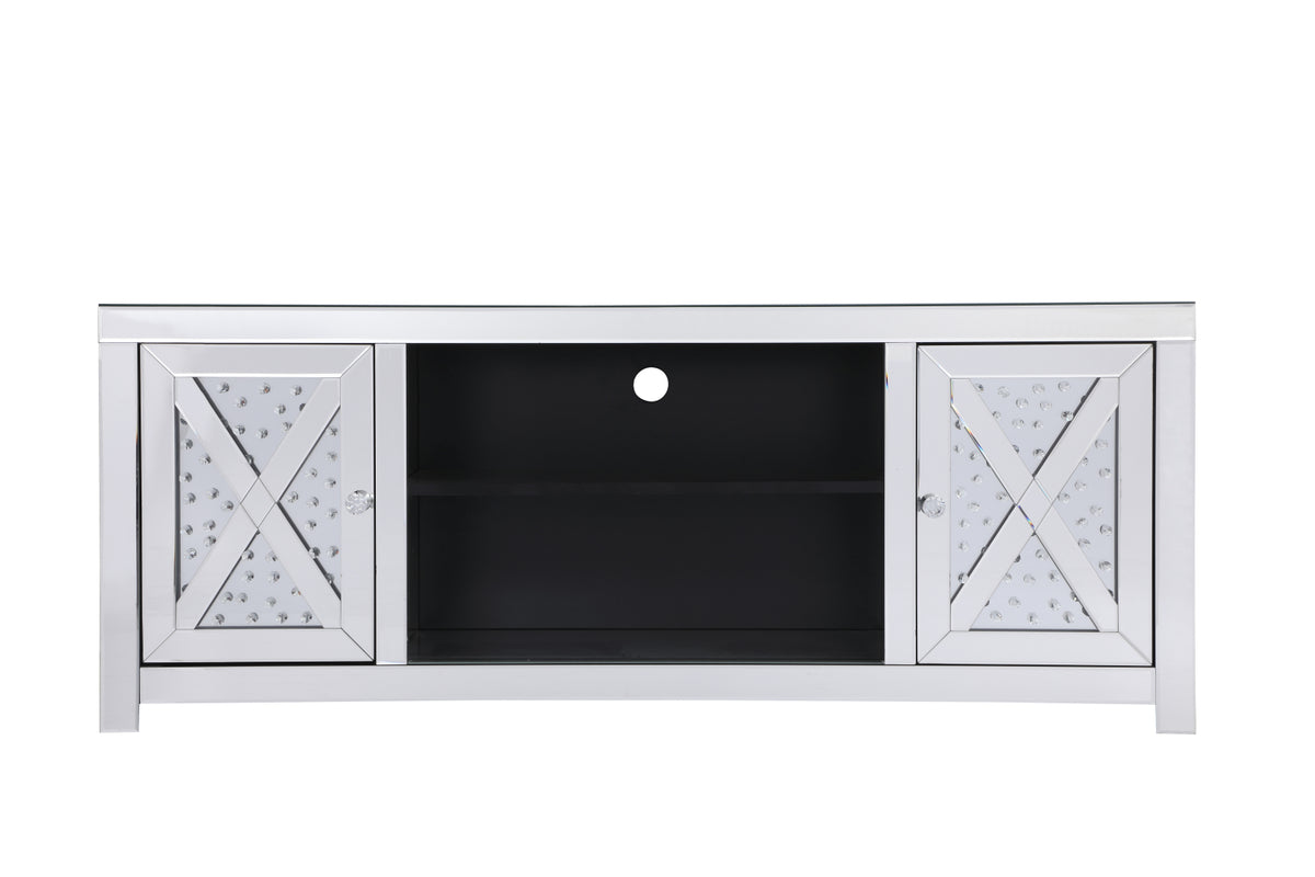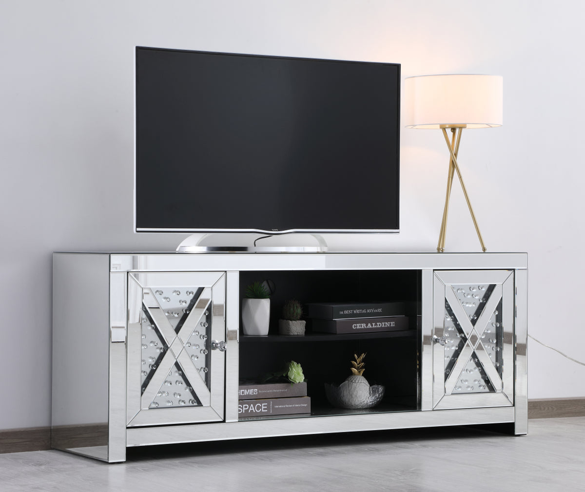 This mirror paneled tv stand is the perfect complement to your entertainment spaces. You can enjoy watching endless movies, host premier nights, or play video games until the stars are sparkling just as bright as the clear crystals that embellish the panels within the X-shaped details of the cabinet doors, which opens to reveal a storage area that is the perfect place to put away board games and various trinkets. Video game consoles and players can find a cozy spot in the middle storage area, or you can place books to read for when the tv is off. The perfect home for your tv, movies, and board games, this stand combines sparkling beauty with function.