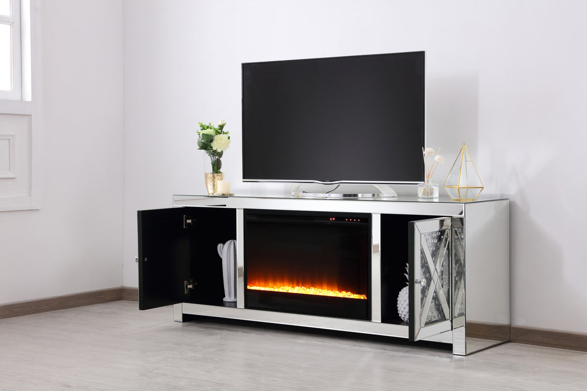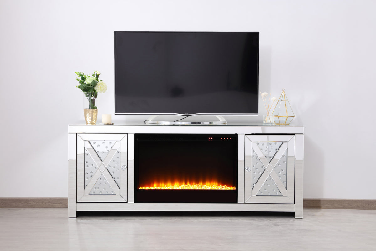 This mirror paneled tv stand fireplace combination is the perfect complement to your entertainment spaces. You can enjoy watching endless movies, host premier nights, or play video games until the stars are sparkling just as bright as the clear crystals that embellish the panels within the X-shaped details of the cabinet doors, which opens to reveal a storage area that is the perfect place to put away board games and various trinkets. Whether you are hosting a formal dinner party with associates or a casual get together with your loved ones, the comfort of the crackling fire in the crystal fireplace insert will put all your guests in a relaxed and merry mood. The perfect home for your tv, movies, and board games, this stand combines sparkling beauty with function.