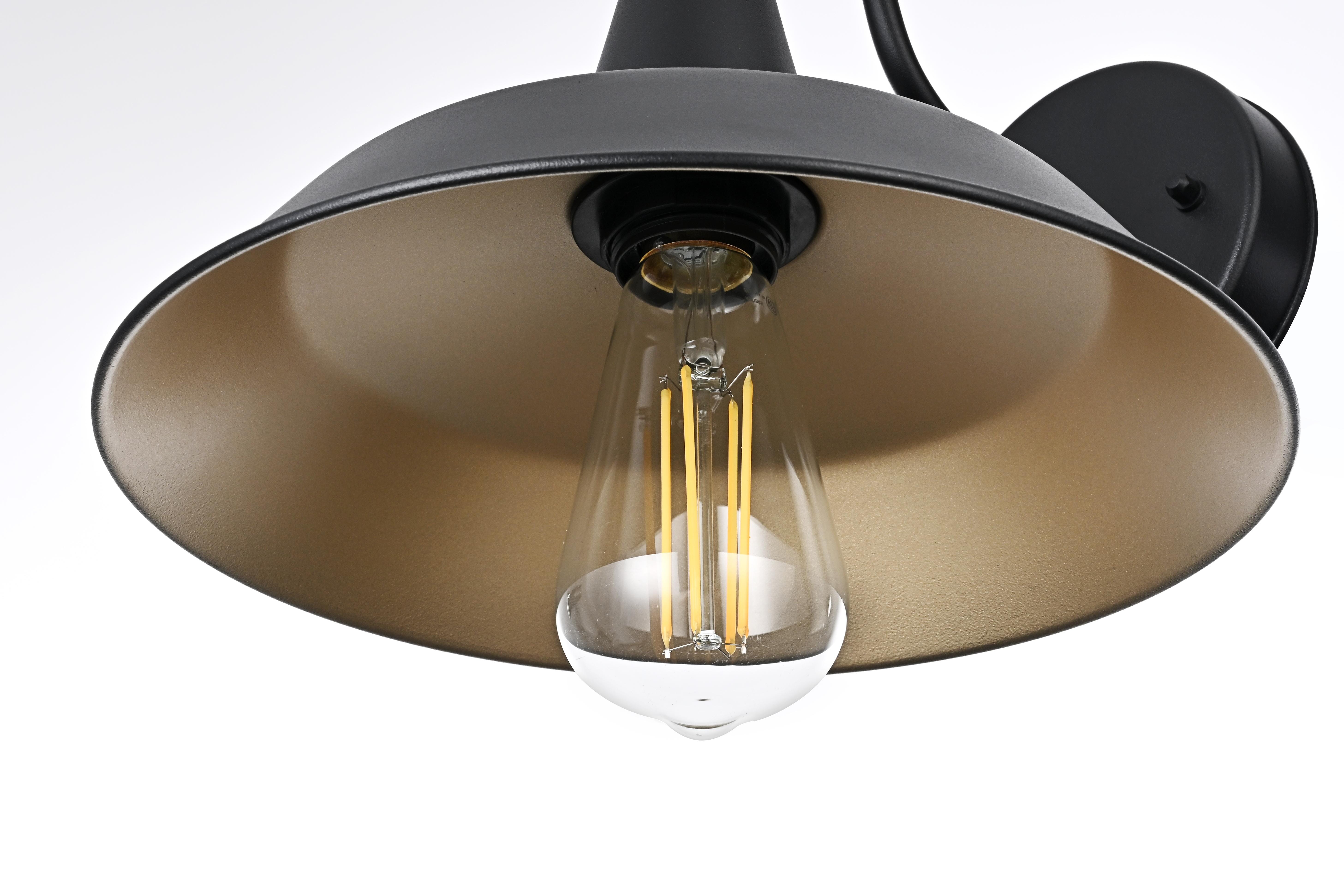 This outdoor wall light brings a timeless barn-style aesthetic to exterior spaces, featuring a flared metal shade, curved gooseneck arm, and contrasting black-and-gold finish. The wide metal shade directs light downward, while the gold interior enhances brightness with a warm, reflective glow. Built from sturdy iron, this fixture is ETL Wet Rated for durability in porches, patios, garages, and farmhouse exteriors. The compact 5-inch round backplate provides a secure mount, and the dimmable functionality allows for adjustable brightness when paired with a compatible dimmer. Designed for a medium-base E26 bulb (not included), this fixture blends practical lighting with industrial character, making it a strong and stylish addition to any outdoor space. Built with marine-grade, corrosion-resistant aluminum, this sconce withstands coastal conditions for long-lasting durability.