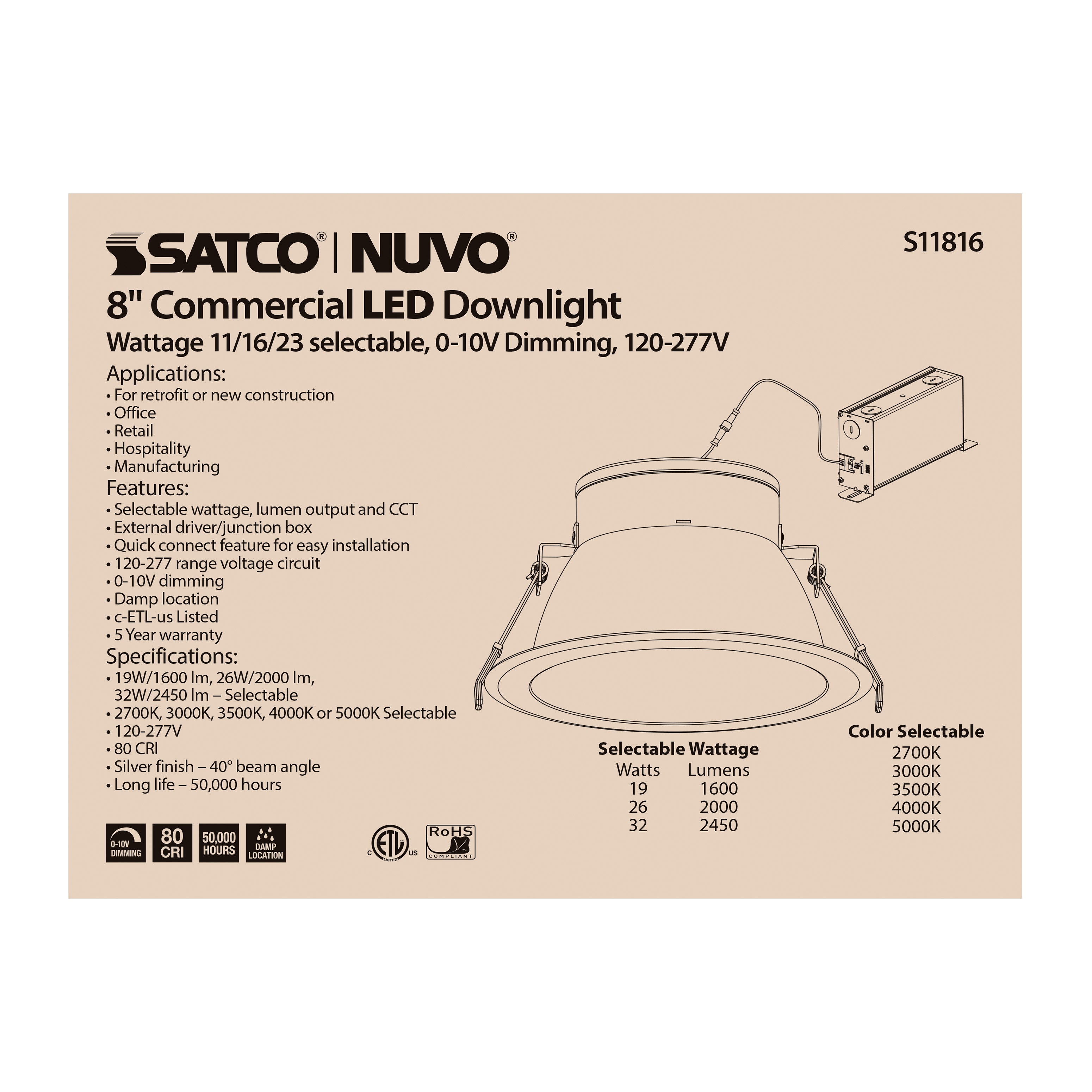 This a commercial LED downlight with Color Quick technology: Select among a range of watts, lumens, and color temperatures. An outboard LED driver/junction box allows for easy placement, even in the most challenging renovations. The downlight mounts securely into the mounting plates, sold separately, for new construction. The spring-loaded arms ensure a tight fit in both settings.