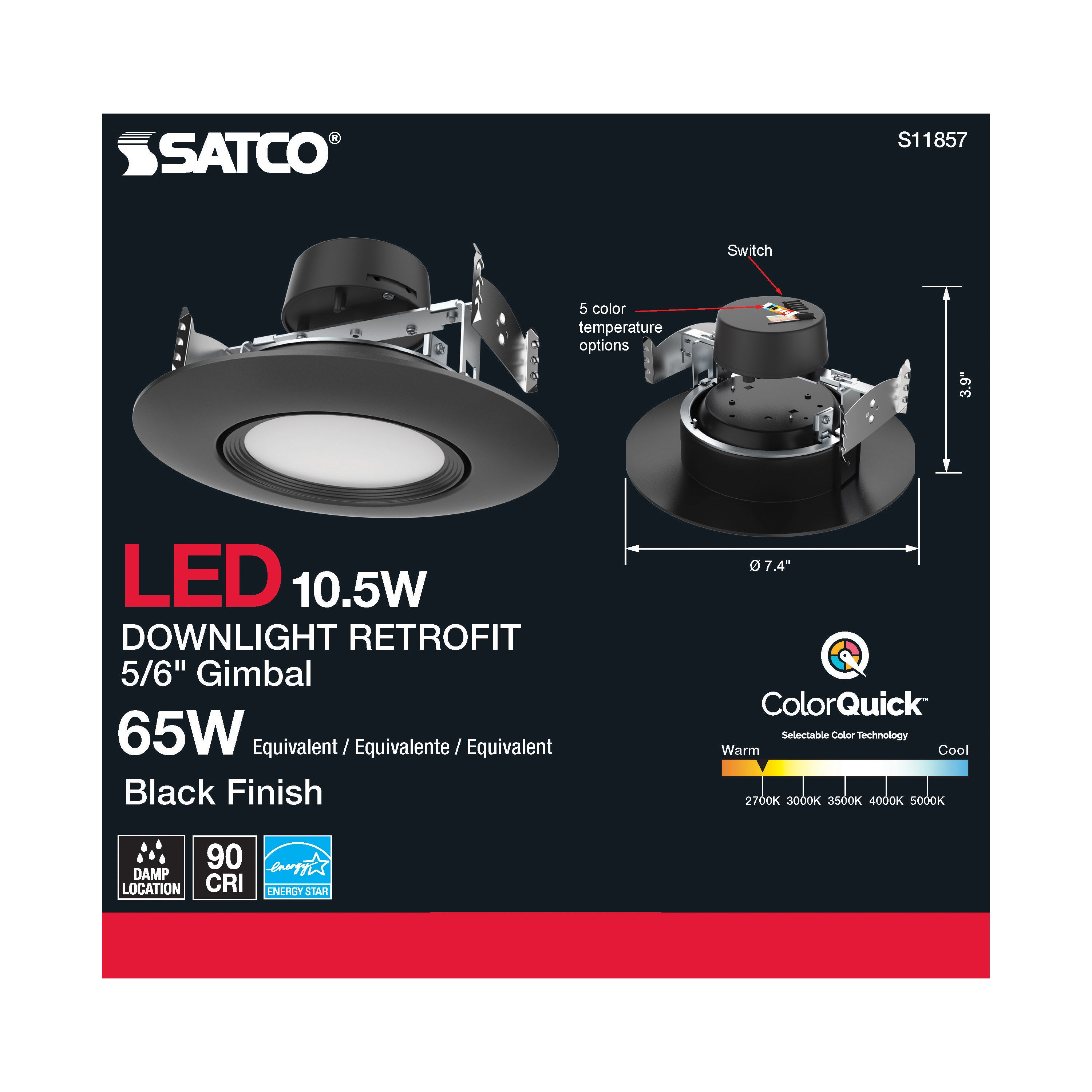 Satco's 10.5 watt gimbaled LED downlight is a sleek lighting solution for residential and commercial applications. Illuminate kitchens, dining rooms, and office spaces with this CCT selectable fixture. Versatile and functional, this black trimmed fixture delivers 50,000 hours of illumination.