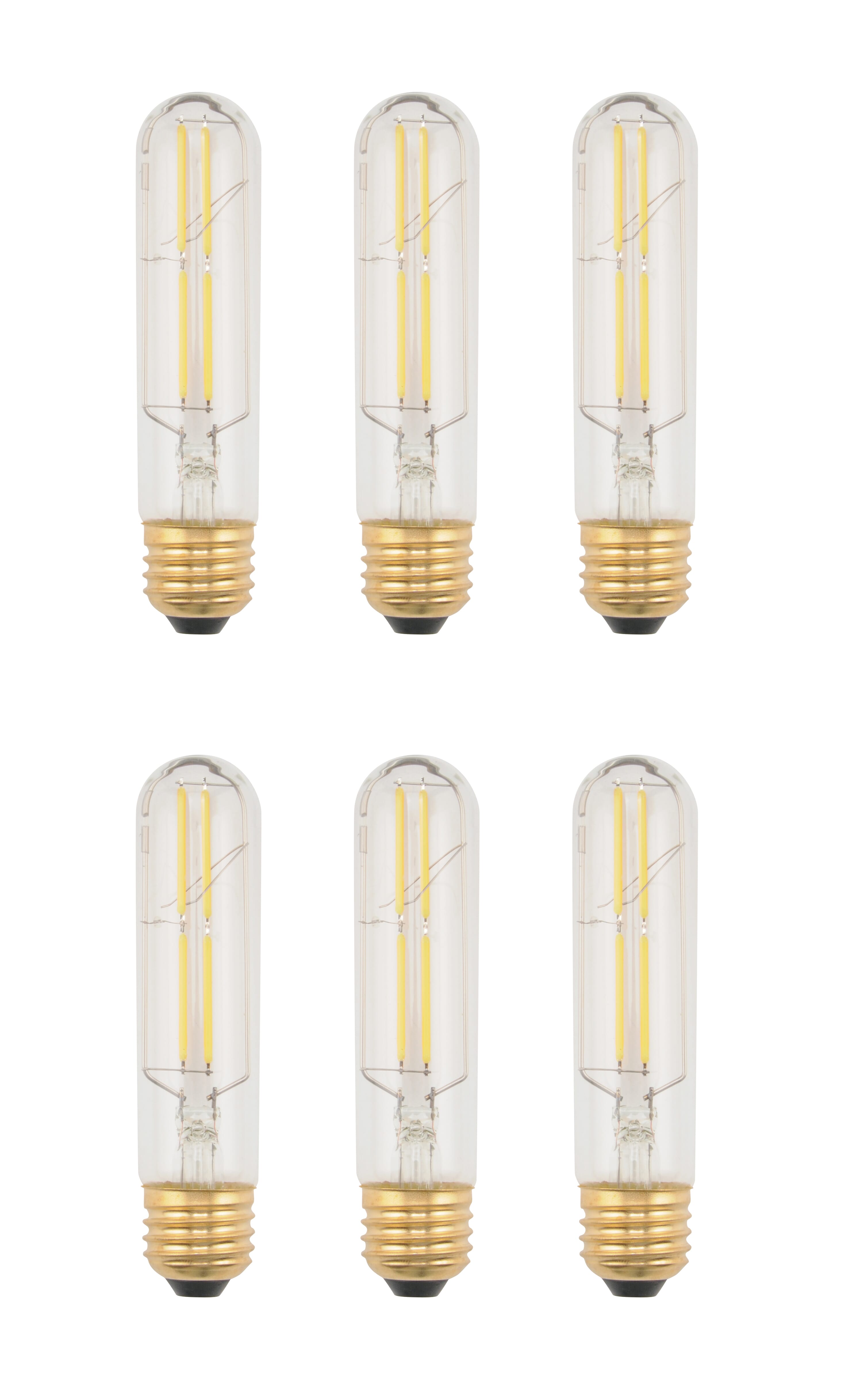 Upgrade your indoor lighting with this pack of six T10 LED filament-style bulbs that deliver a perfect mix of efficiency, style, and performance. With a sleek profile measuring just 1 inch wide by 5 inches high, these bulbs are designed to fit slim or decorative fixtures while adding a sophisticated touch. Each bulb produces 550 lumens of soft white light at a 3000K color temperature, creating a warm and inviting ambiance ideal for any room in your home. Boasting a wide 330-degree beam angle, these bulbs ensure uniform light distribution, while the greater than 80 CRI guarantees vibrant, true-to-life colors. Fully dimmable up to 90%, they let you effortlessly set the right mood for any occasion. Designed for energy efficiency at 92 lumens per watt, these 6-watt bulbs provide the perfect balance of performance and savings. Whether you're illuminating a reading nook, dining area, or decorative piece, these bulbs deliver exceptional light quality and style for your indoor spaces.